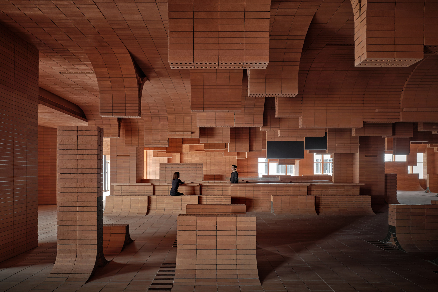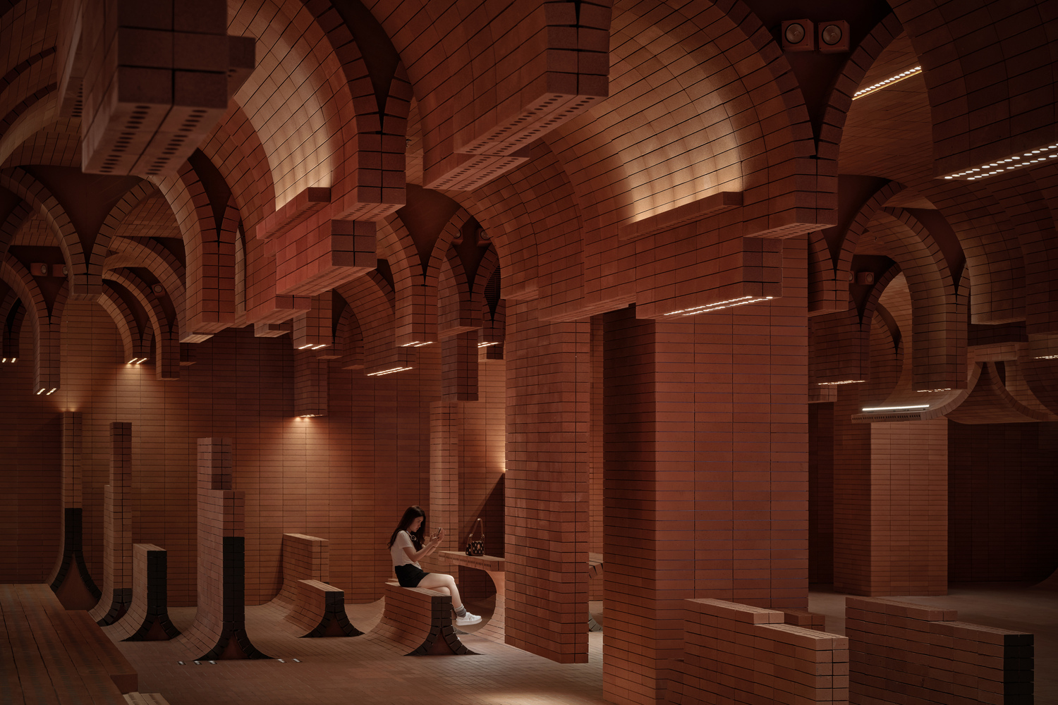 소재 및 질감: 벽돌은 해변 모래의 질감을 재현하며 공간에 따뜻함과 친근함을 부여합니다. 벽돌의 거친 질감과 따뜻한 색조는 공간을 편안하면서도 견고하게 느끼게 하여, 관객들에게 안정감과 친숙함을 제공합니다. 벽돌이라는 소재는 하이난섬의 해변 모래를 상징함과 동시에 지속 가능한 건축 소재로서의 장점을 지니고 있습니다.