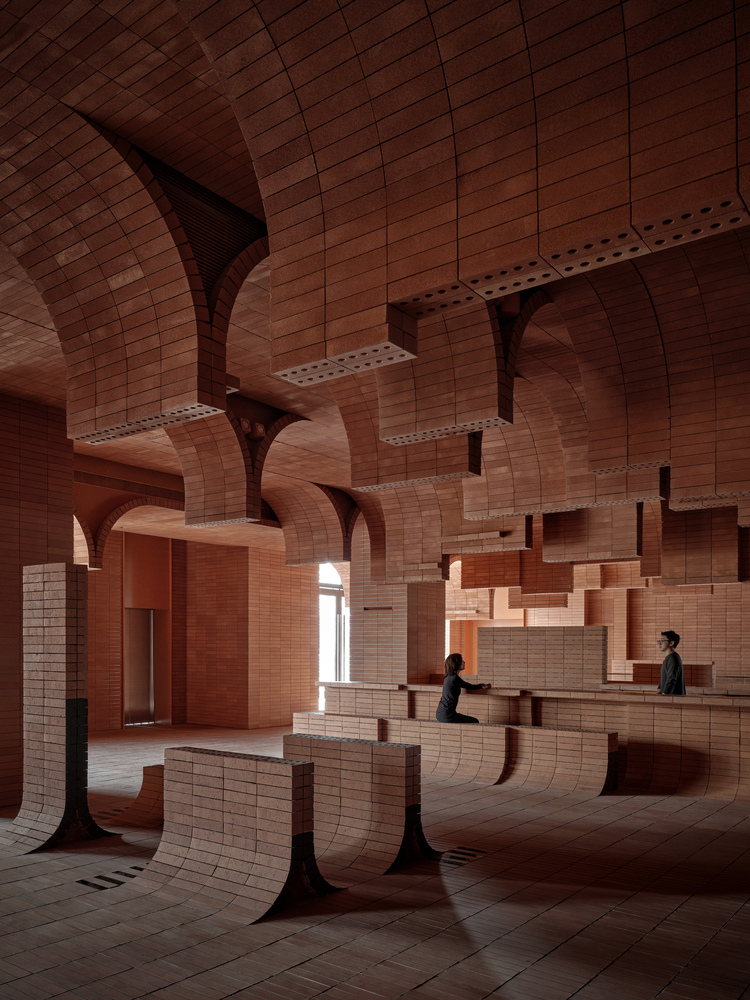 구성 및 배치: 영화관의 주요 구성 요소는 파도의 유동성을 연상시키도록 곡선형 벽돌로 배치되었습니다. 천장과 벽이 자연스럽게 이어지며 공간의 경계가 흐려져, 개방적이면서도 연결된 느낌을 제공합니다. 비대칭적 곡선 구조는 유려한 흐름을 형성하며, 각 공간의 시각적 경계를 넘어서는 넓은 시야를 제공합니다. 영화관 내부로 풍부한 자연광이 유입되도록 설계되어 시간에 따라 변화하는 분위기를 만들어냅니다. 이 자연광은 벽돌의 색감을 변화시키며 다채로운 분위기를 연출합니다.