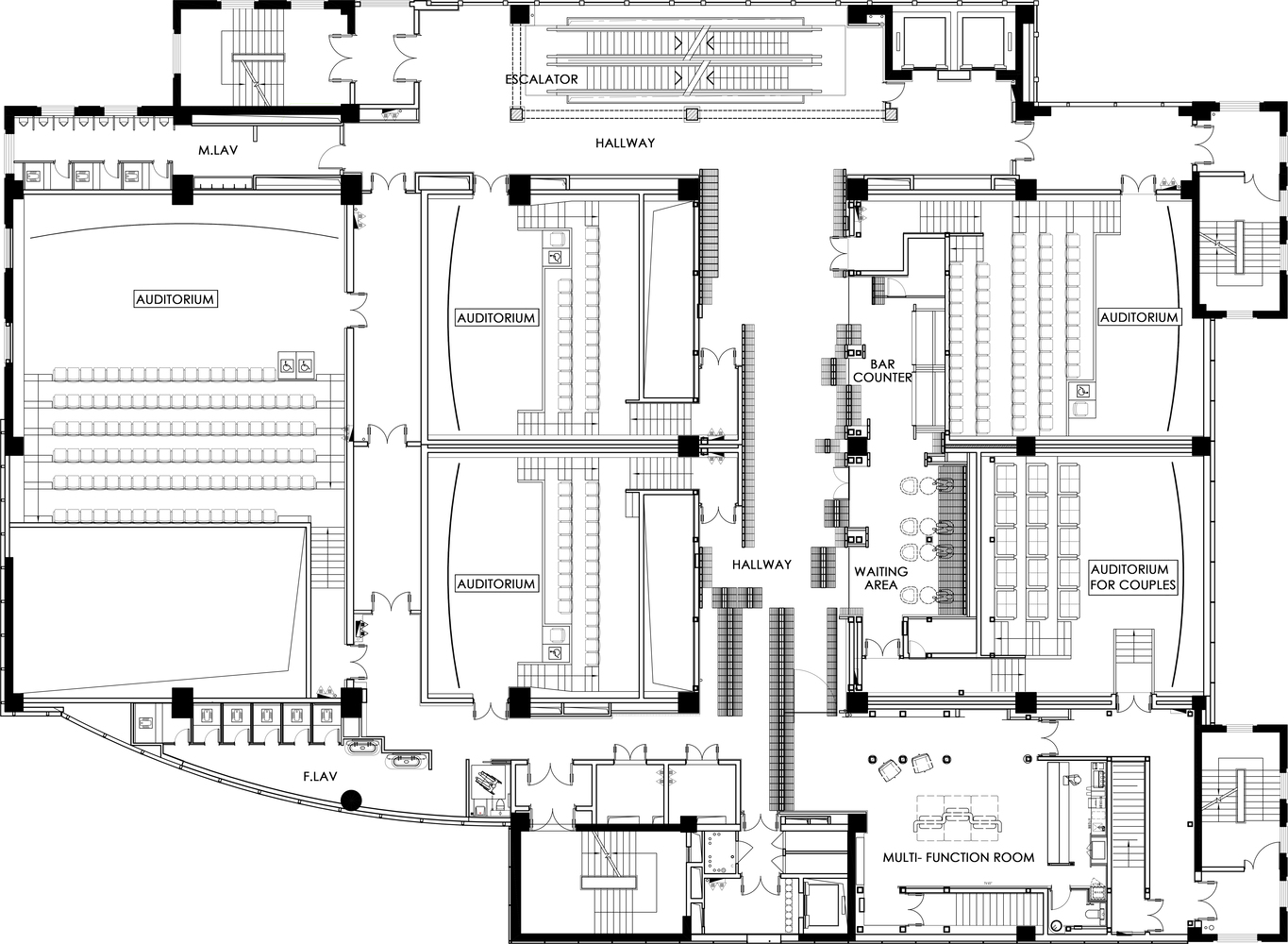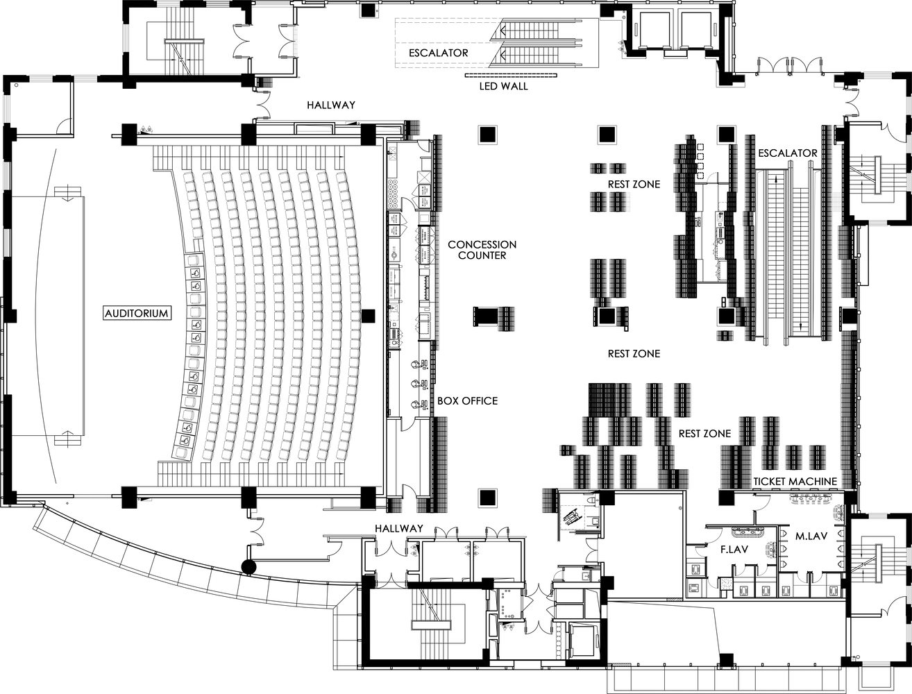 기능과 사용성: 공기 배출구와 간접 조명은 사용자의 경험을 방해하지 않도록 숨겨져 있으며, 영화 관람 외에도 다양한 사회적 활동이 가능하도록 설계된 이 공간은 커뮤니티 허브로서의 역할을 수행합니다. 이로 인해 영화관은 단순한 관람 공간을 넘어 지역 사회와 연결된 다목적 공간으로 기능합니다.