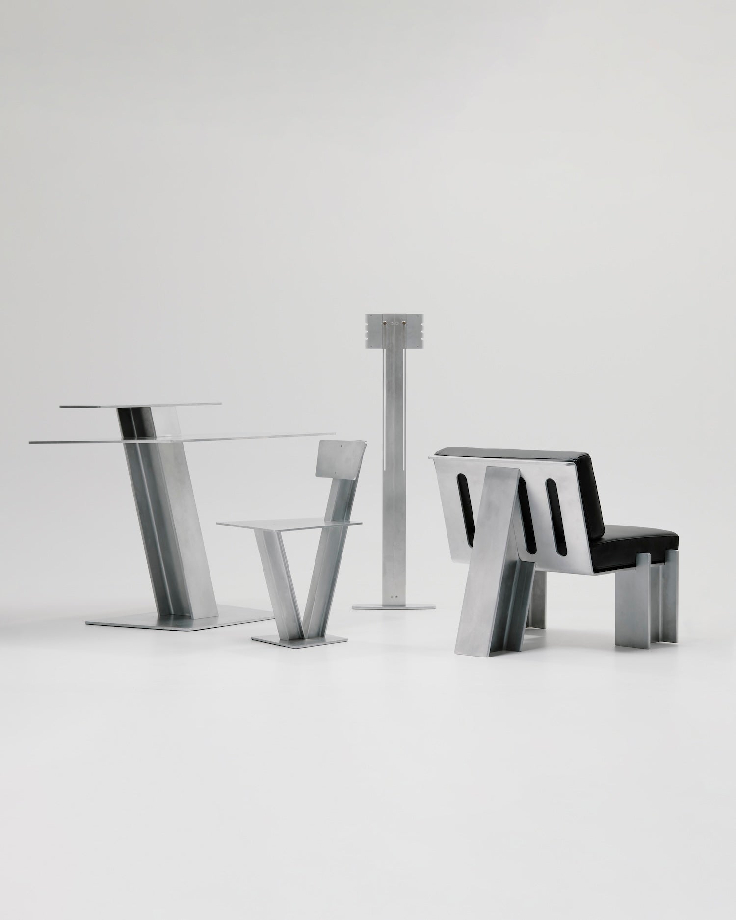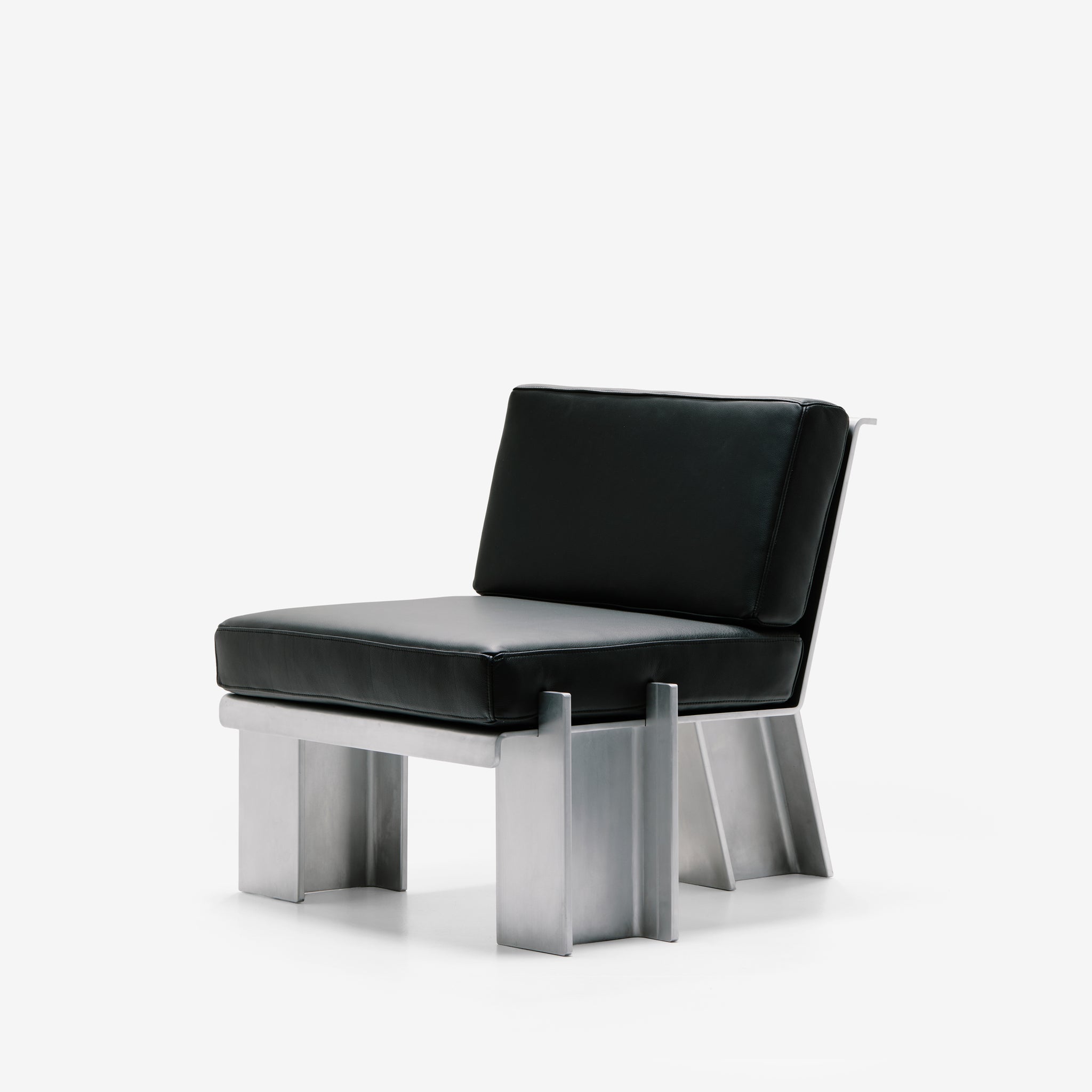 Beams is inspired by the use of structural supports in architectural buildings, further contextualized within the structures they inhabit. The Beam Chair features precisely angled I beams and laser cut aluminum sheets. The surface is treated with a waxed finish, balancing a sense of rigid industrialism with utility. Edition of 10.
