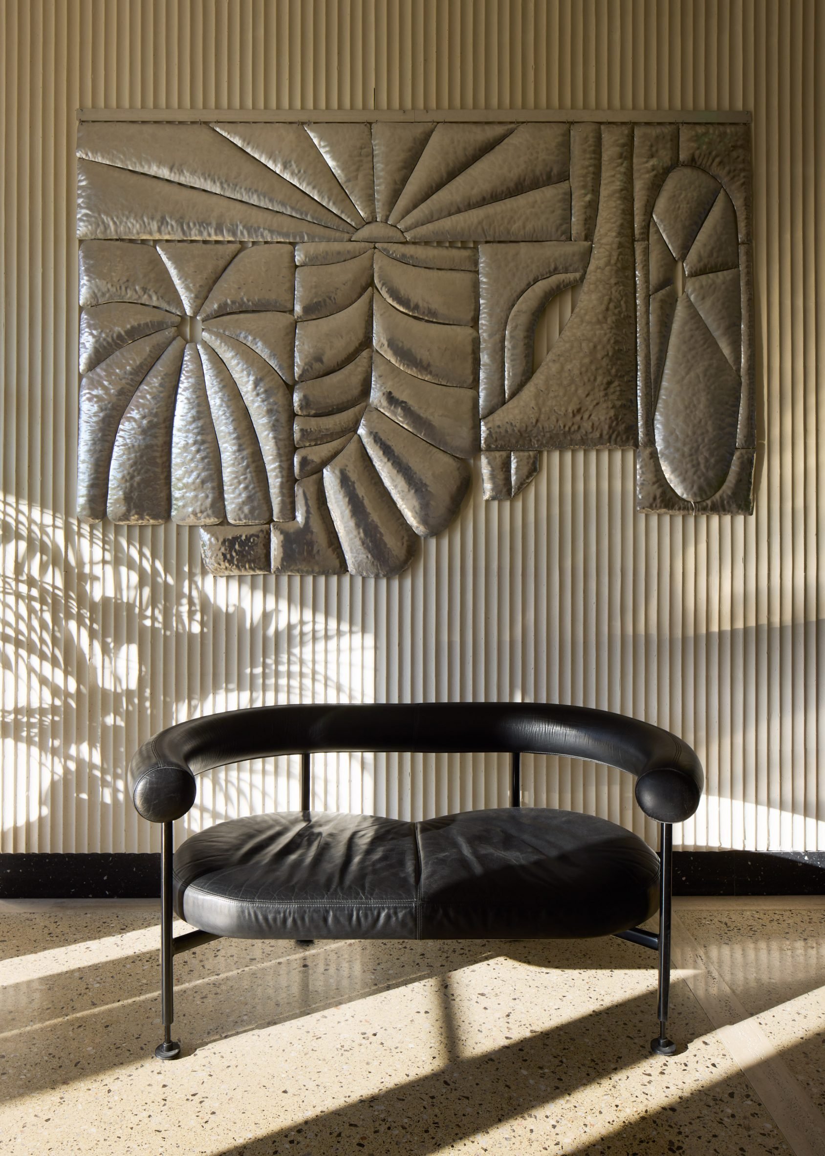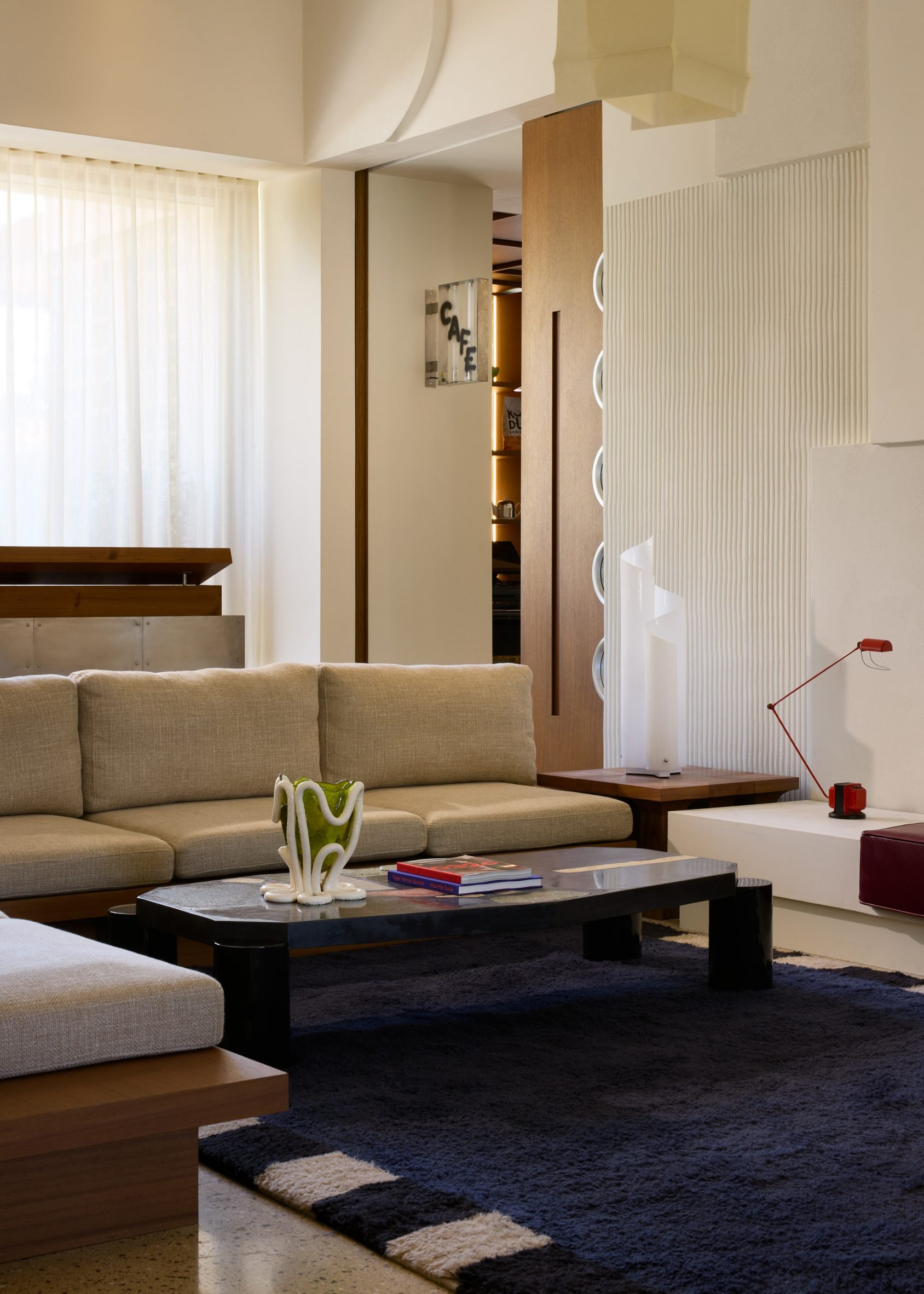 To create a sense of continuity between the interior and exterior, the studio used a sandy toned terrazzo in different finishes, structured by steps and travertine lines, for the flooring that extends onto the terrace.