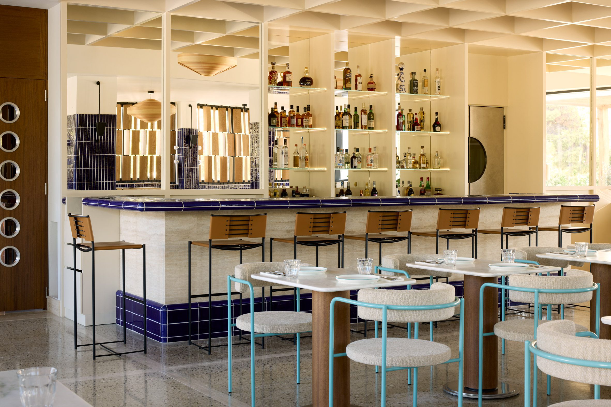 내부 디자인: 샌디 톤의 테라조 바닥과 트래버틴 라인을 통해 실내외 공간의 연속성을 강조하였습니다. Sebastian 레스토랑에는 딥블루 세라믹 타일을 사용하여 시각적 포인트를 제공하며, 예술 작품과 조화를 이루어 공간의 깊이를 더합니다.