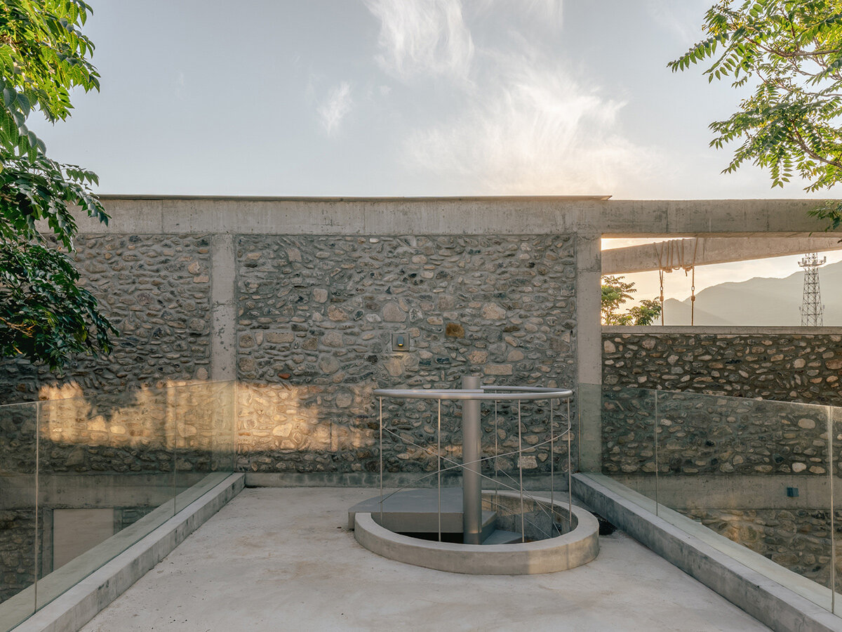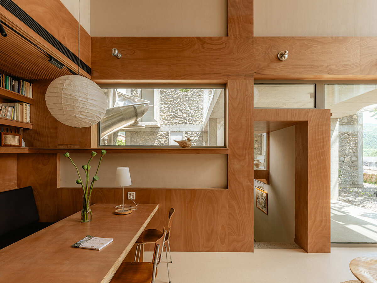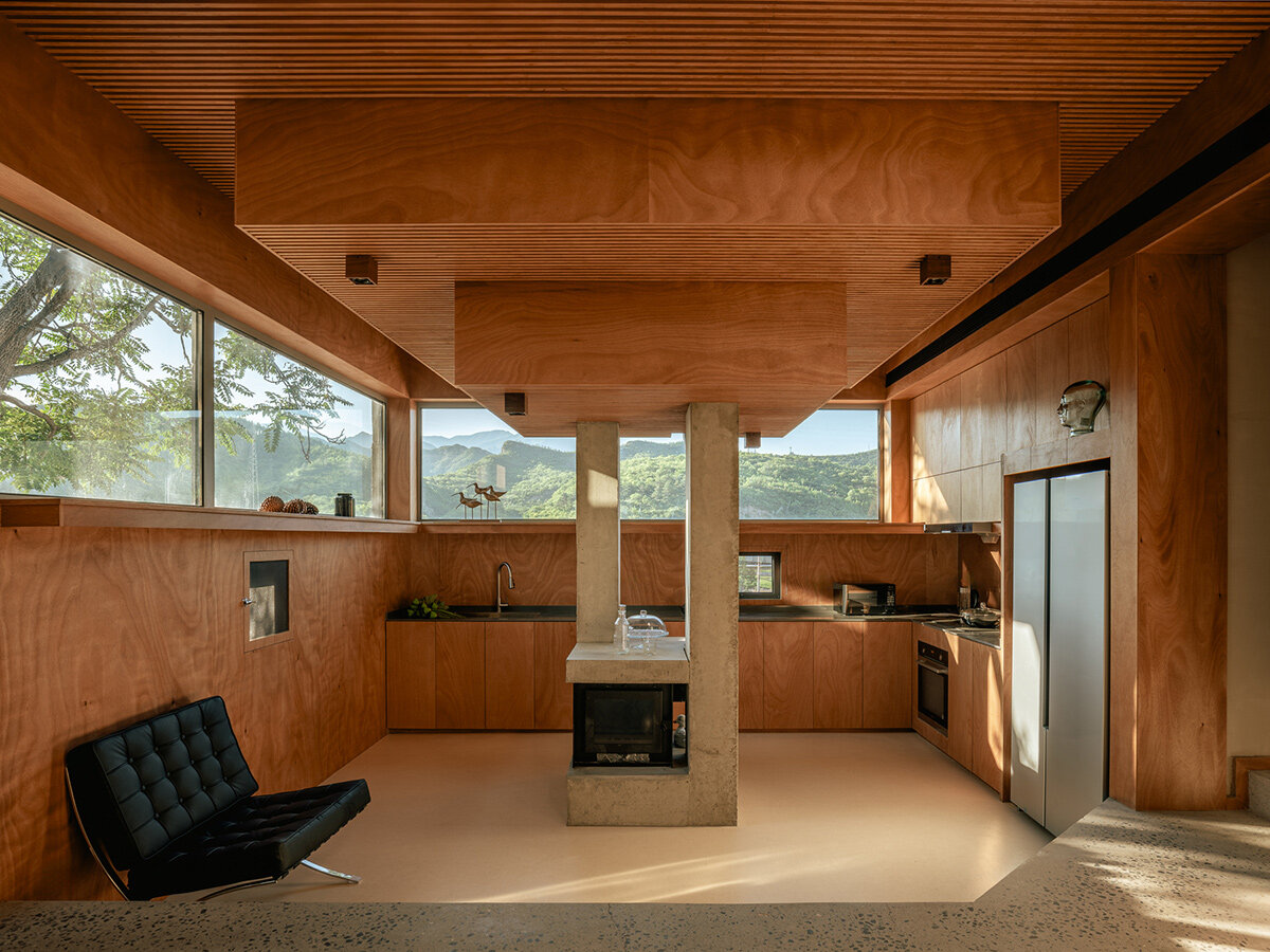 Externally, House of Bluff features an exposed concrete frame filled with stone, creating a rugged and durable facade. Inside, the walls are finished with warm-toned stucco plaster, with the structural frames covered in wood paneling. This combination of materials — concrete and wood — creates a deliberate contrast that reflects the duality of the structure and its maintenance systems. The juxtaposition of these elements enriches the architectural narrative, making House of Bluff a bold yet thoughtful intervention in its once-neglected surroundings.