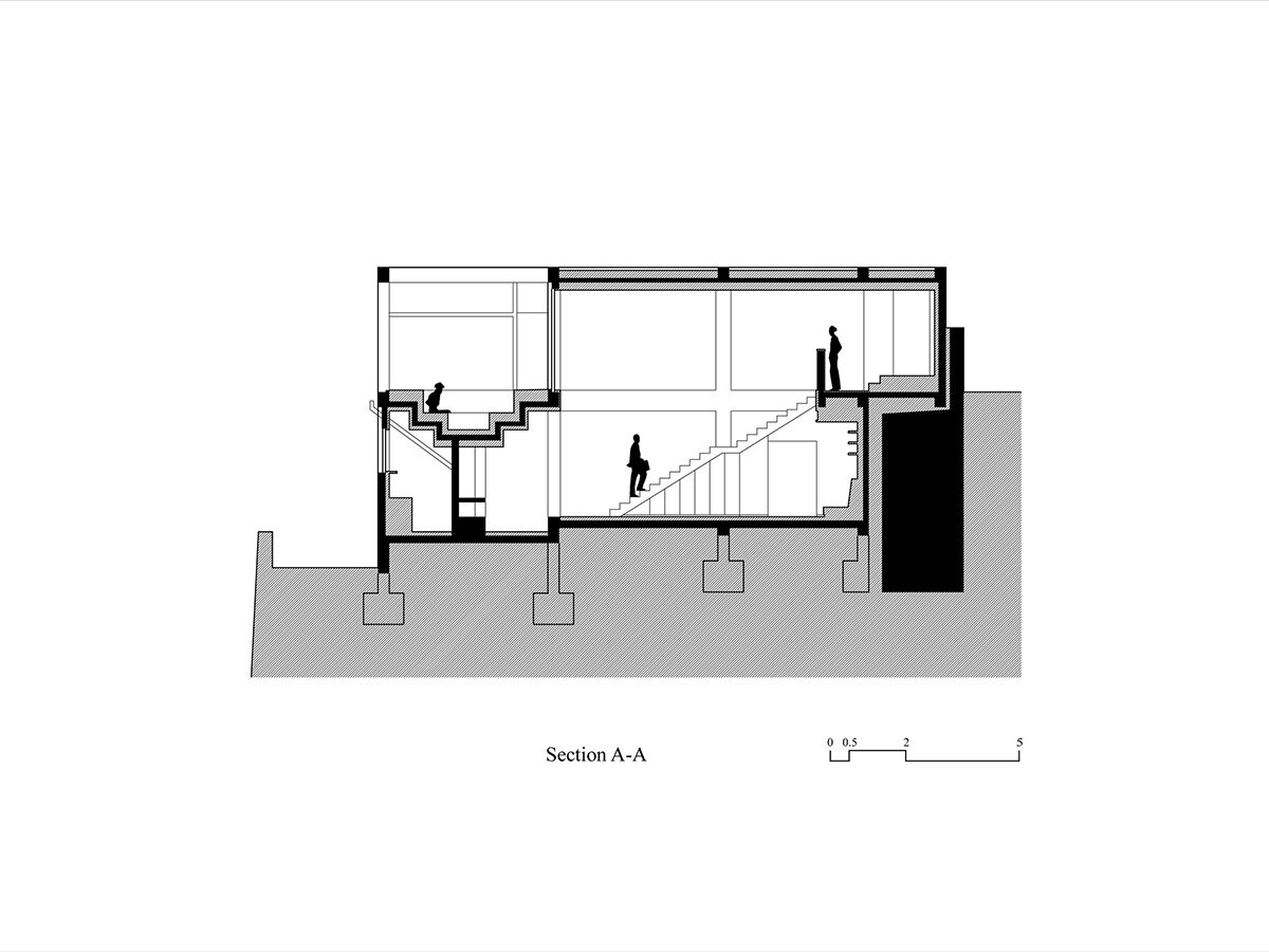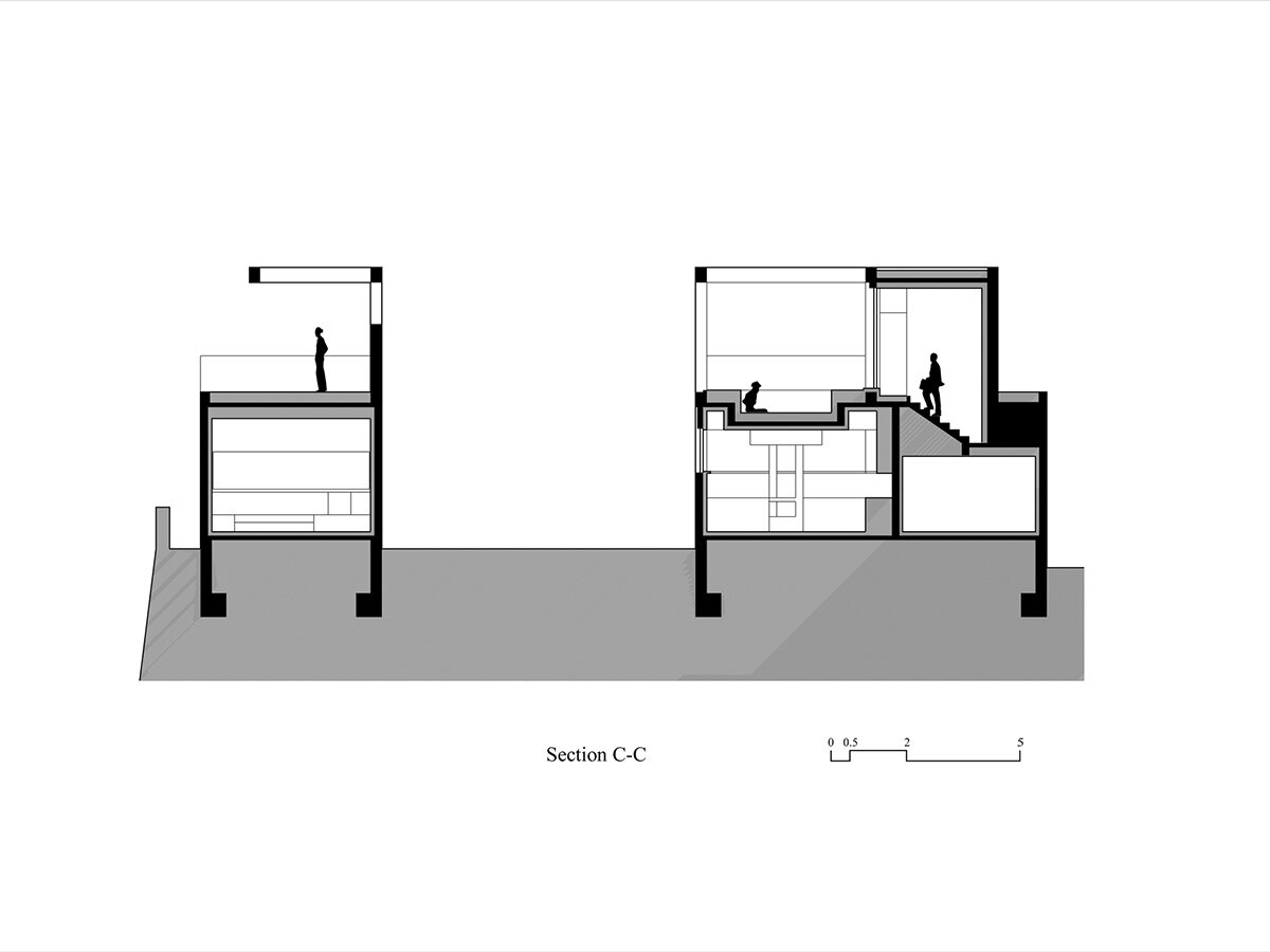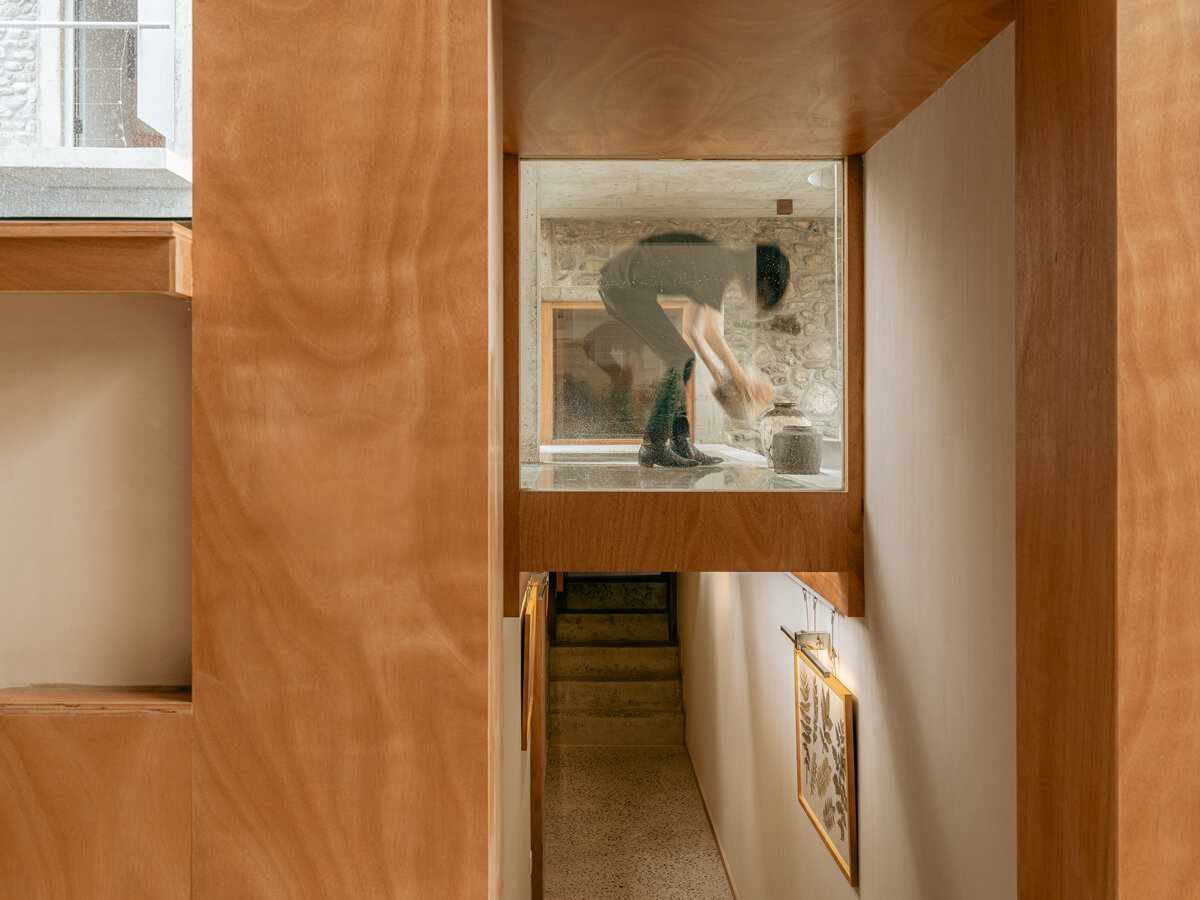 Externally, House of Bluff features an exposed concrete frame filled with stone, creating a rugged and durable facade. Inside, the walls are finished with warm-toned stucco plaster, with the structural frames covered in wood paneling. This combination of materials — concrete and wood — creates a deliberate contrast that reflects the duality of the structure and its maintenance systems. The juxtaposition of these elements enriches the architectural narrative, making House of Bluff a bold yet thoughtful intervention in its once-neglected surroundings.