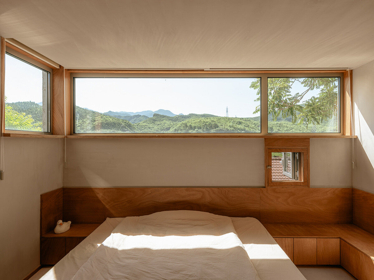 The main entrance of House of Bluff is situated at a higher elevation in the northwest corner of the site, leading visitors to descend a staircase into the ground-floor living space. The interior layout is organized from south to north, with the kitchen, living room, and dining room flowing together in an open plan. One of the home’s unique features is a sunken outdoor bathtub, located directly to the south of the entrance and positioned beneath an exposed concrete frame. The bath, supported by folding beams and vertical columns, sits above the ground-floor kitchen and its central fireplace, creating a dramatic visual effect that nearly led the architects to name the project ‘House of Hotpot.’