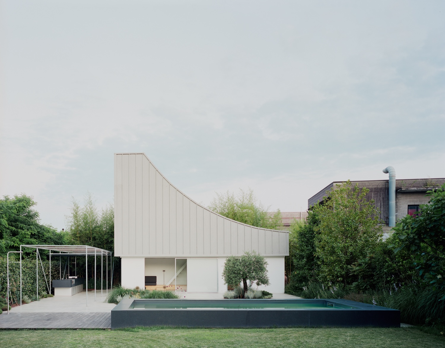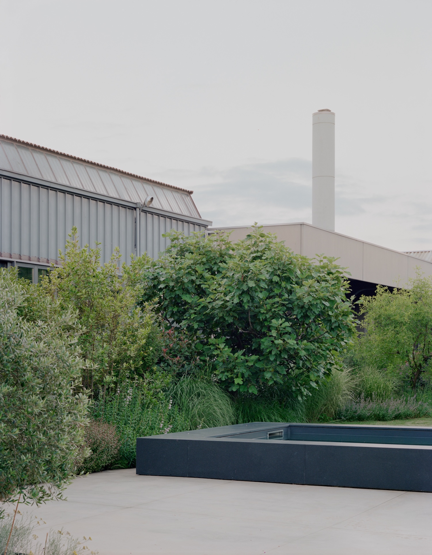 The neutral material palette, coupled with abundant natural light, emphasizes simplicity and authenticity. Adjacent to the plateau, a steel pergola in galvanized tubular profiles spans five sections, offering space for dining and lounging. A custom kitchen counter of stone and sheet metal occupies two spans, sheltered by a lightweight corrugated roof. Finally, a monolithic swimming pool in anthracite stone, partially sunken into the ground, extends from the concrete surface, forming a visual and functional boundary for the outdoor space.