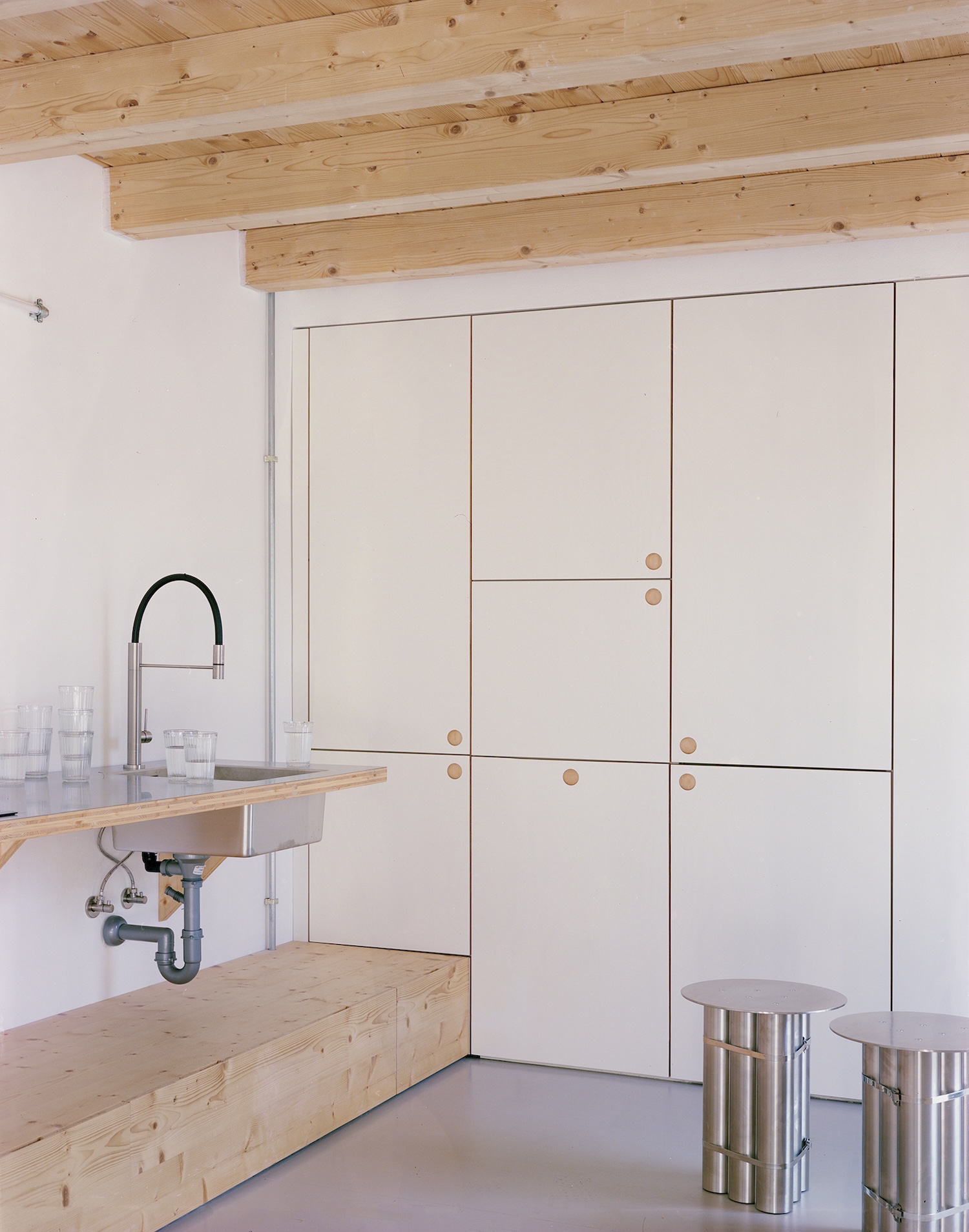 Its sliding doors dissolve boundaries between interior and exterior, creating a continuous flow with the outdoor environment. Inside, functional elements like a bathroom and mini kitchen provide utility for both indoor and outdoor activities, making the cabin a central activation point for the property’s open spaces. The cabin’s verticality is optimized through two mezzanines, connected by metal stairs. A wooden intermediate slab serves as a sleeping area, while a pre-existing concrete level offers an intimate, light filled retreat near a roof window, enhancing the building’s contemplative atmosphere.