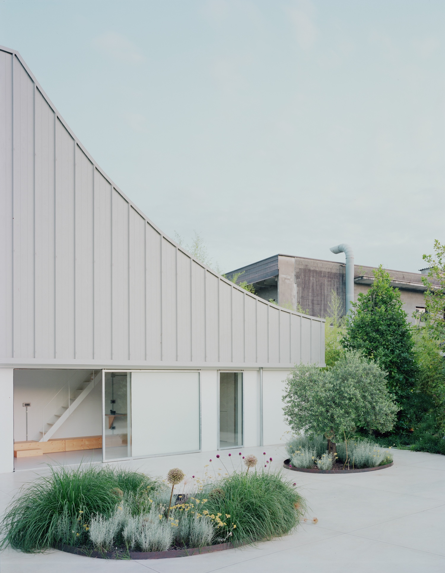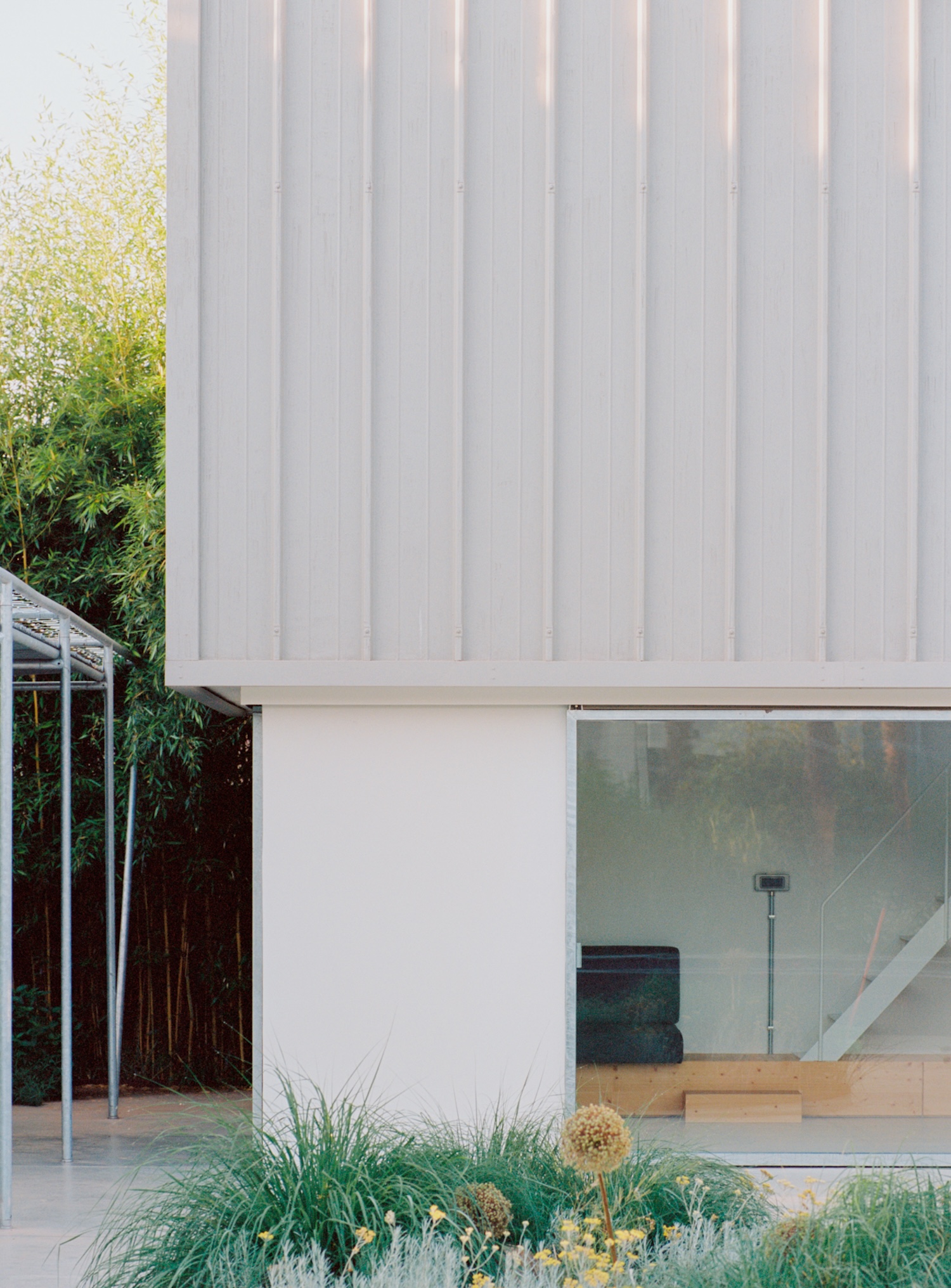 금속 패널, 목재, 아연 도금 철강 등의 소재가 각기 다른 질감과 색조를 제공하여 공간에 깊이감을 더합니다. 금속은 차가운 질감을, 목재는 따뜻한 느낌을 전달하며, 중성적 색조를 통해 전체적인 조화가 돋보입니다. 퍼골라와 주방 카운터는 자연 재료와 금속이 조화를 이루며 기능성을 높입니다.