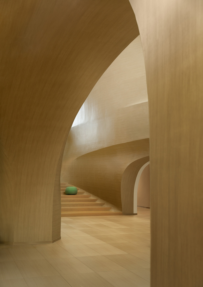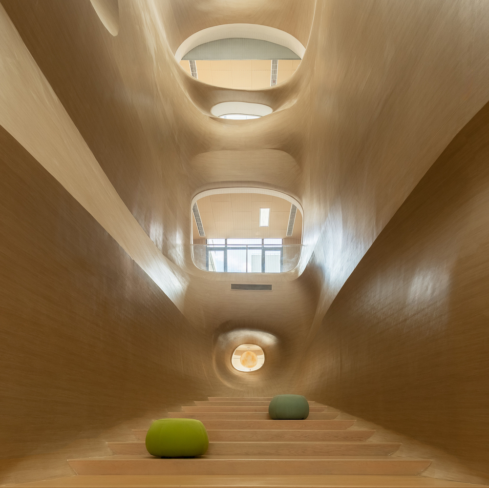 The sun filled atrium, with its curved surface encircling the children, is the space's center and the starting point for exploration. The texture and shape of the atrium are designed in a smoothly curved combination so that it feels like being in a valley. The friendly and warm wooden texture allows every child to touch it at will. Caves in different sizes and shapes are the outposts for discovering fun things. The corridors connecting the atrium and the functional rooms while the staircase windows look at each other, creating more surprises for the children to play around with, also serve as the buffer and linking layer in the space, just like "branches" according to "Big Tree".