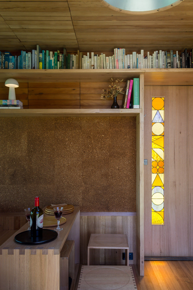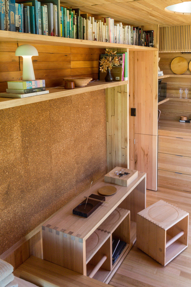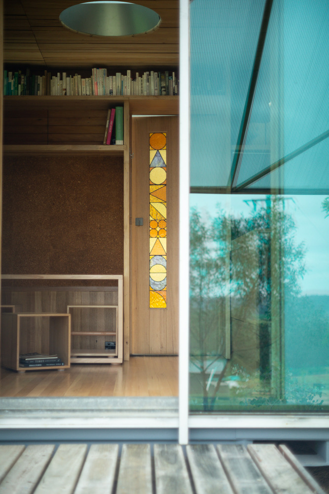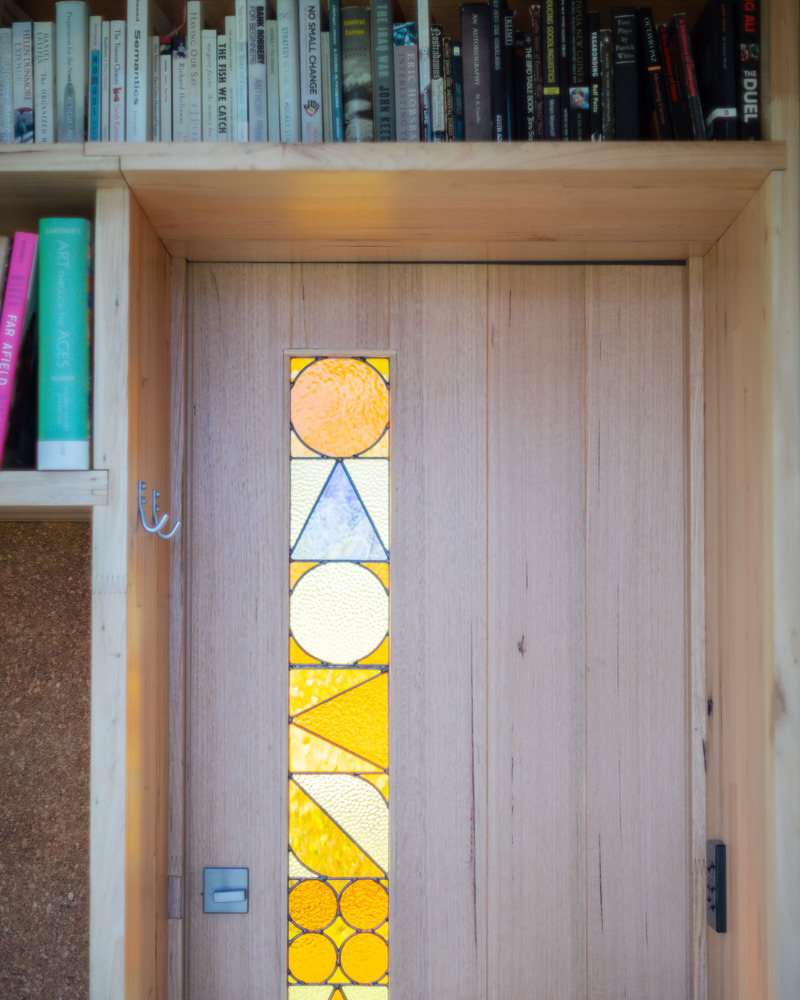 Green Studio acts as the Architect and the Master craftsman, fashioning and assembling an array of gathered materials in a holistic manner, as opposed to a systematic specification process. A solid timber front door custom-made to house a dynamic lead light window crafted by Hygge Glass, its design hinting to the warmth beyond with themes of the surrounding landscape. Stepping inside, reclaimed Victorian Ash Glulam beams interlock to form an entry nook and extensive library shelving. Tactile and acoustic cork wall tiles define an intimate sitting area and bedroom section.