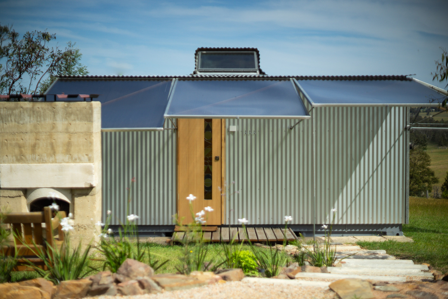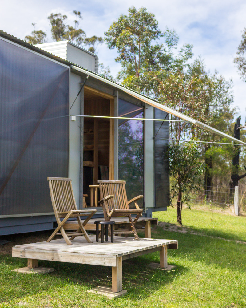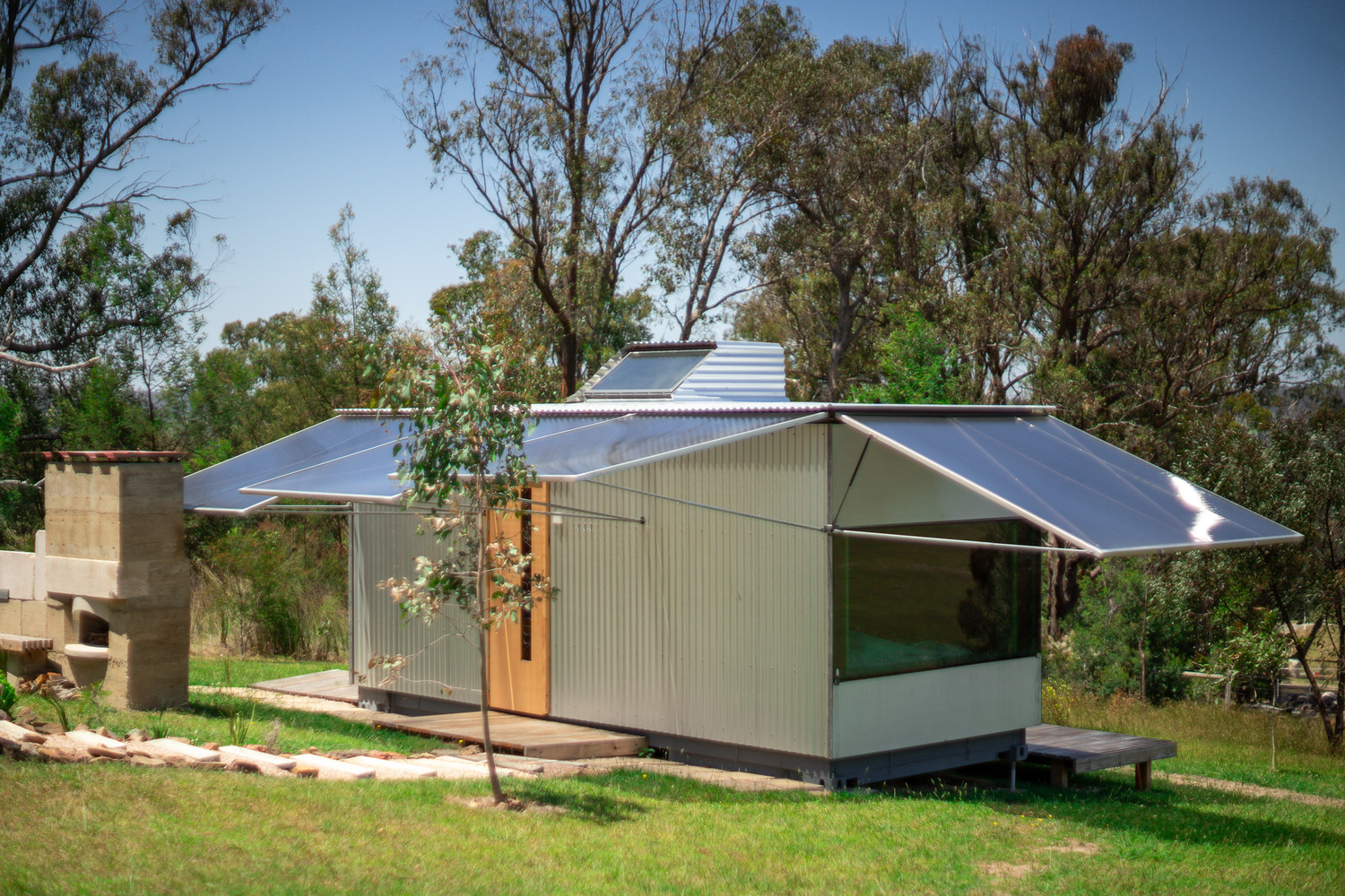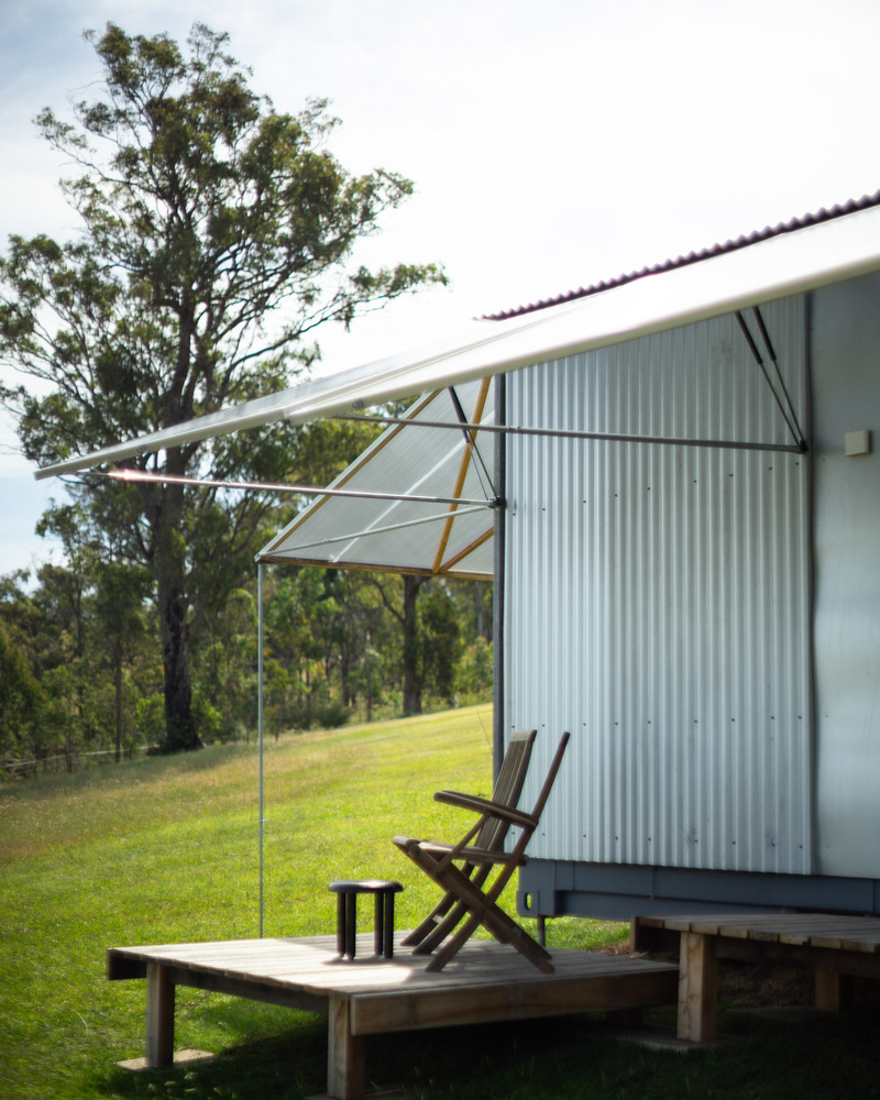 A discarded shipping container provides the transportable structure, delivered by truck to the site. An inventory of salvaged materials sets the design constraints, designing with what we have currently. The challenge was to fit all the necessities of daily life into this small 15sqm footprint: kitchen, living, dining, bathroom, bedroom, and storage. In the Australian context, there is traditionally an in between place where greetings happen, boots are kicked off, rolling storms pass by, informal meals take place, and all other ranges of activities take place under protection from the elements. House on Hill employs lift-assisted operable verandah awnings constructed of steel angle and polycarbonate, opening upwards and outwards when occupied and retracting when not in use or in transport.