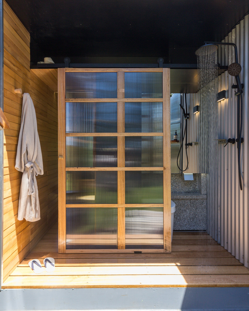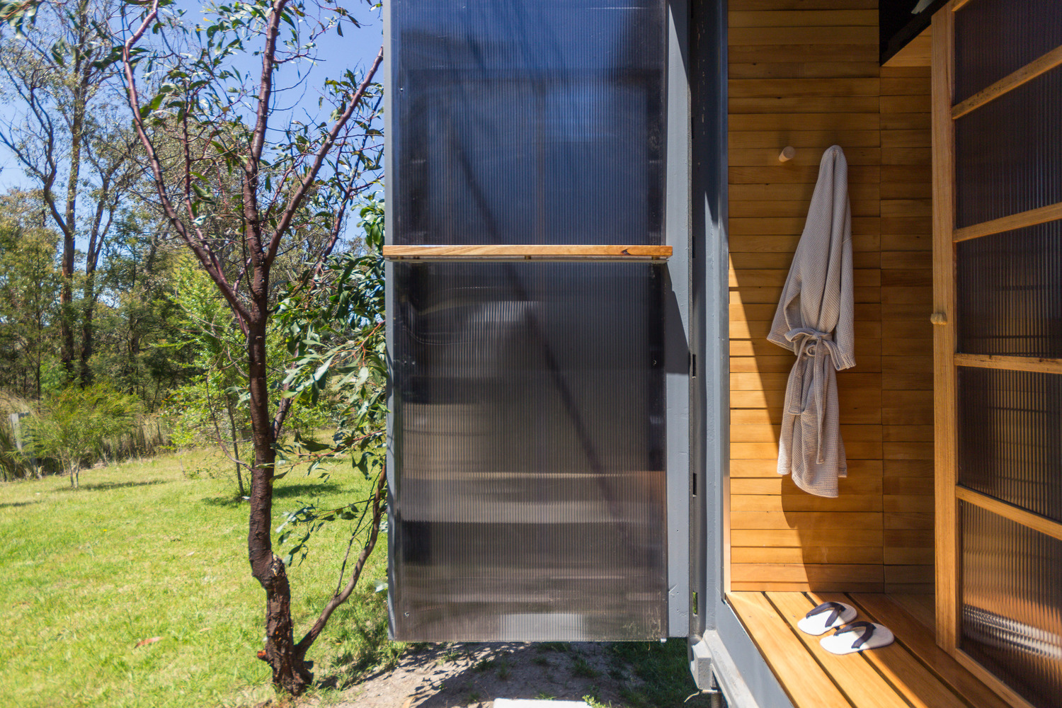 The pavilion responds to the harsh climatic conditions and landscape vernacular with a hard-shell metal clad exterior. A rectangular form of simple corrugated sheet is outlined by galvanized steel angles that also support the windows, doors, and awnings. On the south elevation an oversized steel lintel supports a large sliding glass panel on concealed rollers, the glass panel fully retracts against a flat metal sheet section of the wall to connect the elevated decking area. To the East façade, existing weather-sealed steel container doors remain, including their embodied carbon and structural integrity. Semi-opaque cladding and full operability allow the bathroom to extend outwards into a dense natural environment.
