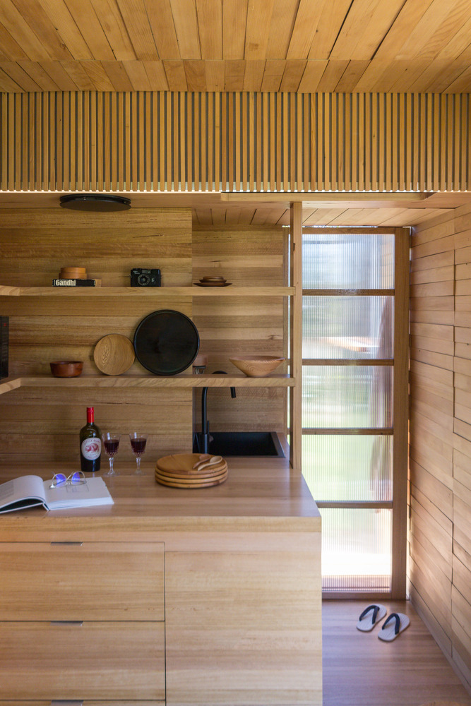 Green Studio has crafted a range of goods and wares for use in House on Hill, from timber serving plates, serving utensils, key bowls, incense burners, bookends, stools, handles, etc. Each piece contributes to the experience of dwelling in diverse a landscape. A sliding timber screen separates a compact wet area characterized by a recessive mood of calm and shadow. Black form ply, grey granite, and corrugated sheet, all reclaimed of course, open outwards via the massive semi-opaque doors. The small space now turns into an expansive retreat.