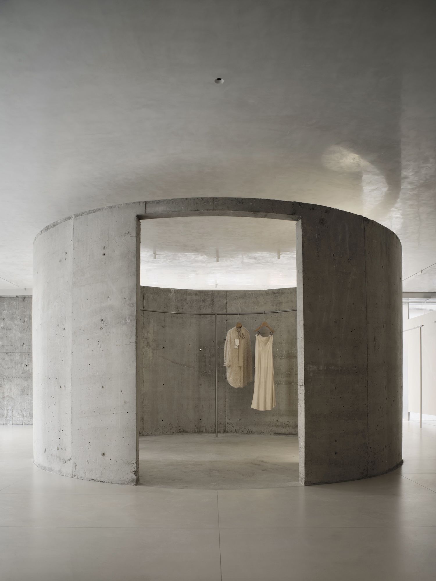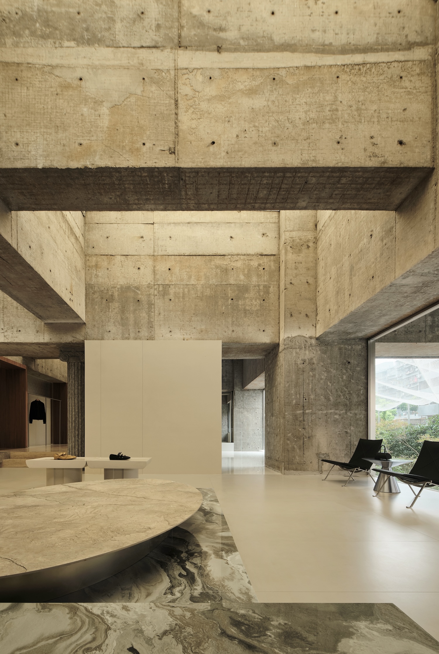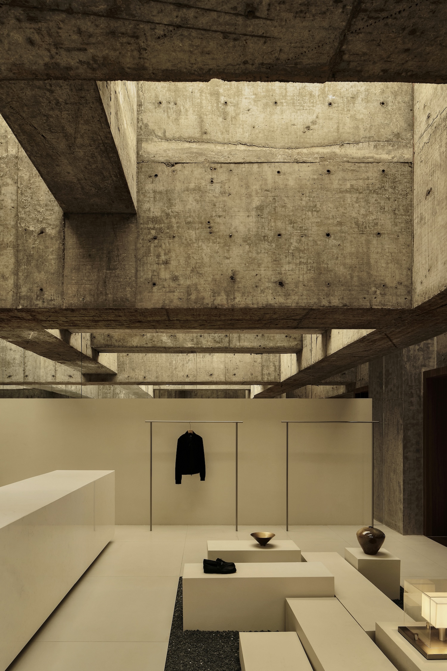 A prominent circular concrete display structure anchors the space, forming a centerpiece for clothing displays that blurs the boundary between art and commerce. The central pathway, flanked by carefully placed display walls, offers an evolving narrative that feels both cohesive and dynamic. On the second floor, the design retains the original exposed concrete beams, juxtaposed with layers of wood, stone, and metal. This fusion conveys a natural, almost organic aesthetic that enriches the space’s tactility and depth. A softly diffused ceiling light amplifies the textures, lending a quiet resonance to the space. Each detail has been carefully considered, from a streamlined cash wrap positioned on the upper level to a multi-functional live streaming area, hidden behind sliding doors, that smoothly transitions between work and leisure modes.