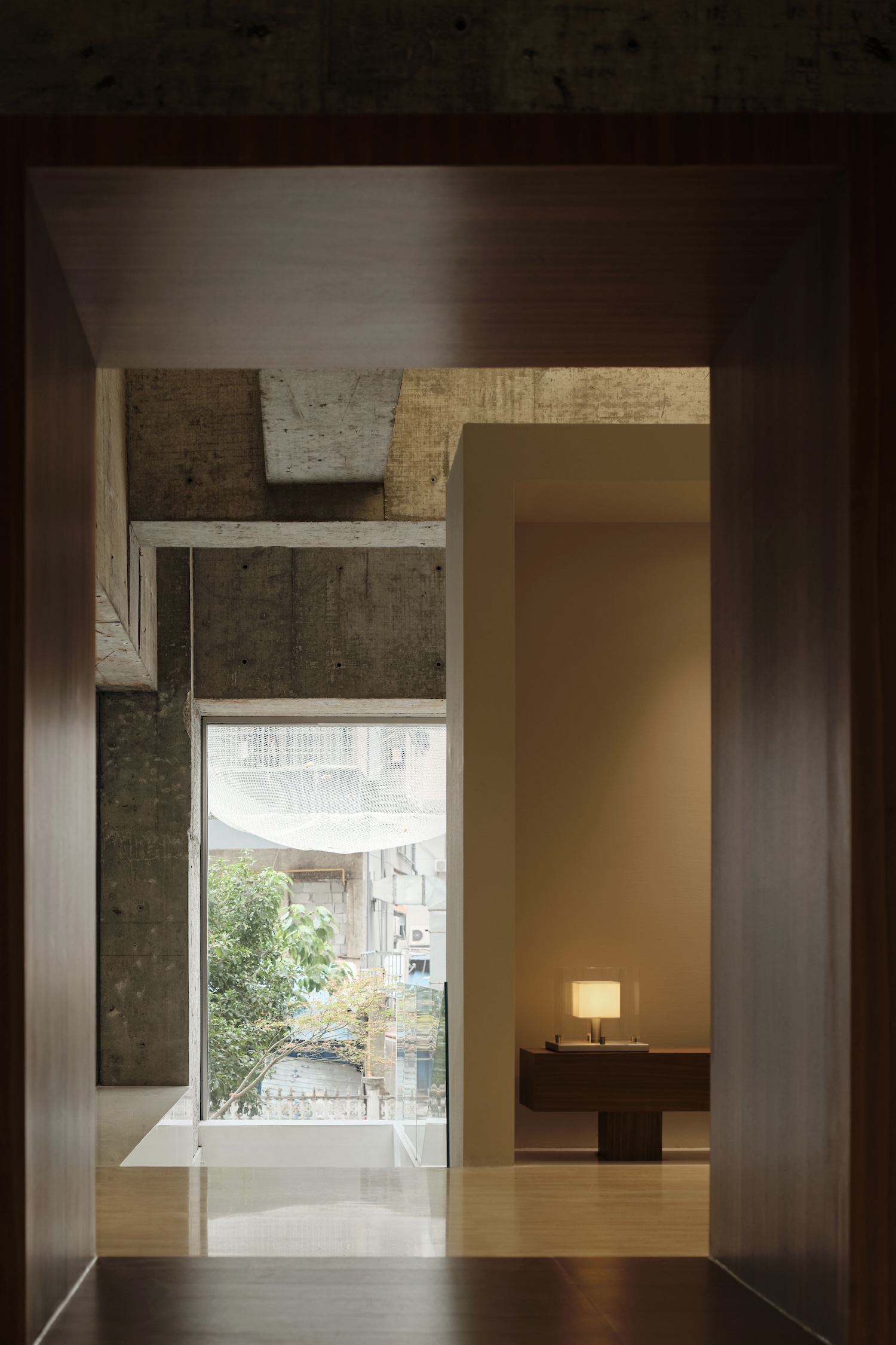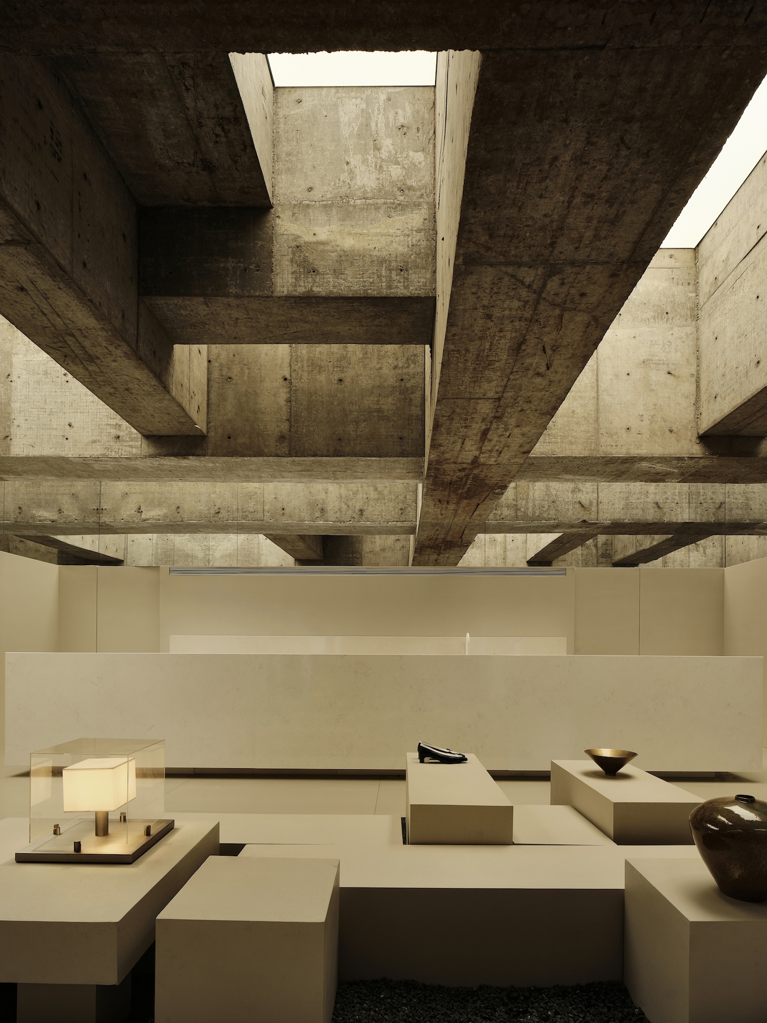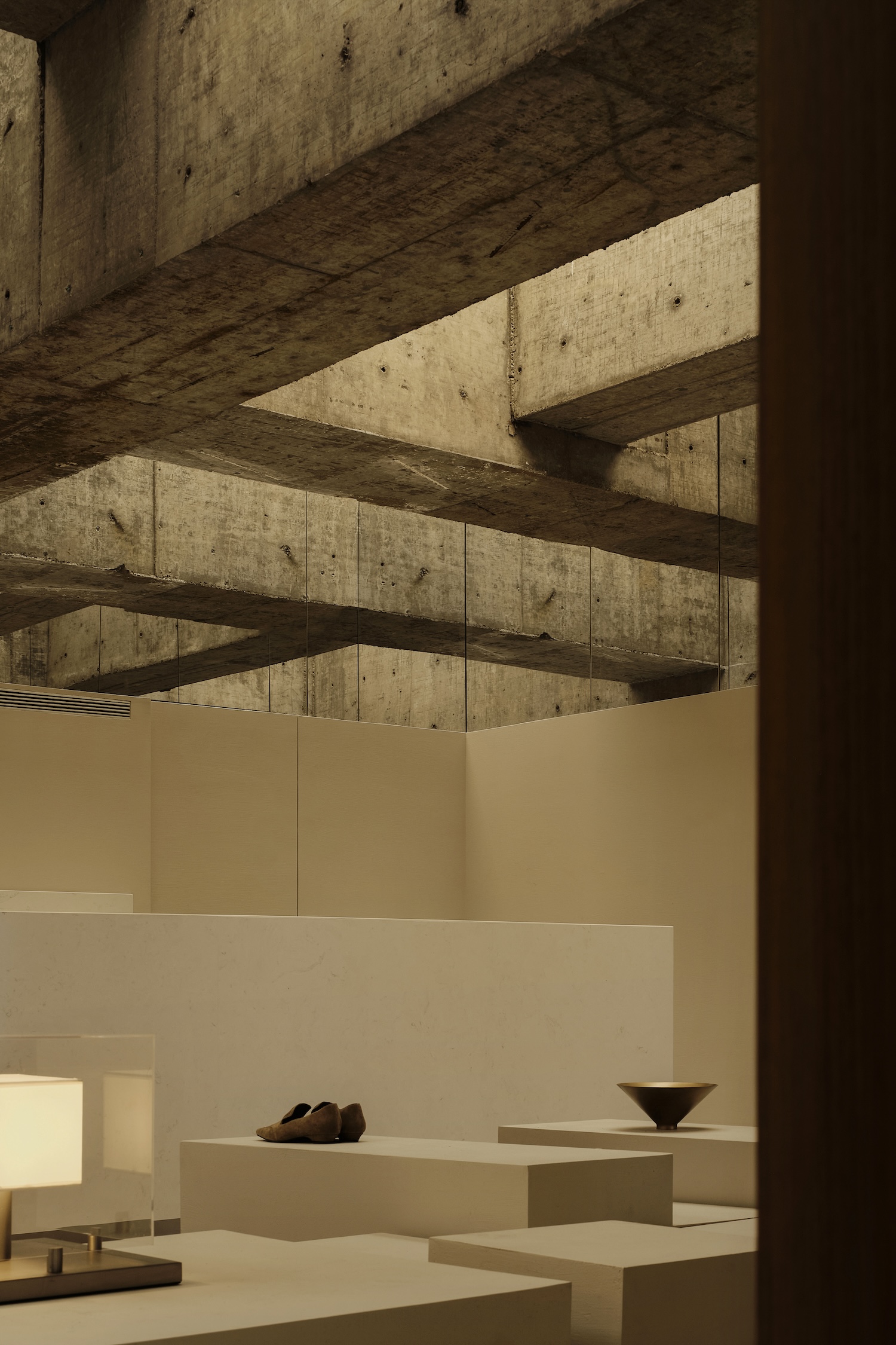 A prominent circular concrete display structure anchors the space, forming a centerpiece for clothing displays that blurs the boundary between art and commerce. The central pathway, flanked by carefully placed display walls, offers an evolving narrative that feels both cohesive and dynamic. On the second floor, the design retains the original exposed concrete beams, juxtaposed with layers of wood, stone, and metal. This fusion conveys a natural, almost organic aesthetic that enriches the space’s tactility and depth. A softly diffused ceiling light amplifies the textures, lending a quiet resonance to the space. Each detail has been carefully considered, from a streamlined cash wrap positioned on the upper level to a multi-functional live streaming area, hidden behind sliding doors, that smoothly transitions between work and leisure modes.