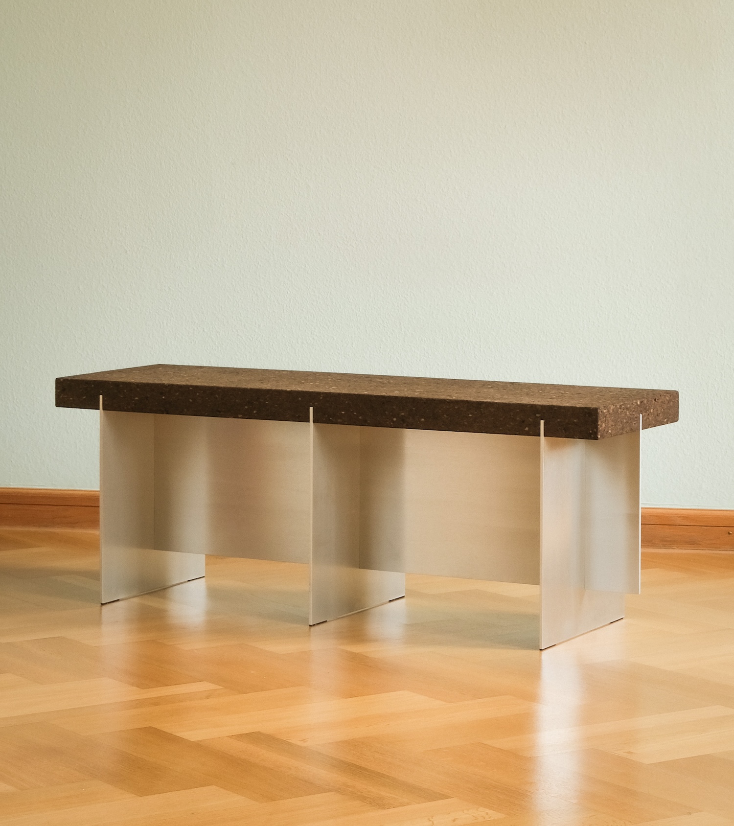 Collection Cork X is a minimalist collection of pieces designed by Germany-based designer Robert Megel. The collection pairs the tactile warmth of Portuguese cork with the precision and sleekness of satin-finished aluminum, creating pieces that emphasize both functionality and material expression. Each piece integrates aluminum elements as structural supports. The metal’s diffuse sheen adds a sense of lightness, while its sharp, filigree edges juxtapose the soft, grooved cork surfaces that form the seating.