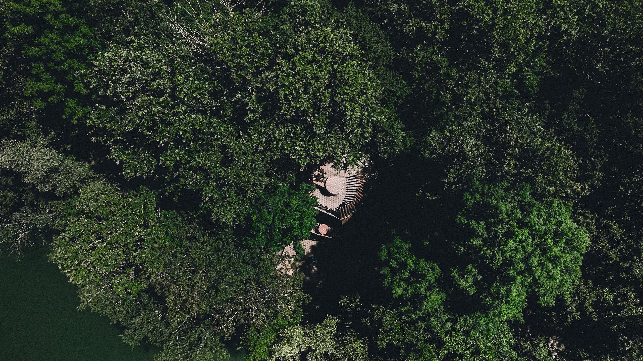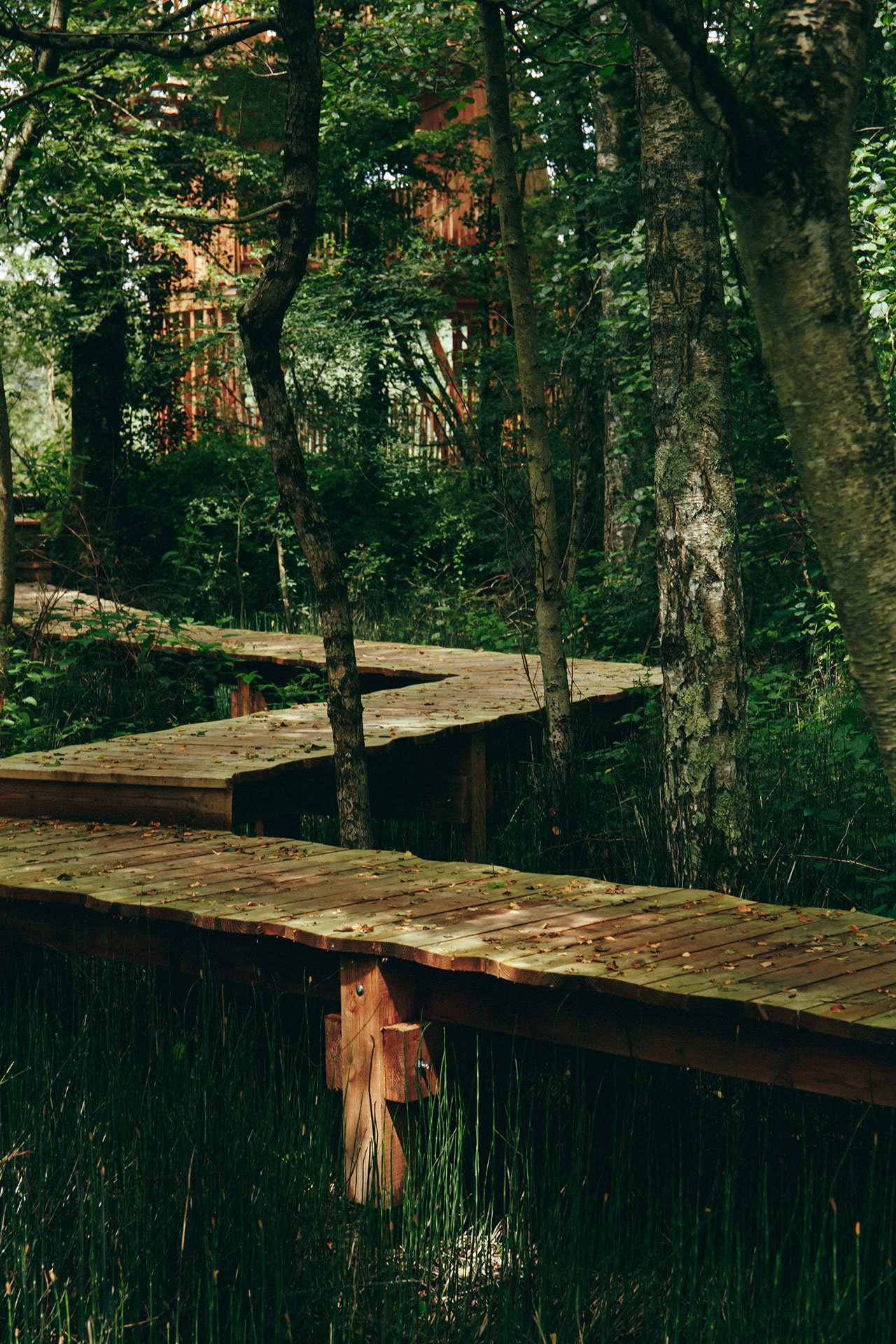 Thoughtfully planned over three levels, the design of the four cabins takes inspiration from a budding flower, in a structure that shelters but opens, allowing guests to experience the environment without feeling detached. The first level, raised on stilts, creates an expansive terrace where guests can relax outdoors while staying protected from the sun and rain. On the second level, large bay windows in the bedroom provide natural ventilation and a constant visual connection with the surrounding forest and lakes. The third level offers a Nordic bath amongst the treetops, where guests can unwind in warm water while taking in panoramic views of the lush landscape.