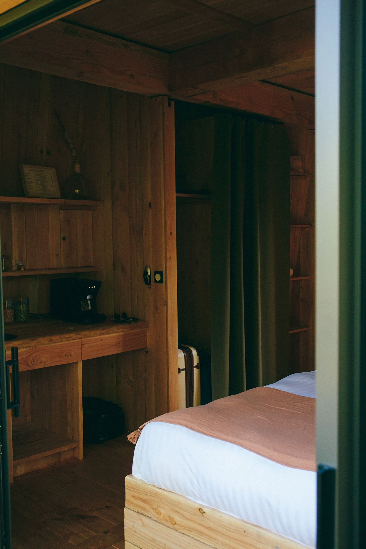 Sustainability is, as expected, carefully woven into every element of the cabins, starting with the local Douglas fir used in their construction, sourced less than 30 kilometres from the site and crafted by MCF Bois, a nearby timber framing company. Prefabricated in MCF Bois’ workshop and assembled on site in a mere four days, the cabins benefit from an efficient construction process that minimizes environmental impact. With high-performance insulation and cross-ventilation aided by a fan above the bed, the cabins maintain a comfortable thermal environment, despite their open layout.