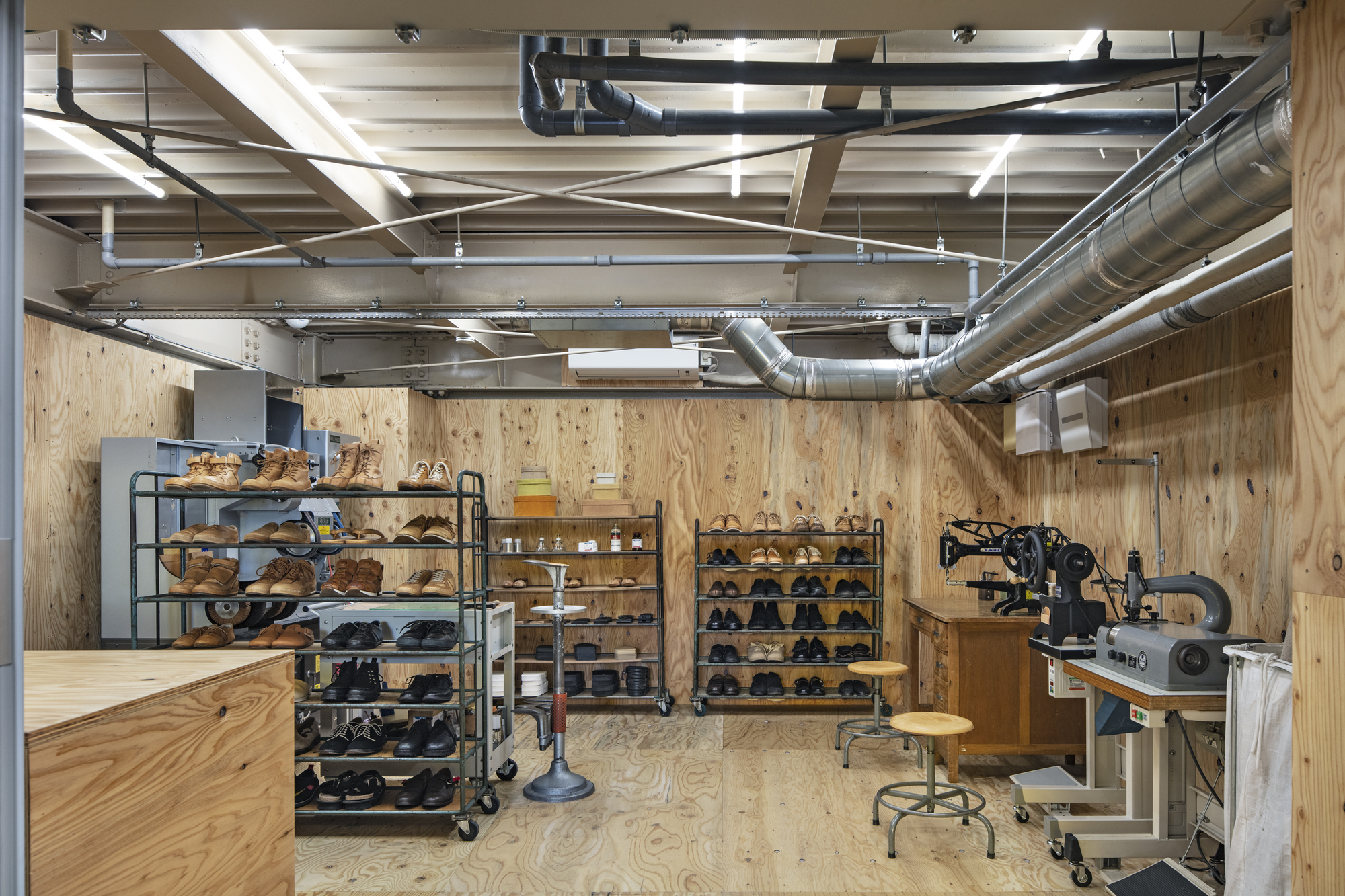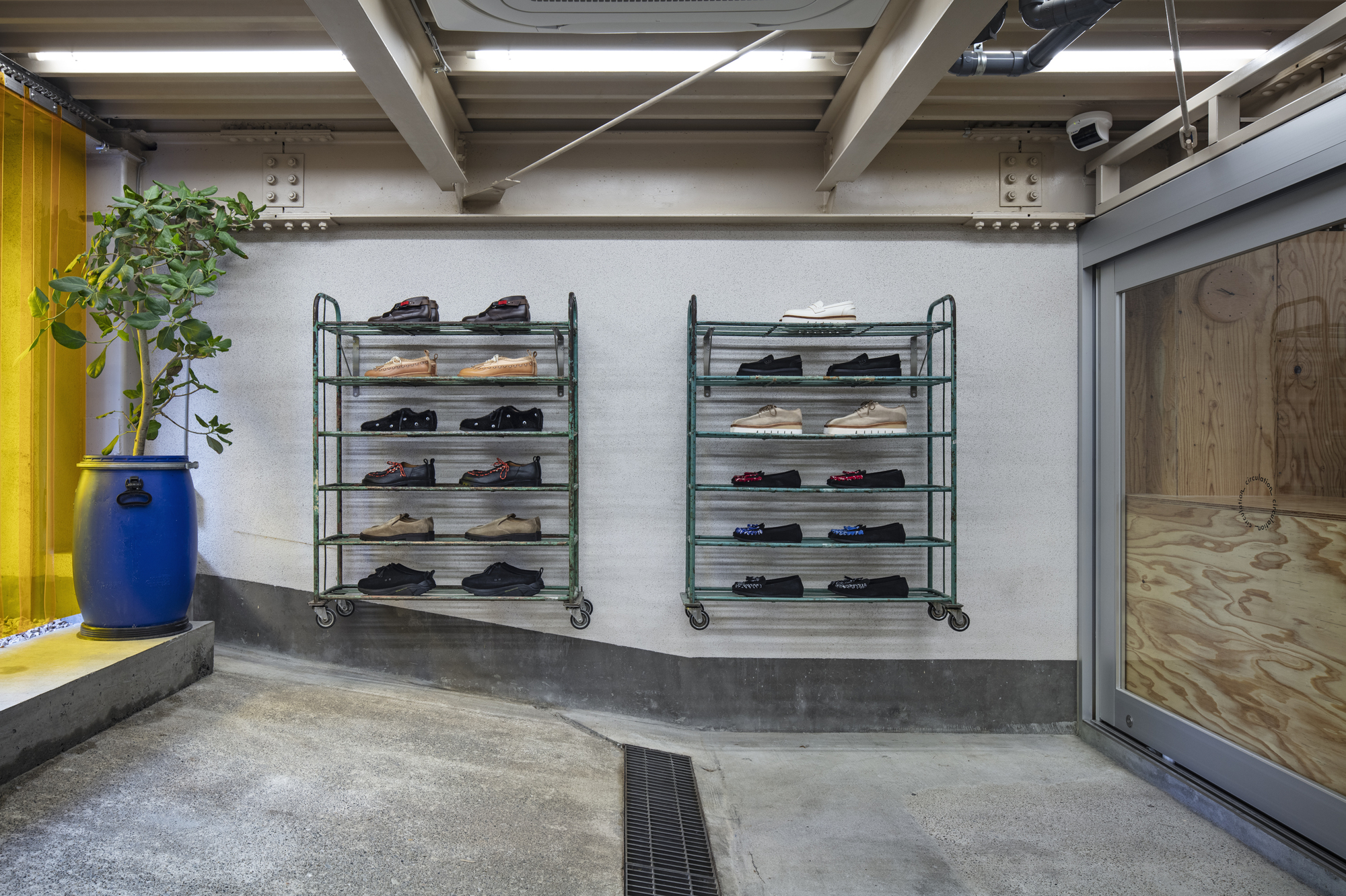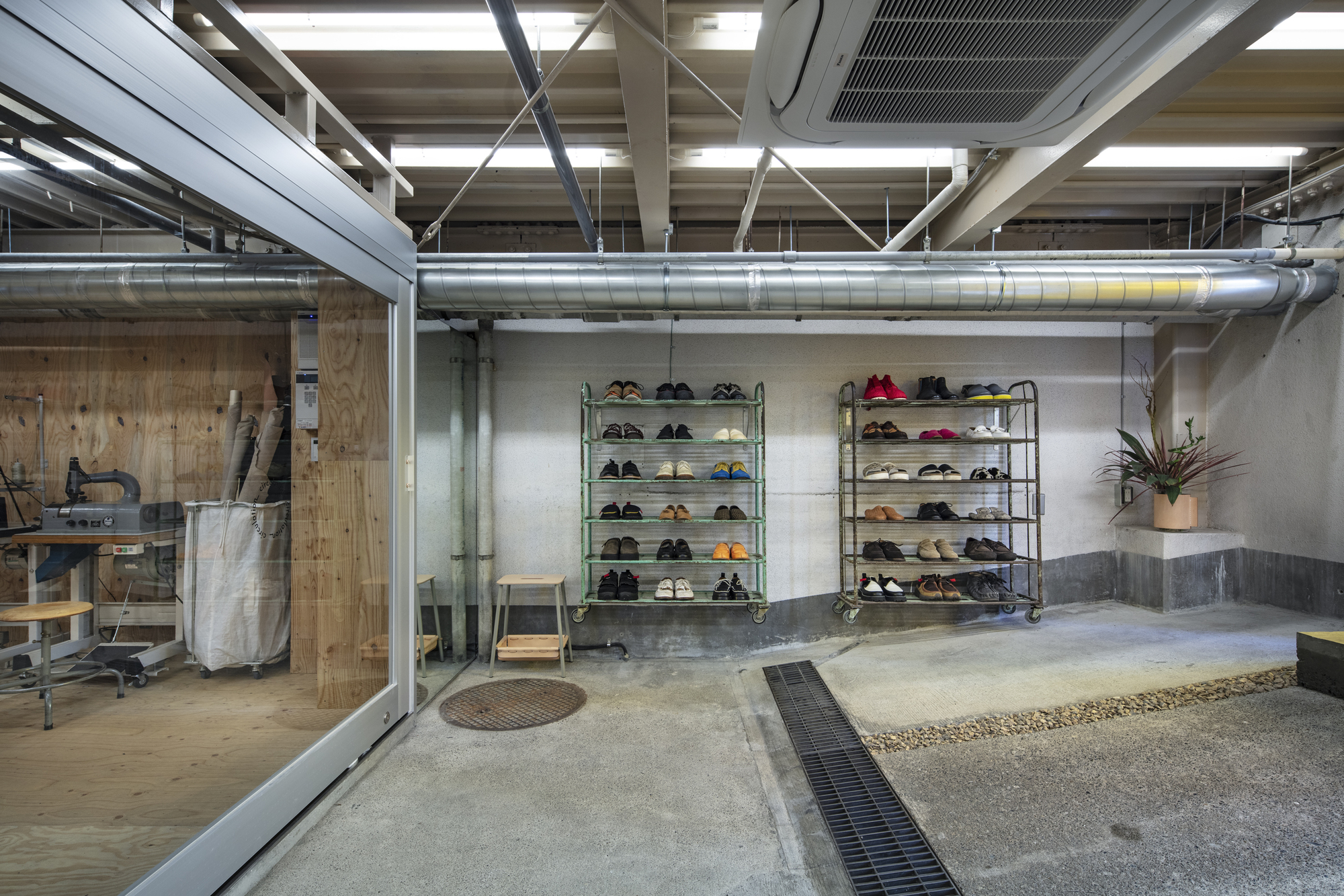 The space at the front is used for selling products, and the workshop at the back is used for repair work. The workshop is insulated and sealed to control humidity, protecting the quality of the shoes customers have entrusted to the store and preventing the spread of dust. The remaining space for selling shoes is left as it was. A counter appears when you open the ready-made extra-large aluminum-frame sliding door halfway between the sales space and the workshop.