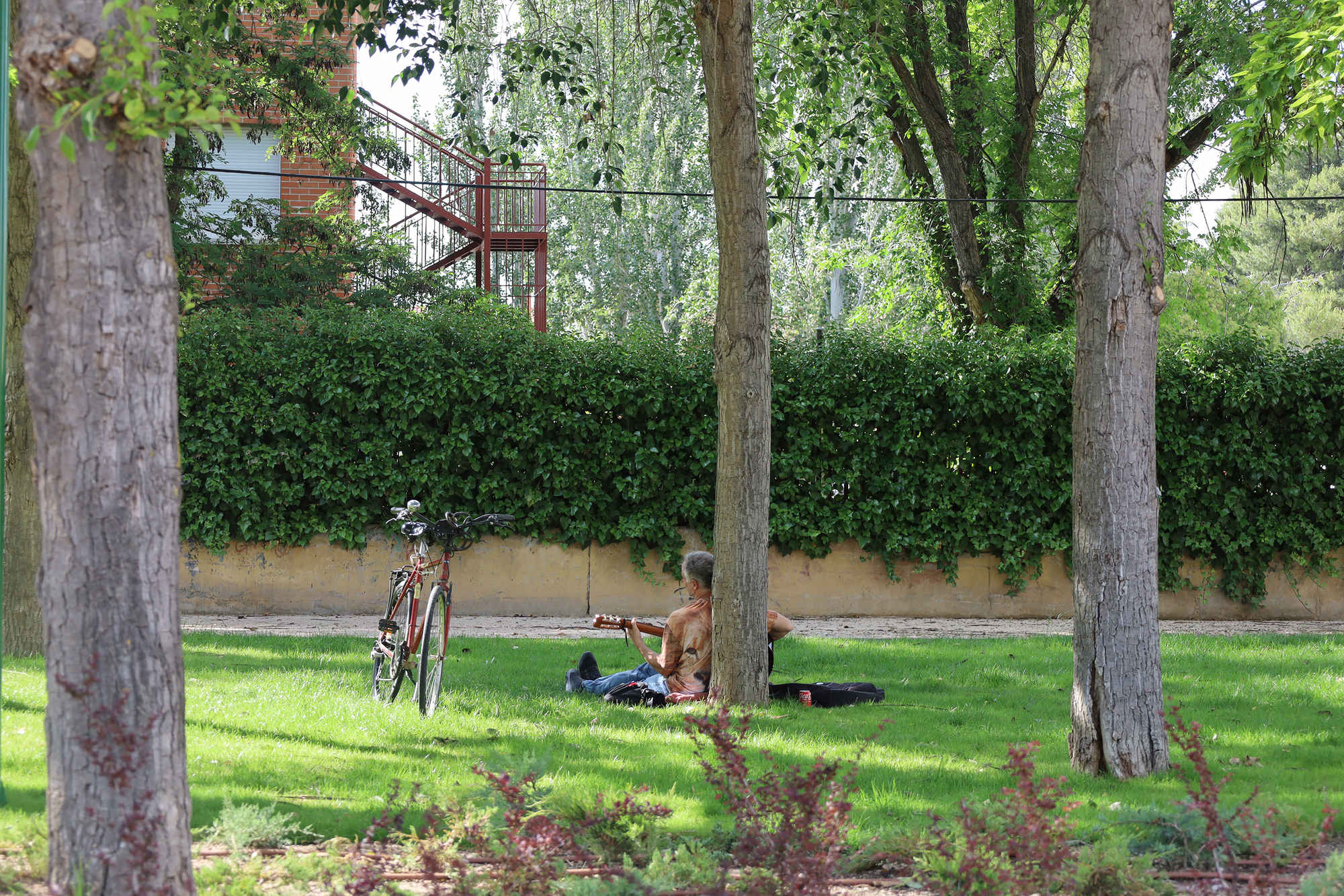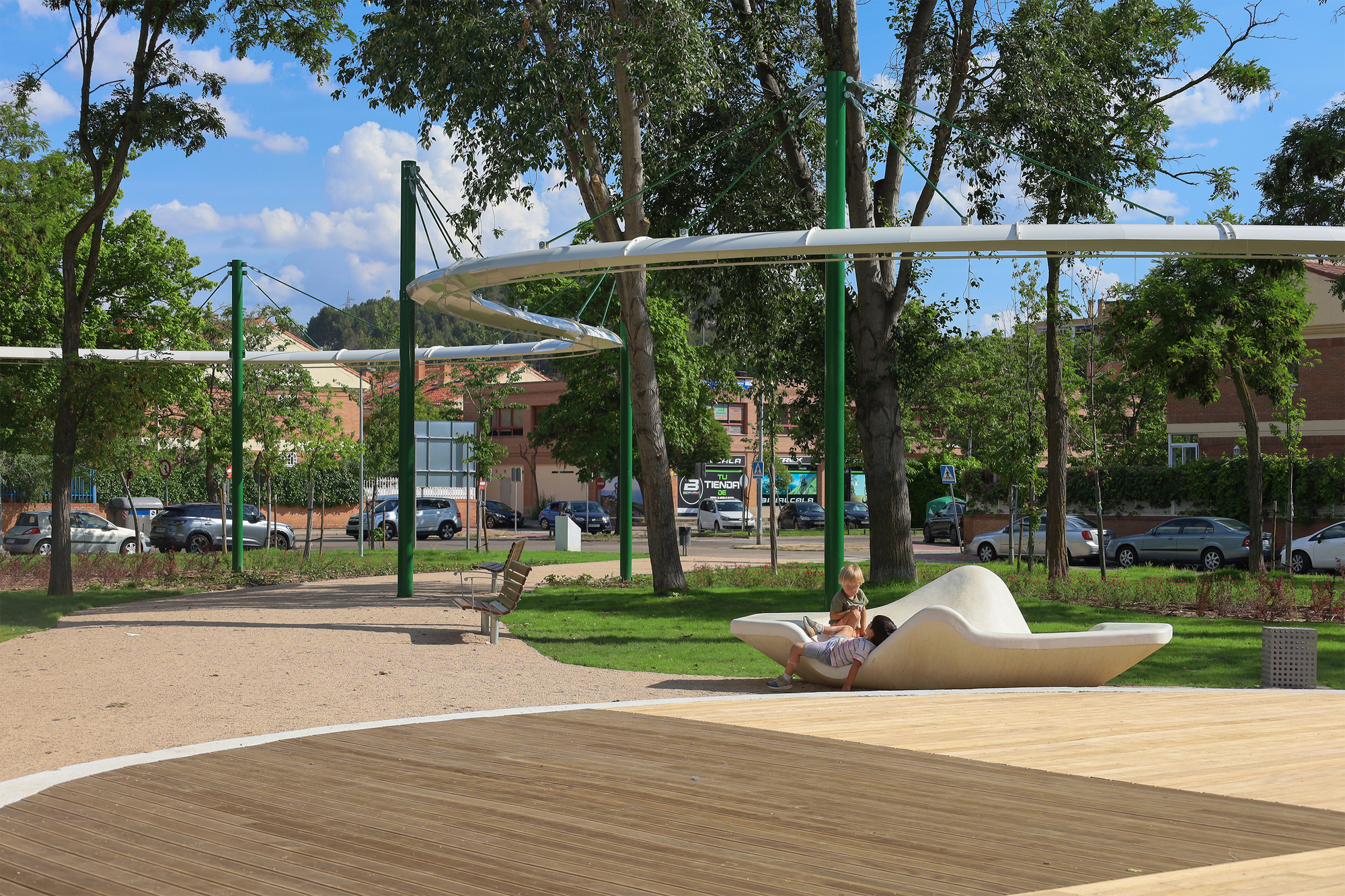 The park was previously dominated by hard transit surfaces (4,665 m²) compared to green areas (1,861 m²). To revitalize the park, it was redesigned as a green tapestry filled with meadows and trees, while paths were minimized to just a diagonal accessible route—used most frequently by locals and a smaller one leading to the bus stop. A meticulous landscape study was conducted to enhance the park’s biodiversity by expanding flowerbeds, vegetation, and introducing new shrub species, organized according to their water requirements to improve irrigation efficiency. This resulted in an increase of green areas by 4,896 m² and a reduction of hard surfaces by 1,630 m². The project also reconnected the park with its historical fabric by emphasizing two key elements. The first, the Henares River, was reflected through an elevated illuminated pergola that sinuously traverses the park, mimicking the river's meanders. This functional and sculptural element provides identity and a sense of belonging to the neighborhood.