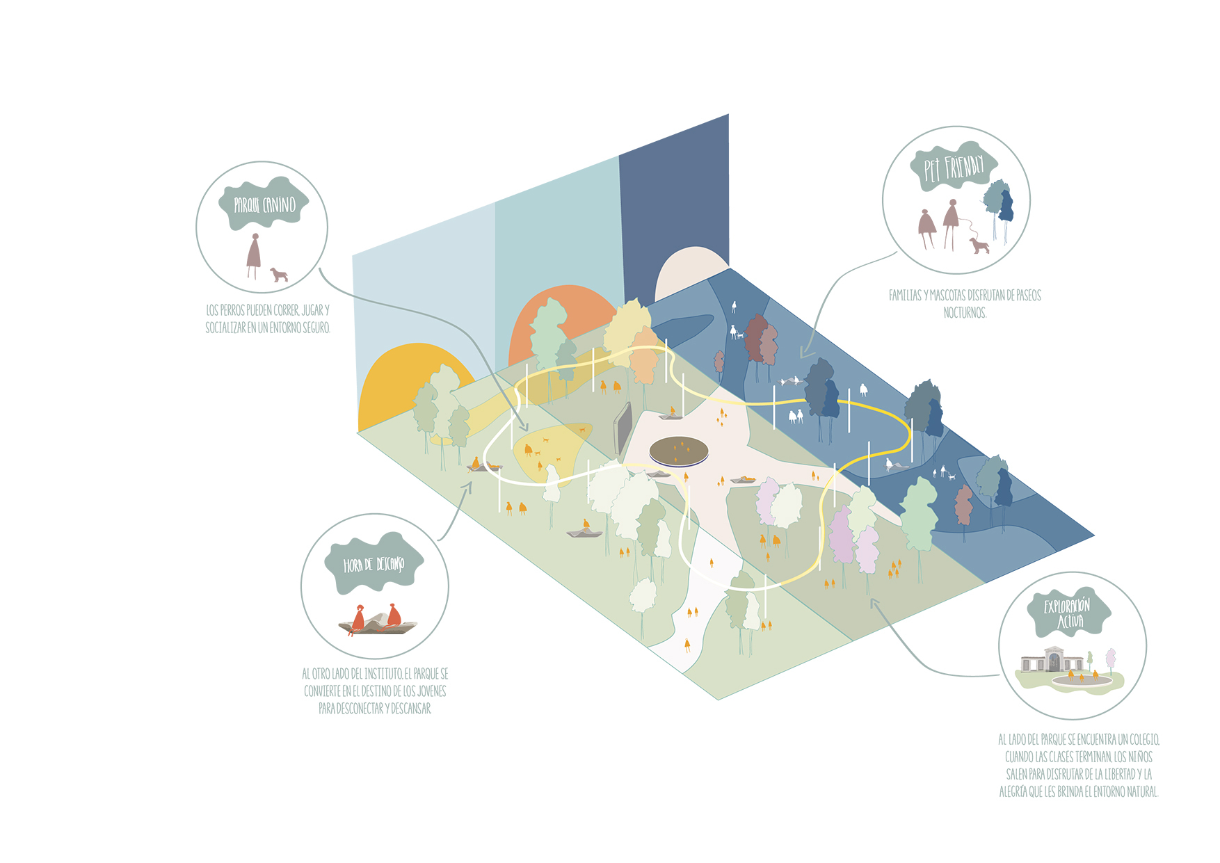 The study of the surroundings and community feedback helped identify the social and generational diversity of the area, resulting in the design of an inclusive space for everyone. The illuminated pergola allows the park to be enjoyed at night, while the dance floor fosters interaction and a festive atmosphere. Open spaces for children’s play, sports activities, and a designated area for pets complete the offerings.