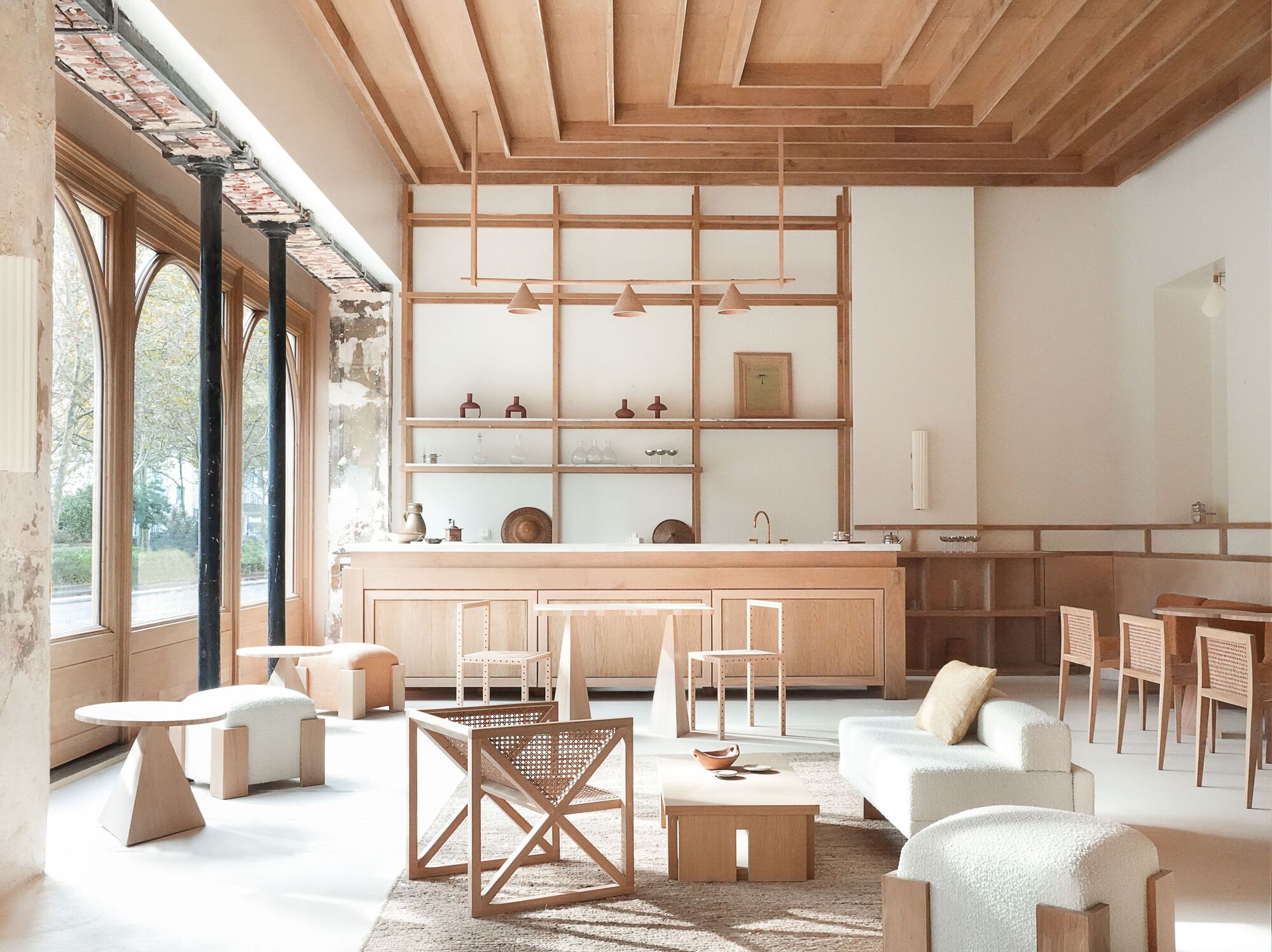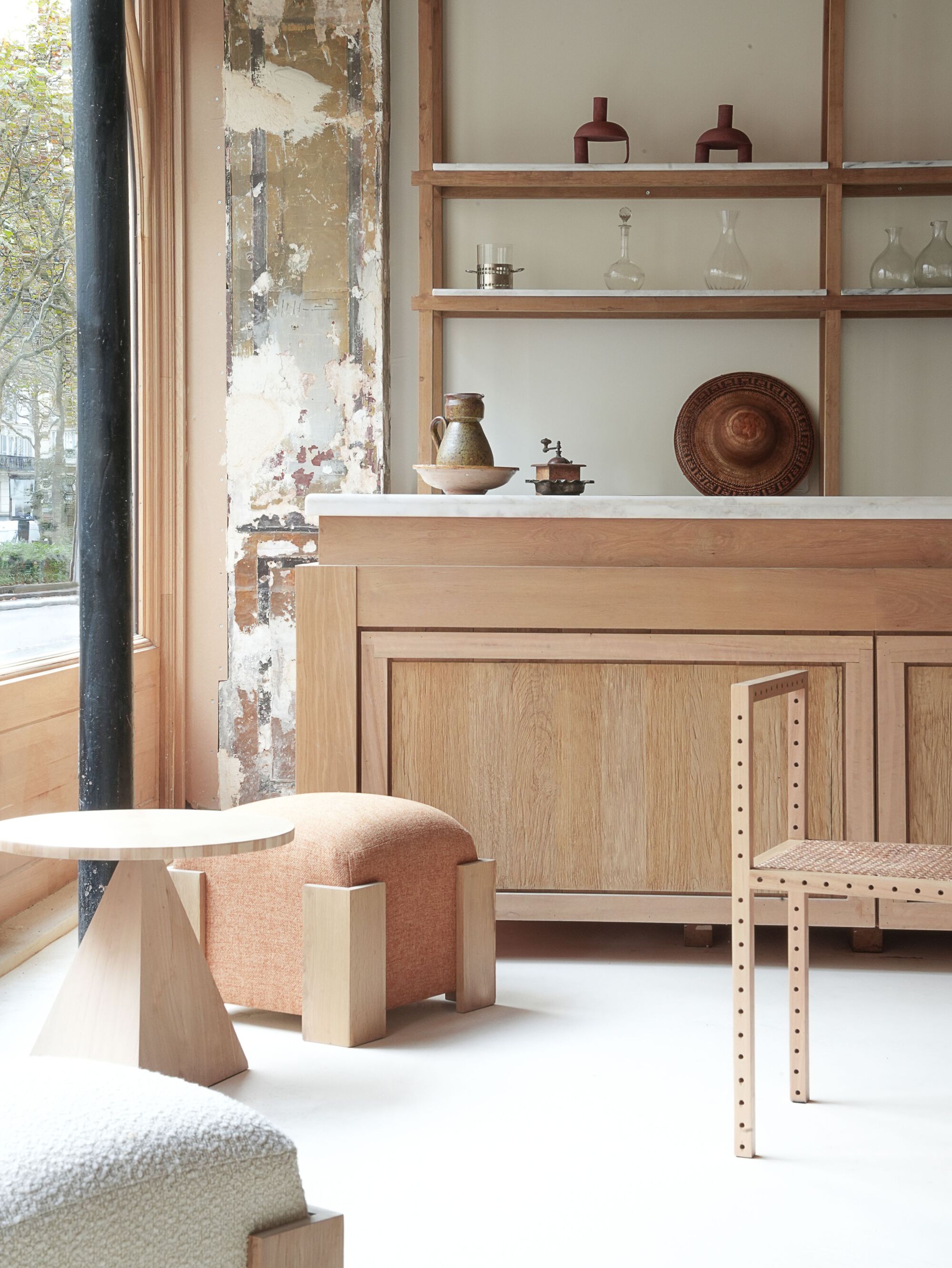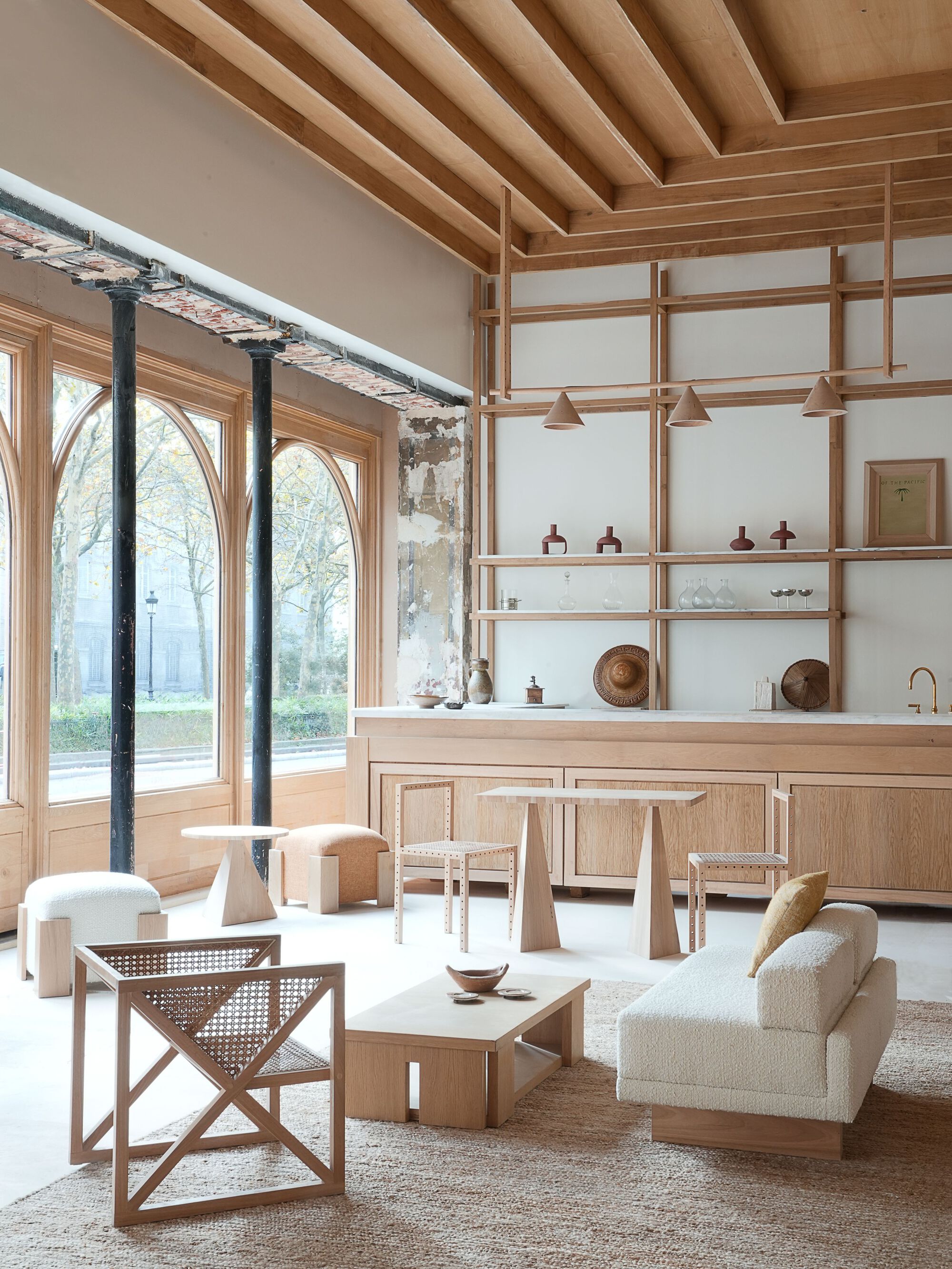Nearly every element of the interior was custom-designed and crafted on site at Policronica's workshop in Lisbon, utilizing locally sourced Eucalyptus wood. This wood, often considered invasive due to its uncontrolled growth and detrimental effects on soil quality, is typically used for papermaking. Policronica worked directly with small forest owners to purchase the trees at higher prices than those offered by papermaking companies. The aim was to showcase, on a small scale, how this material could be repurposed for high-value applications, promoting sustainable and diverse forestry practices.