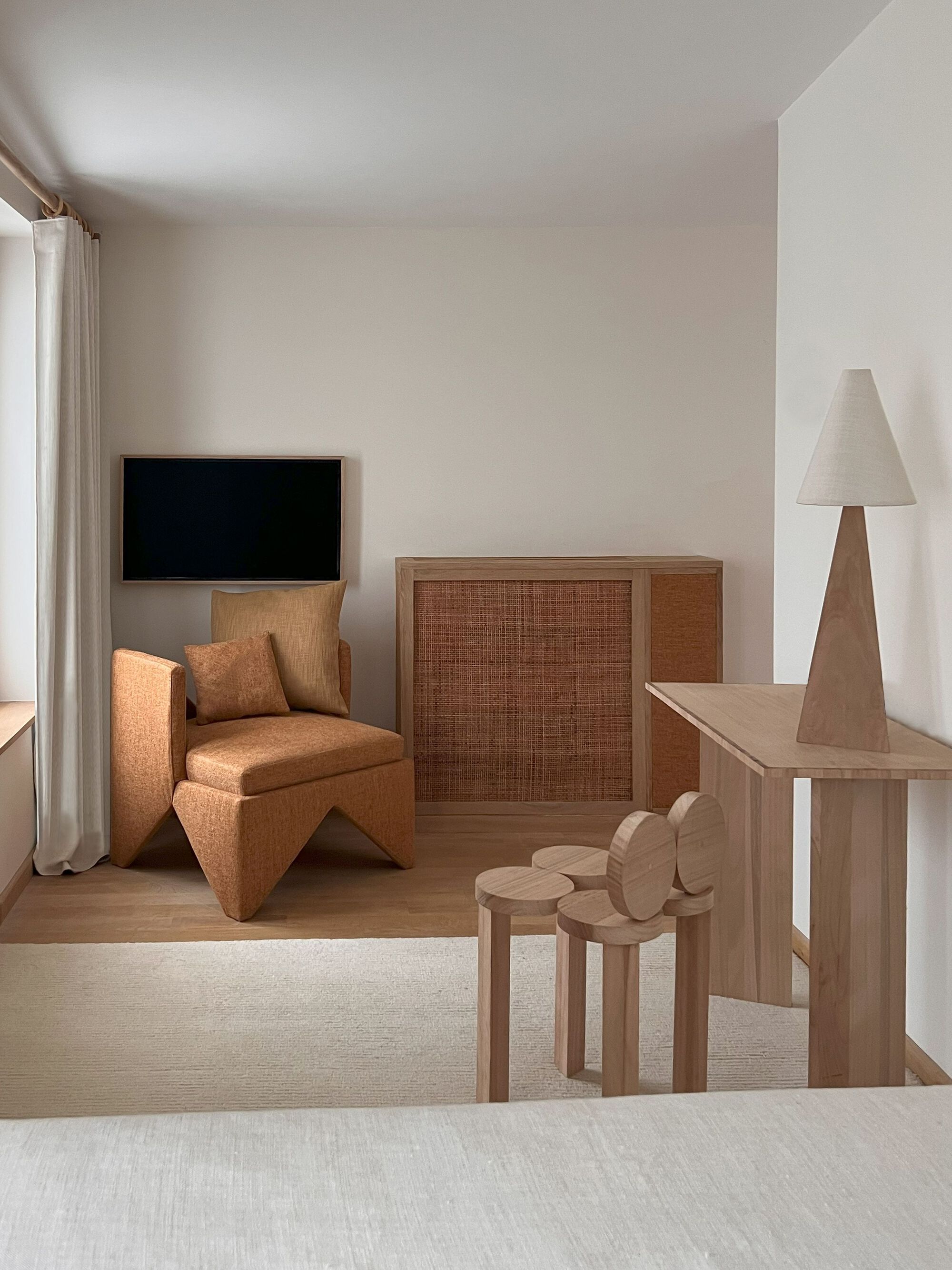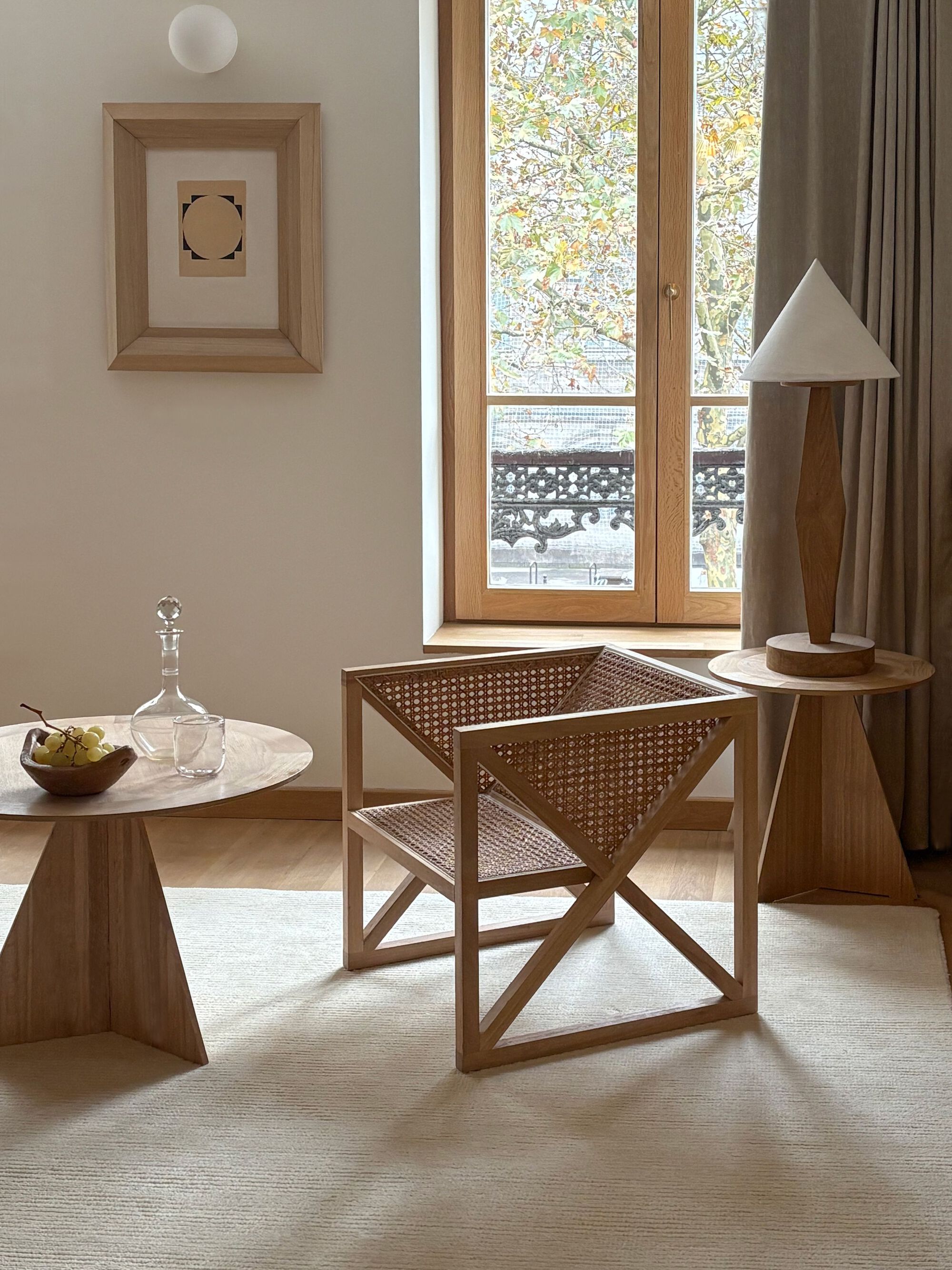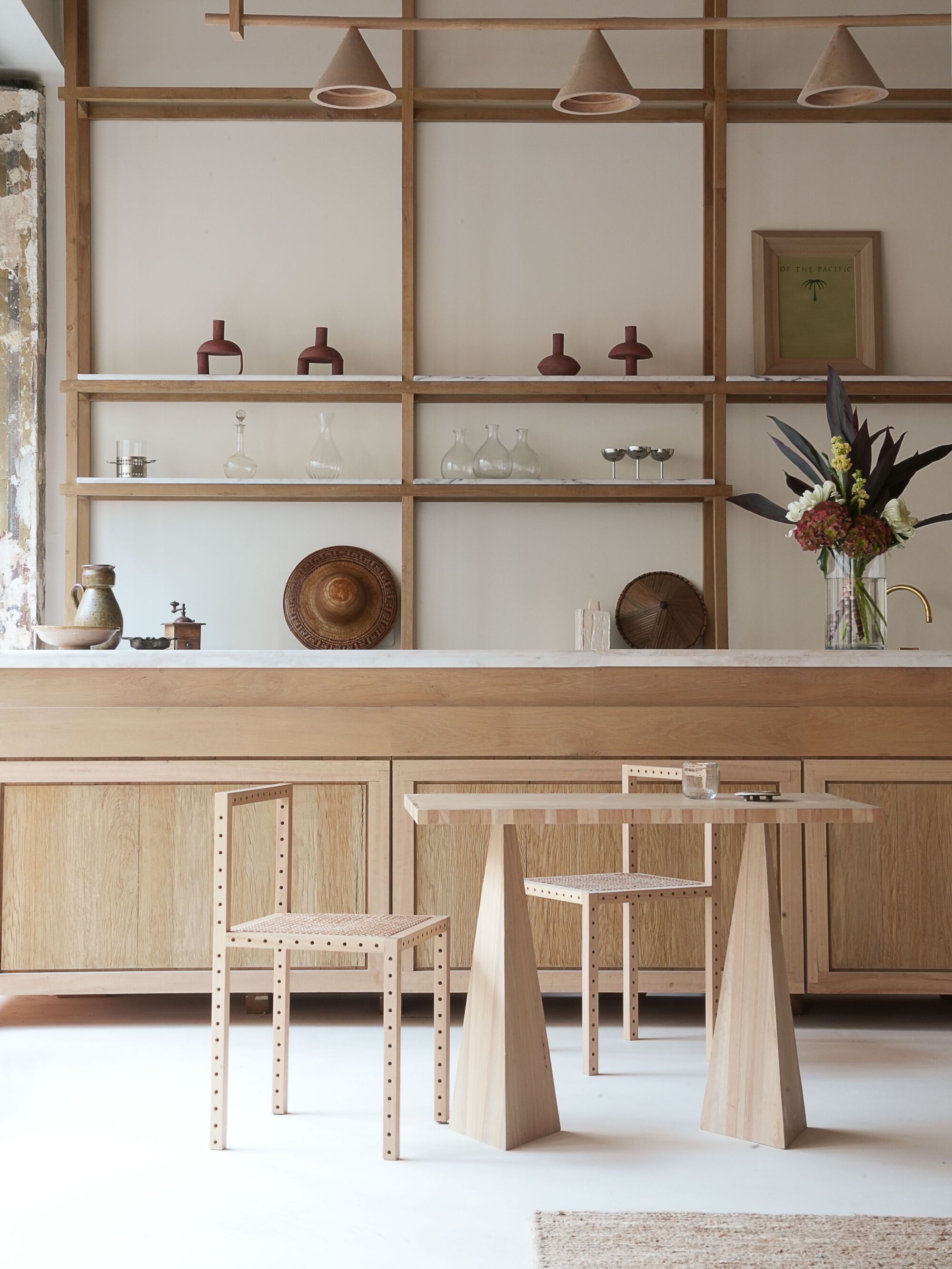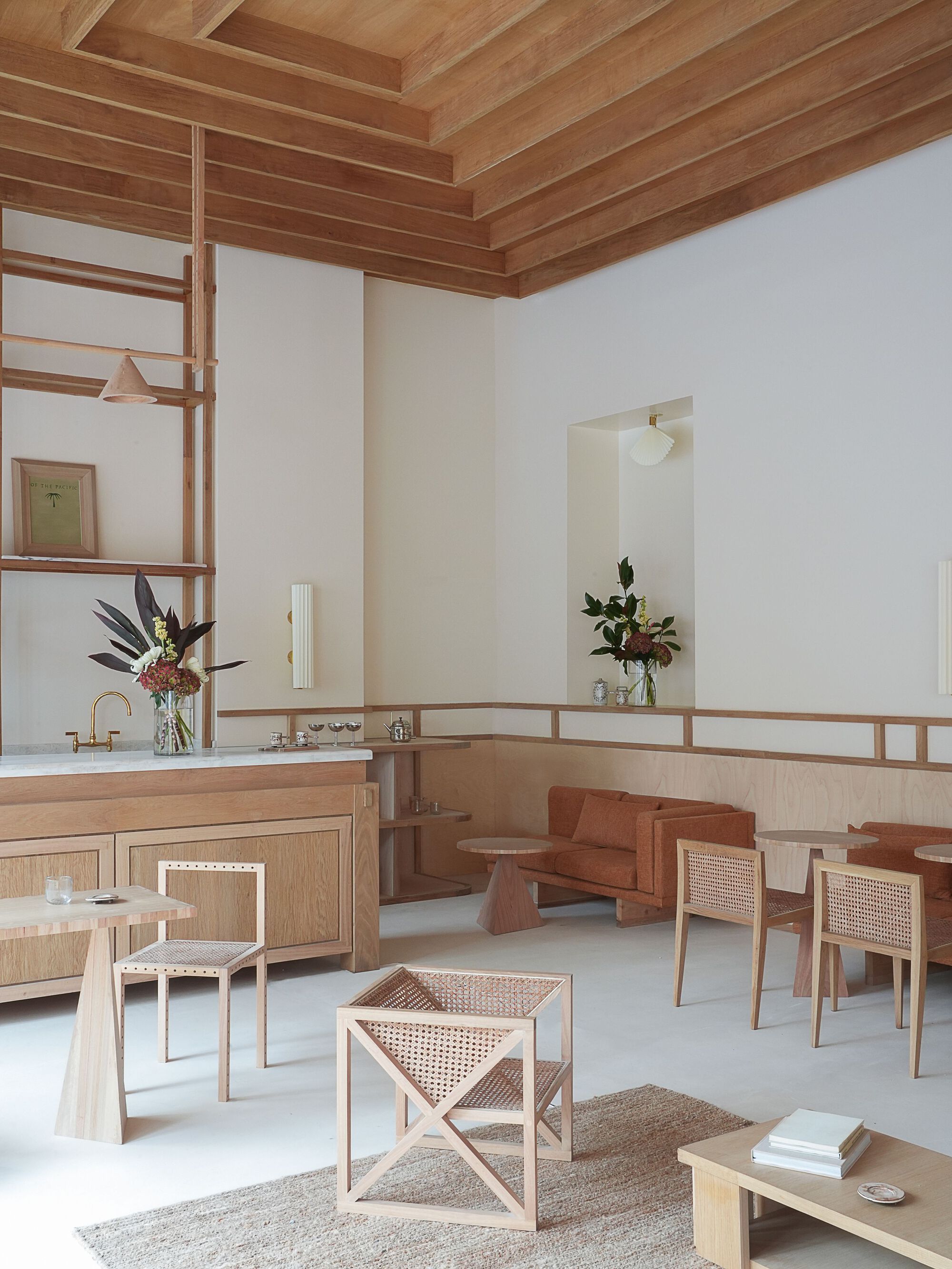 Nearly every element of the interior was custom-designed and crafted on site at Policronica's workshop in Lisbon, utilizing locally sourced Eucalyptus wood. This wood, often considered invasive due to its uncontrolled growth and detrimental effects on soil quality, is typically used for papermaking. Policronica worked directly with small forest owners to purchase the trees at higher prices than those offered by papermaking companies. The aim was to showcase, on a small scale, how this material could be repurposed for high-value applications, promoting sustainable and diverse forestry practices.