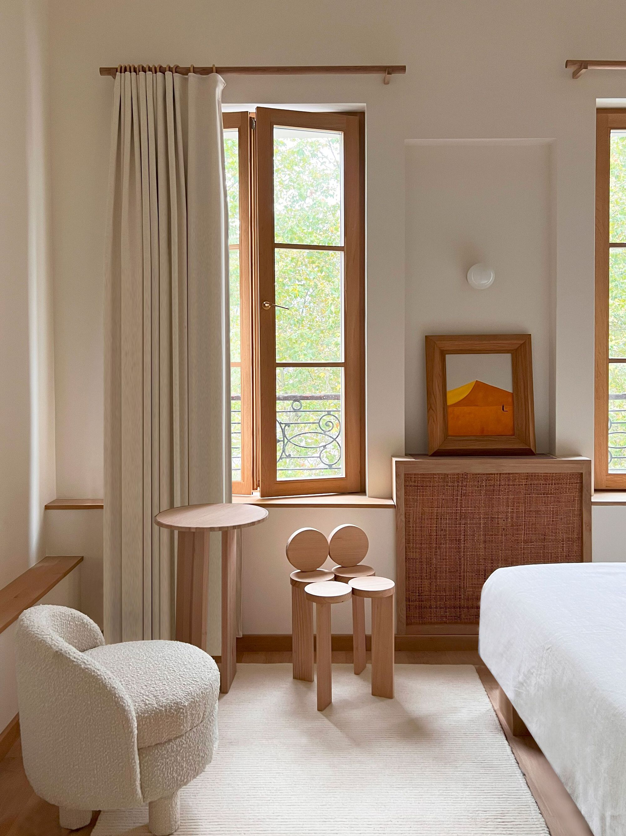 Design studio Policronica has reimagined the interior of a historic building located next to the iconic Elysée Montmartre concert hall at the heart of Montmartre in Paris. Previously abandoned, the 850-square meter space has been revitalized to reflect the architects' distinctive aesthetic, featuring a monochromatic interior defined by architectural woodwork and custom wooden furnishings. Policronica chose to design and manufacture all of the hotel's elements in-house, including furniture, lighting fixtures, and handles. The project embraces warm and raw materials such as wood, plant fibers, brass, and neutral fabrics, creating a clean, organic aesthetic across all of its 16 rooms.