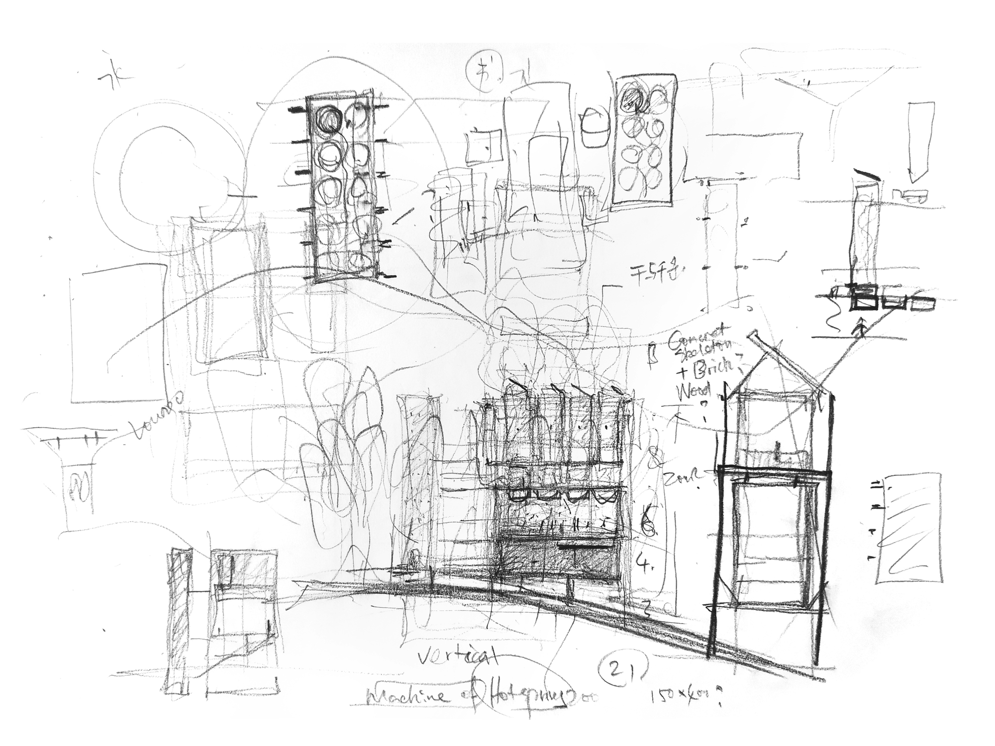 We envision the building as an apparatus of the steaming hot spring, touching lightly upon the natural slope. To minimize the impact of the building on the original landscape, we raised the main building from the ground. Its volume is supported by 10 columns driven into the earth.