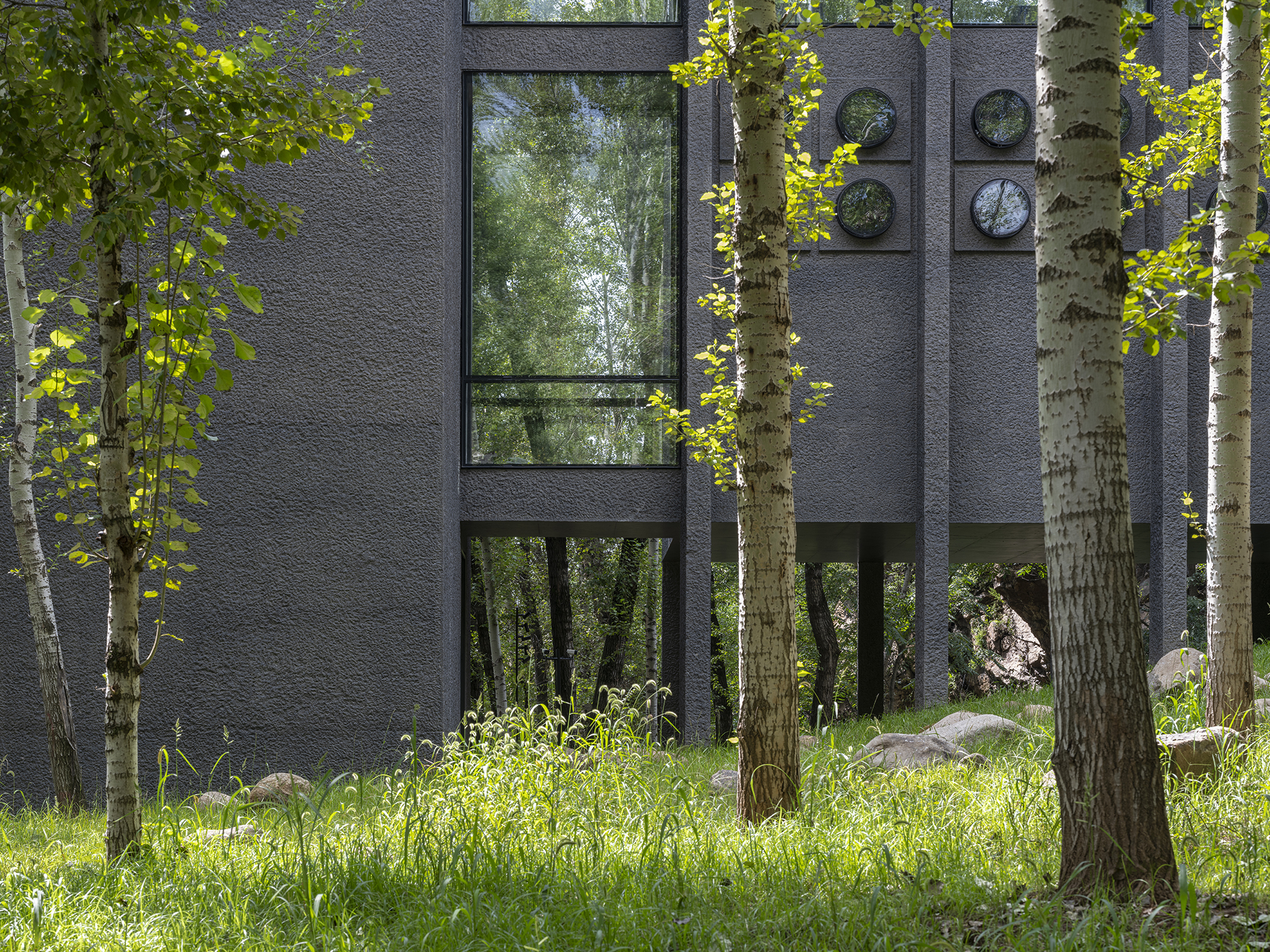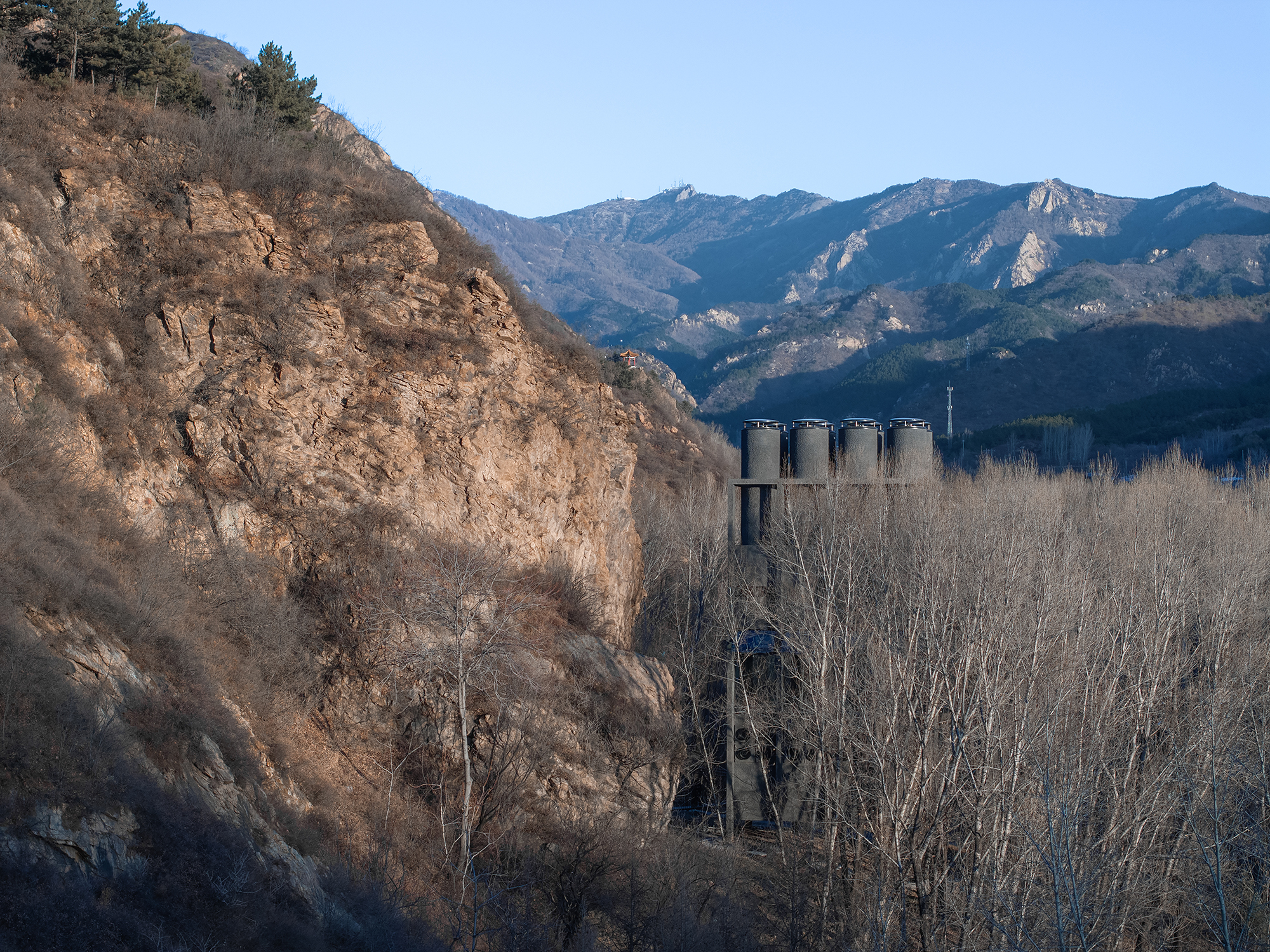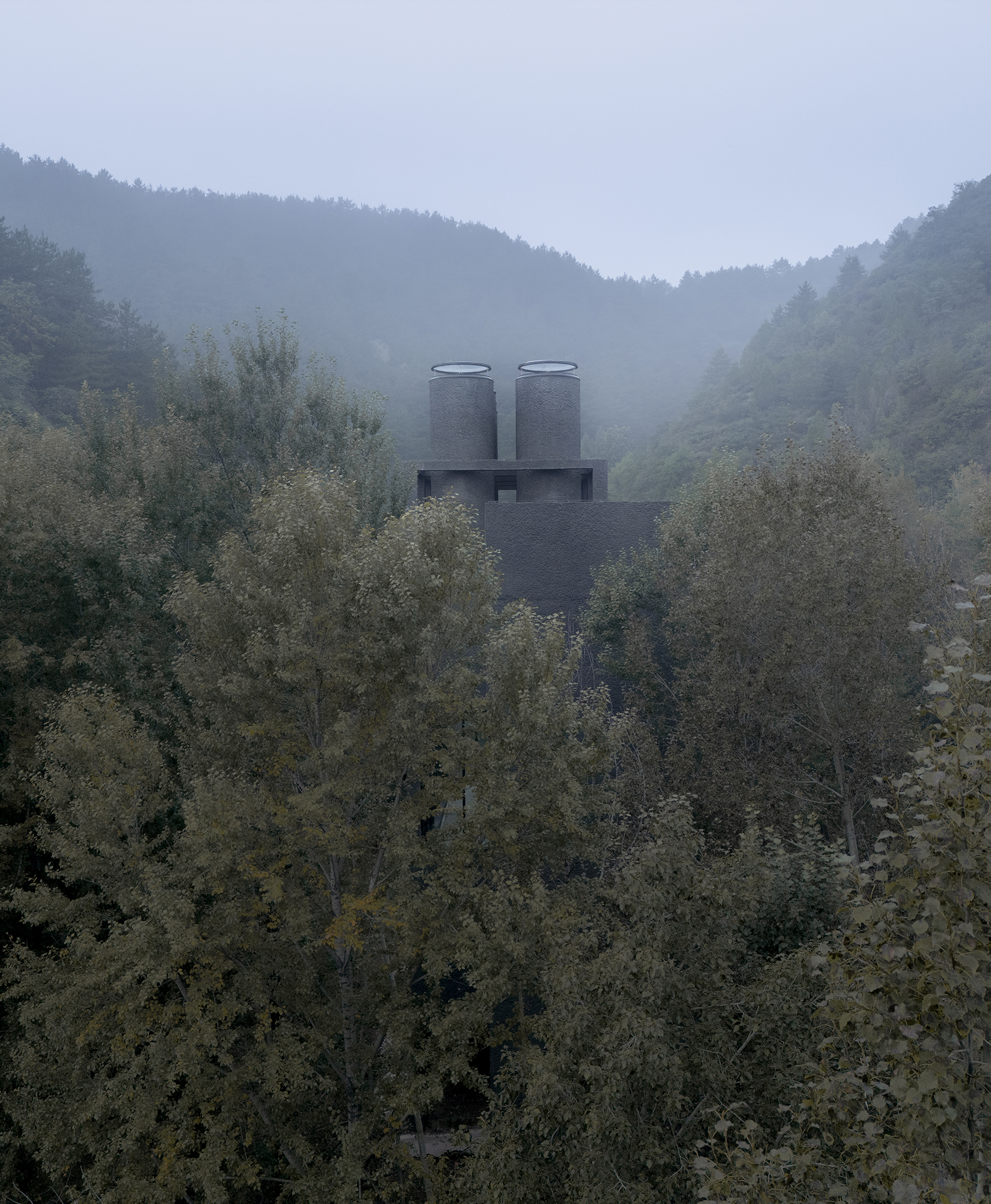 The spring house sits in a river valley, deep in the forests of Wuling Mountain, a branch of the scenic Yanshan Mountains in the northern part of Beijing. The site abuts a steep rock cliff to the west and opens out onto an expansive view of the alluvial plains to the east and the chain of mountains beyond. The site is densely populated with poplar trees and the ground is covered by reeds and grasses, with a stream slowly meandering from north to south through the site. The construction of a new residential community is underway nearby, where people will approach the building by crossing a steel arch bridge over the stream, strolling through the forest, and arrive at the entrance of the spring house.