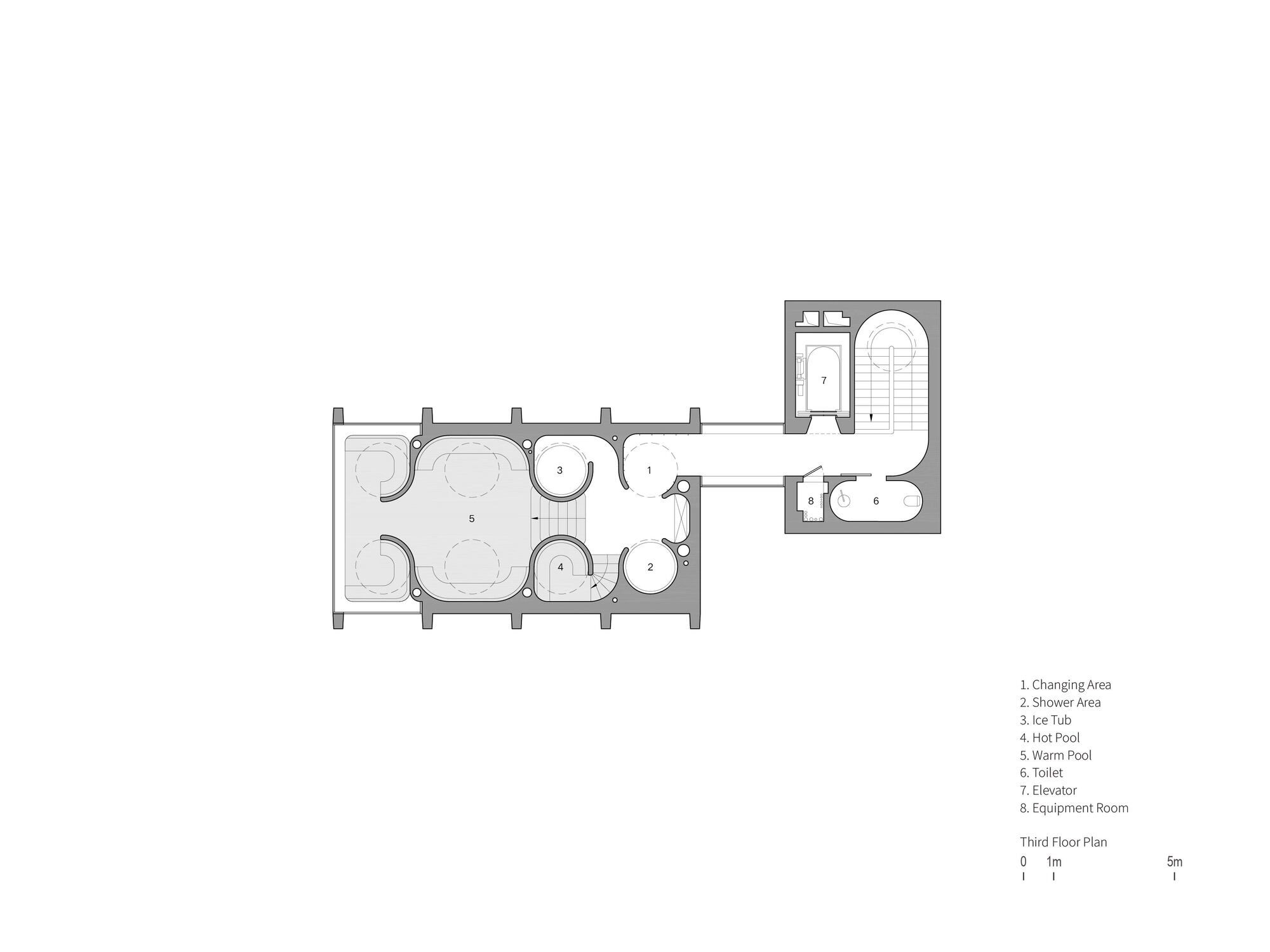 3층: 8개의 빛 우물 아래 배치된 온천은 자연광의 부드러운 확산으로 명상적인 분위기를 만들어냅니다.