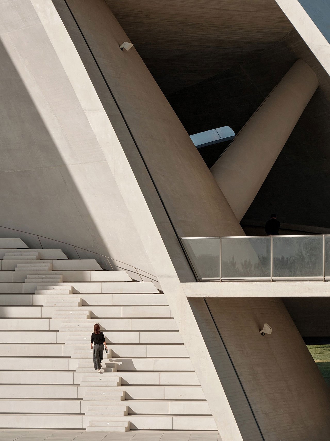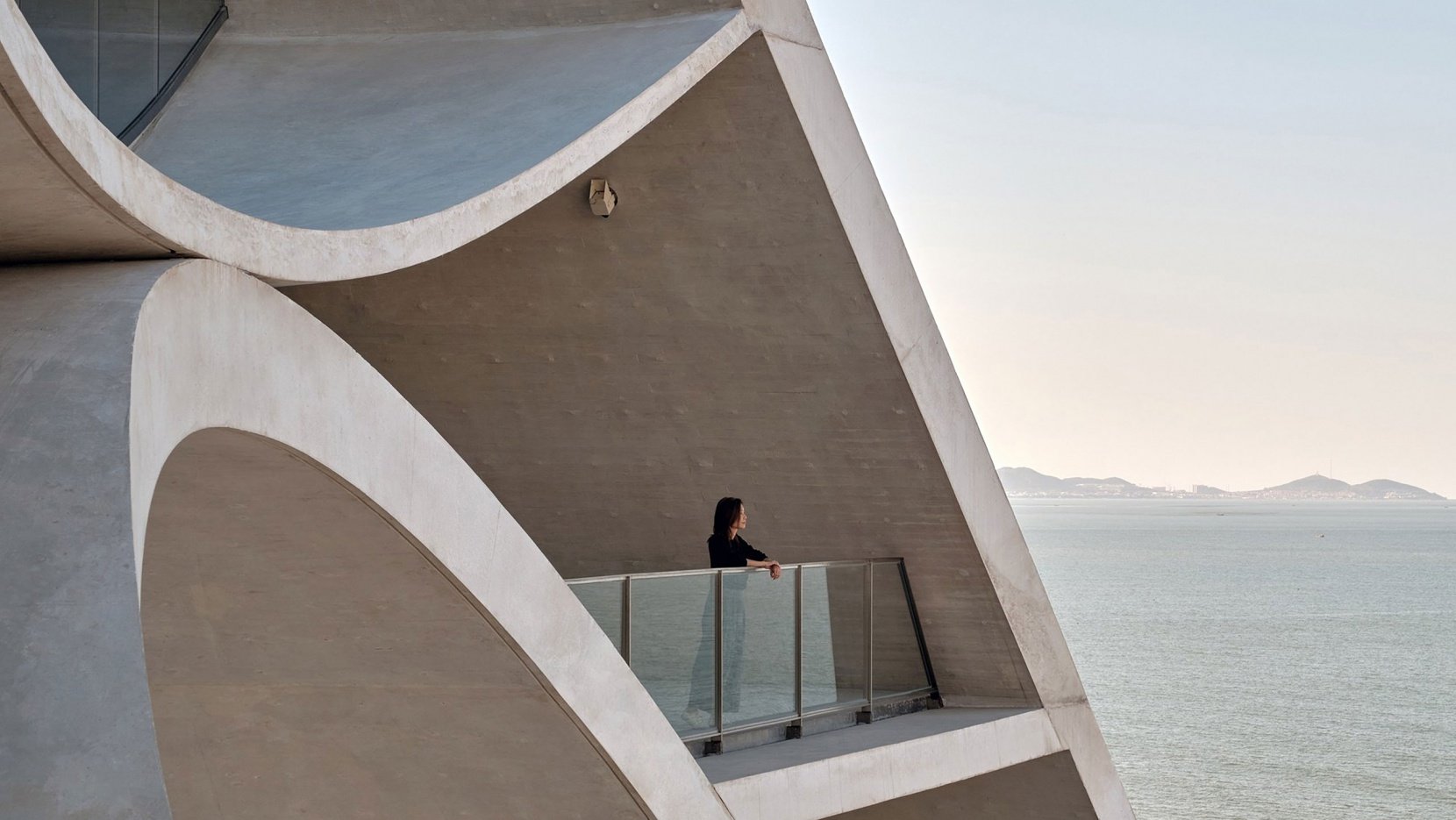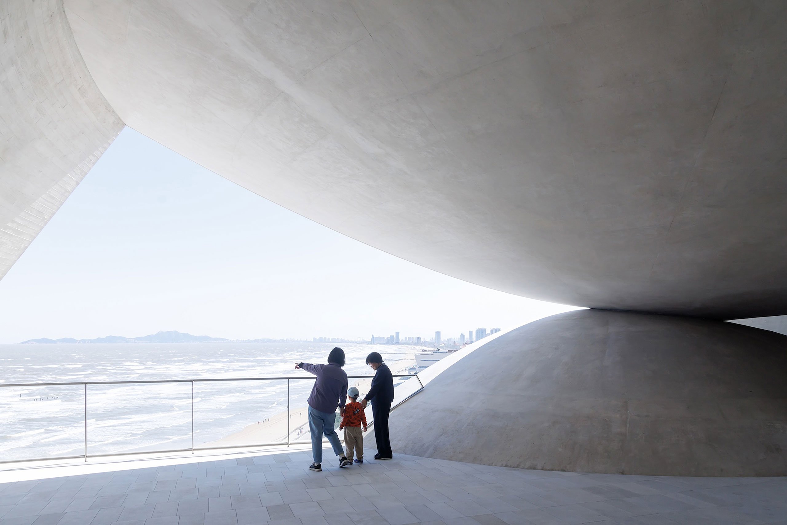 Engineered in collaboration with Arup, the Sun Tower is as functional as it is symbolic. Constructed with two layers of slanted white concrete shells, the structure is reinforced by an intricate network of horizontal slabs and ramps that brace its dynamic form, ensuring for durability against coastal conditions while fostering a seamless connection to the oceanfront.