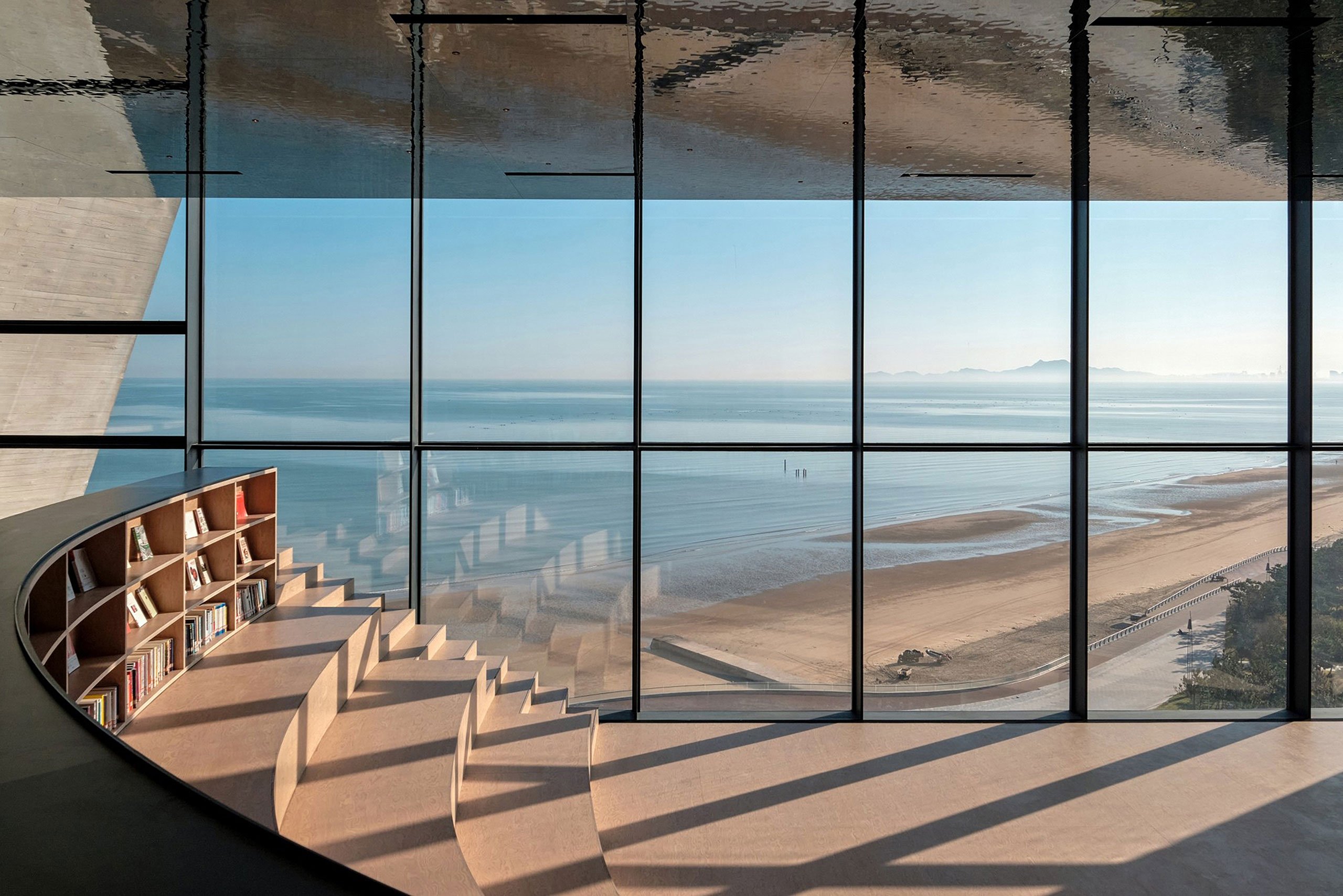 Standing majestically at the ocean’s edge in Yantai, China, the Sun Tower OPEN Architecture’s newly inaugurated cultural venue—is extraordinary in both form and concept. Its asymmetrical conical shape, dramatically bisected to reveal intricate inner workings, boldly stands apart from the city’s distant tower blocks. Far from an architectural folly, the Sun Tower’s design is deeply informed by the trajectory of the sun, its name evoking the region’s ancient sun-worshiping cultures and the watchtowers of the Ming Dynasty.