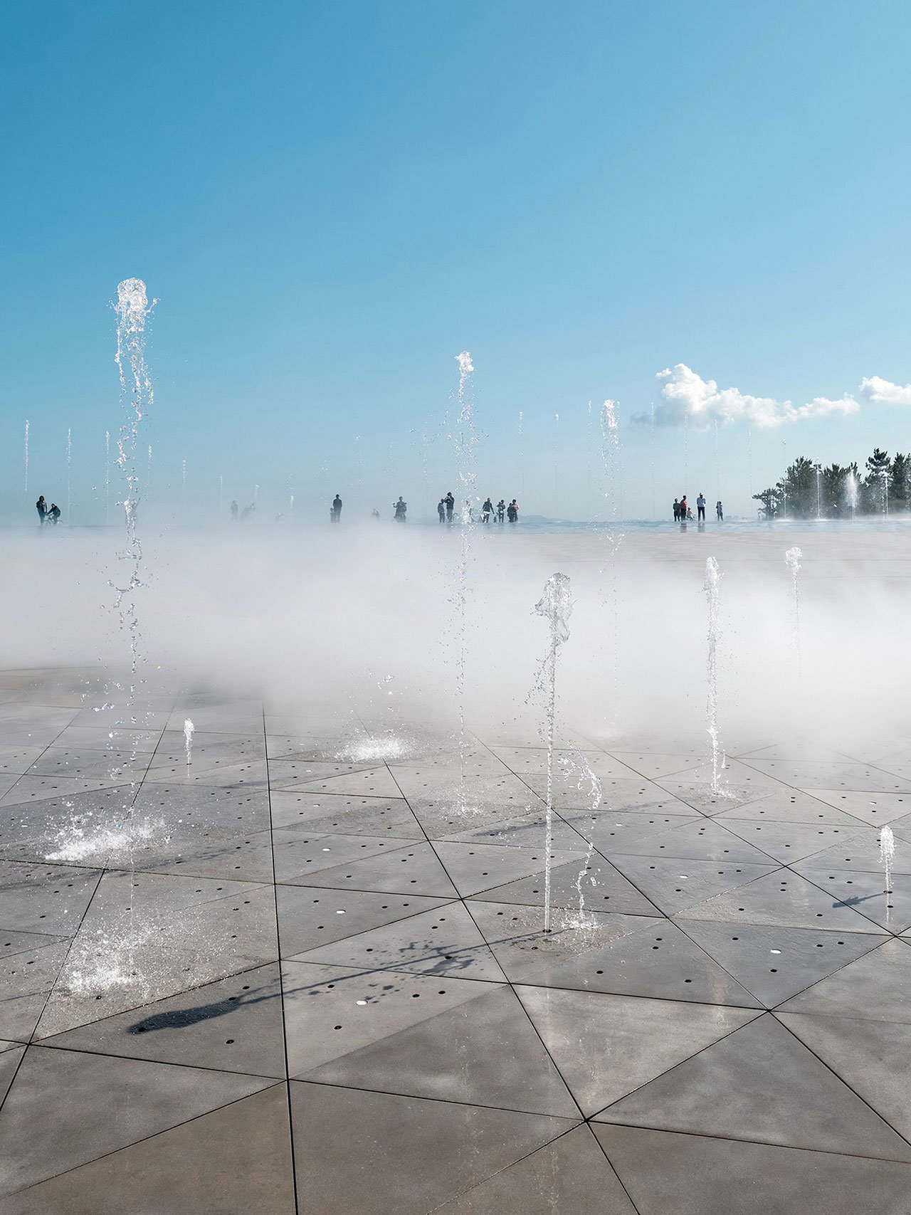 This cosmic connection extends beyond form. Facing the ocean, the building’s concave inner shell doubles as a natural sound collector, amplifying the sea’s rhythmic melodies. Visitors seated in the amphitheatre, nestled at the building’s base, are immersed in the sights and sounds of the waves. When it’s not hosting performances, the amphitheatre’s stage transforms into a tranquil space with misting fountains synchronized to the ocean tides, celebrating the 24 Solar Terms of the Chinese traditional lunar calendar. Concentric elliptical rings etched into the seashell shaped plaza that radiates towards the sea mimic planetary orbits further merging cultural symbolism with natural forces. During equinoxes, a water channel transversing the rings transforms the building into a giant solar clock: as the shadow of the tower’s northern edge tracks the channel’s path, it intersects the rings on the hour.