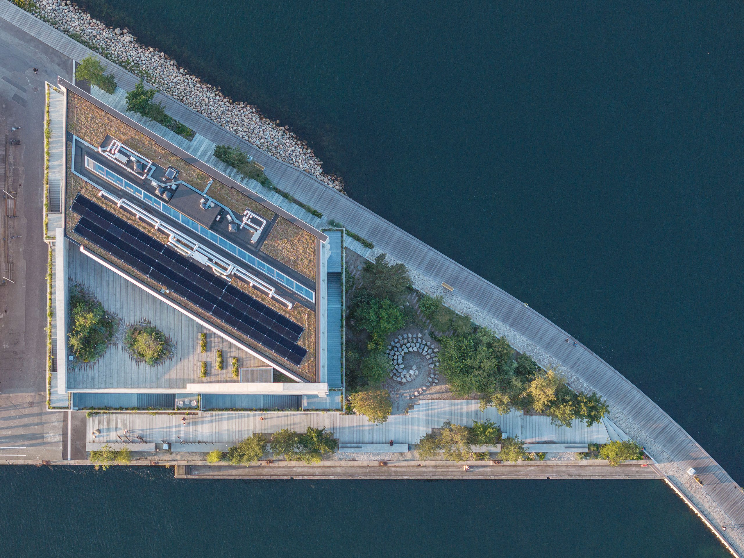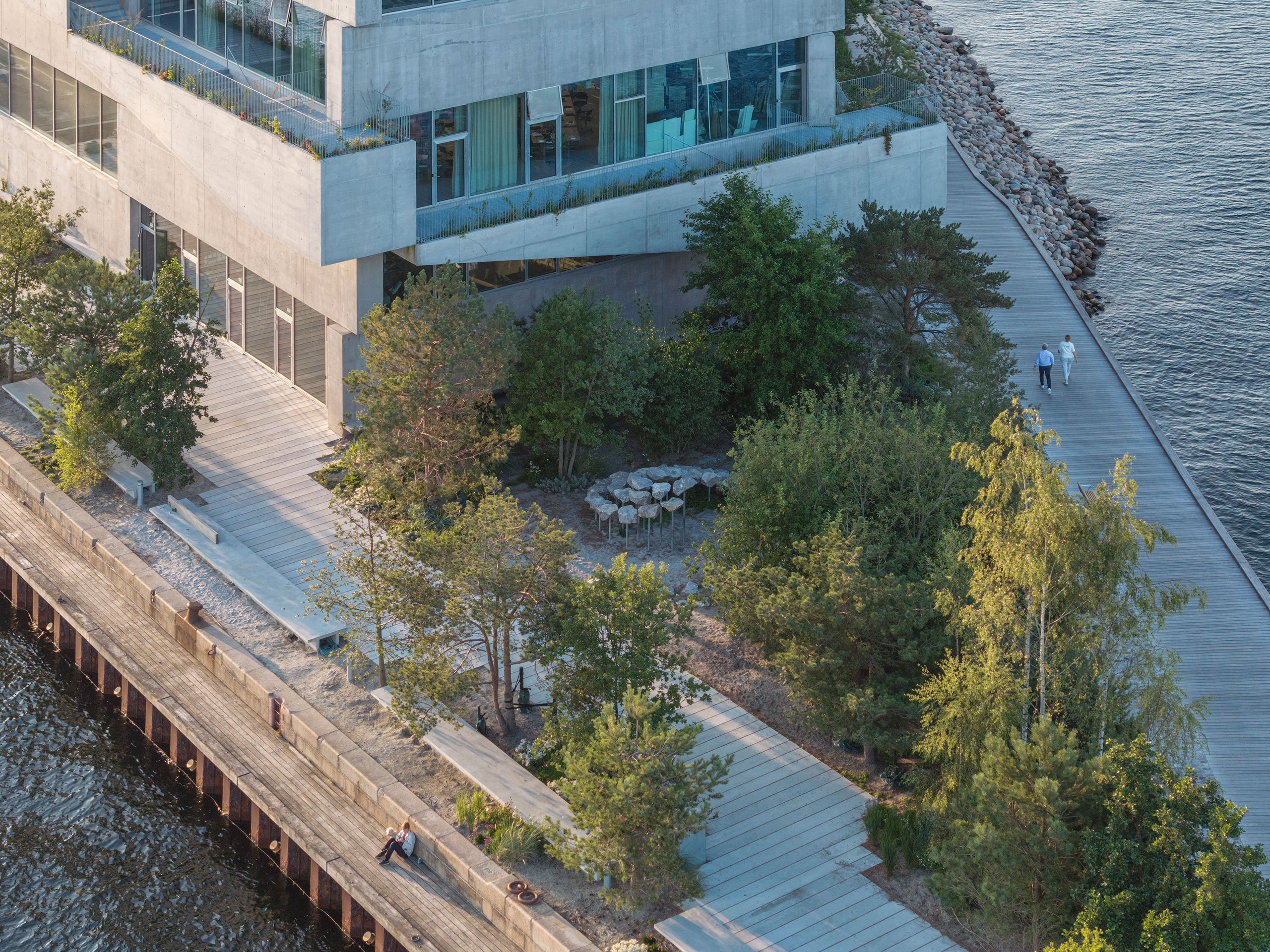 Along the outdoor staircase, a variety of wind-tolerant trees, shrubs, perennials, and herbs some of which are used in the studio’s canteen—soften the building’s concrete mass. The rooftop terrace, paved with sustainably sourced wood from a local sawmill, extends the natural theme, offering an inviting space where employees and guests can enjoy panoramic views of the city and harbour. At the building’s base, BIG’s Landscape team has transformed a former parking area into a 1,500-square-metre public park featuring native forest trees such as pines and oaks, among which lies a sculpture by American artist Benjamin Langholz, consisting of 40 stones arranged in a spiral form.
