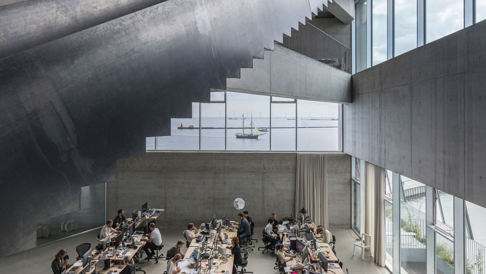 Equally ingenious is the 140-metre long external staircase that spirals around the building from the quayside all the way to the rooftop terrace. This staircase enables movement between floors along the building’s exterior, functioning as a secondary fire escape while also providing each level with an outdoor terrace. Together with the placement of vertical circulation elements, such as the elevator and secondary staircase, along the building’s northern edge, this design eliminates the need for a traditional core structure, allowing the primary workspaces to remain fluid and expansive, maximizing natural light and unobstructed views.