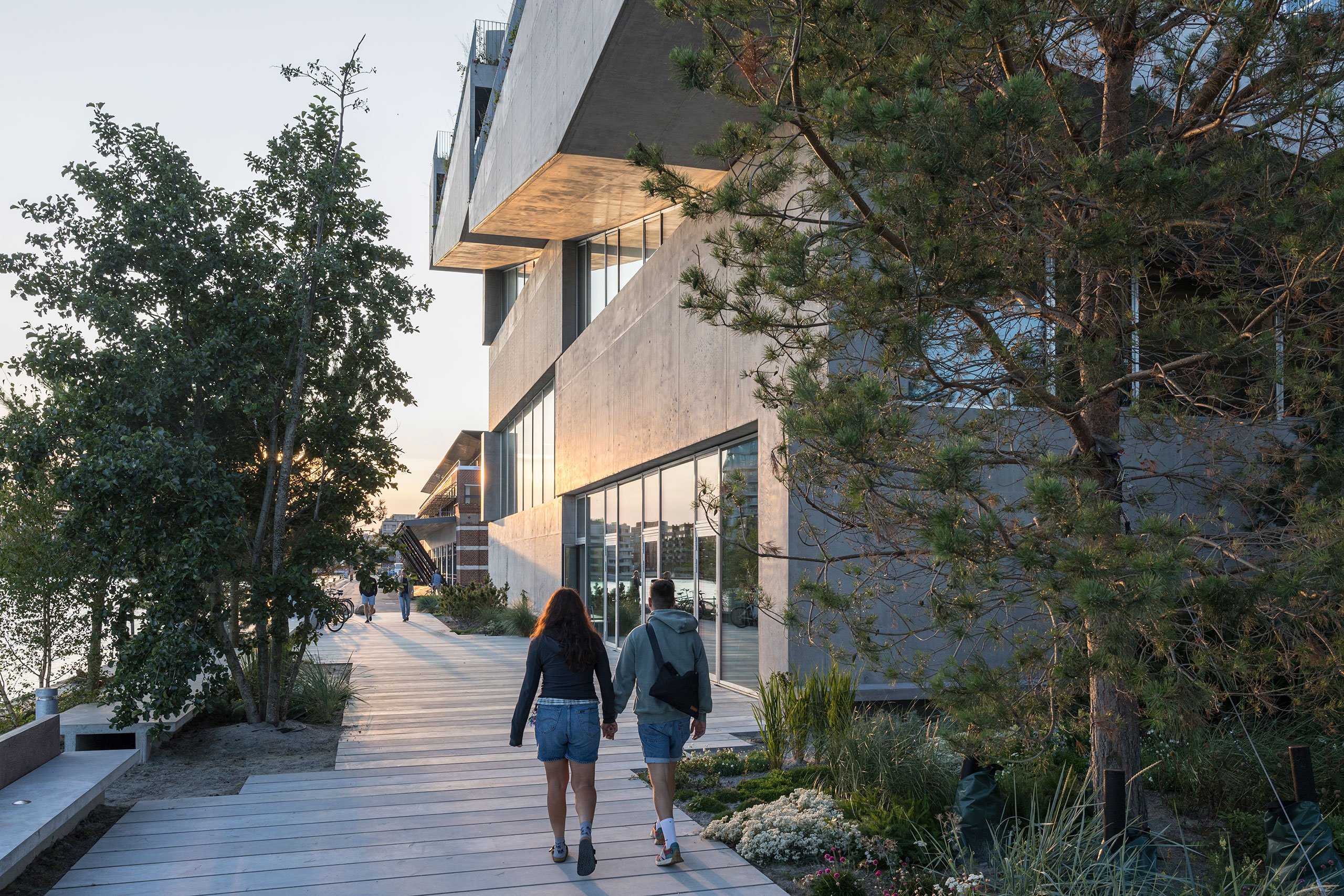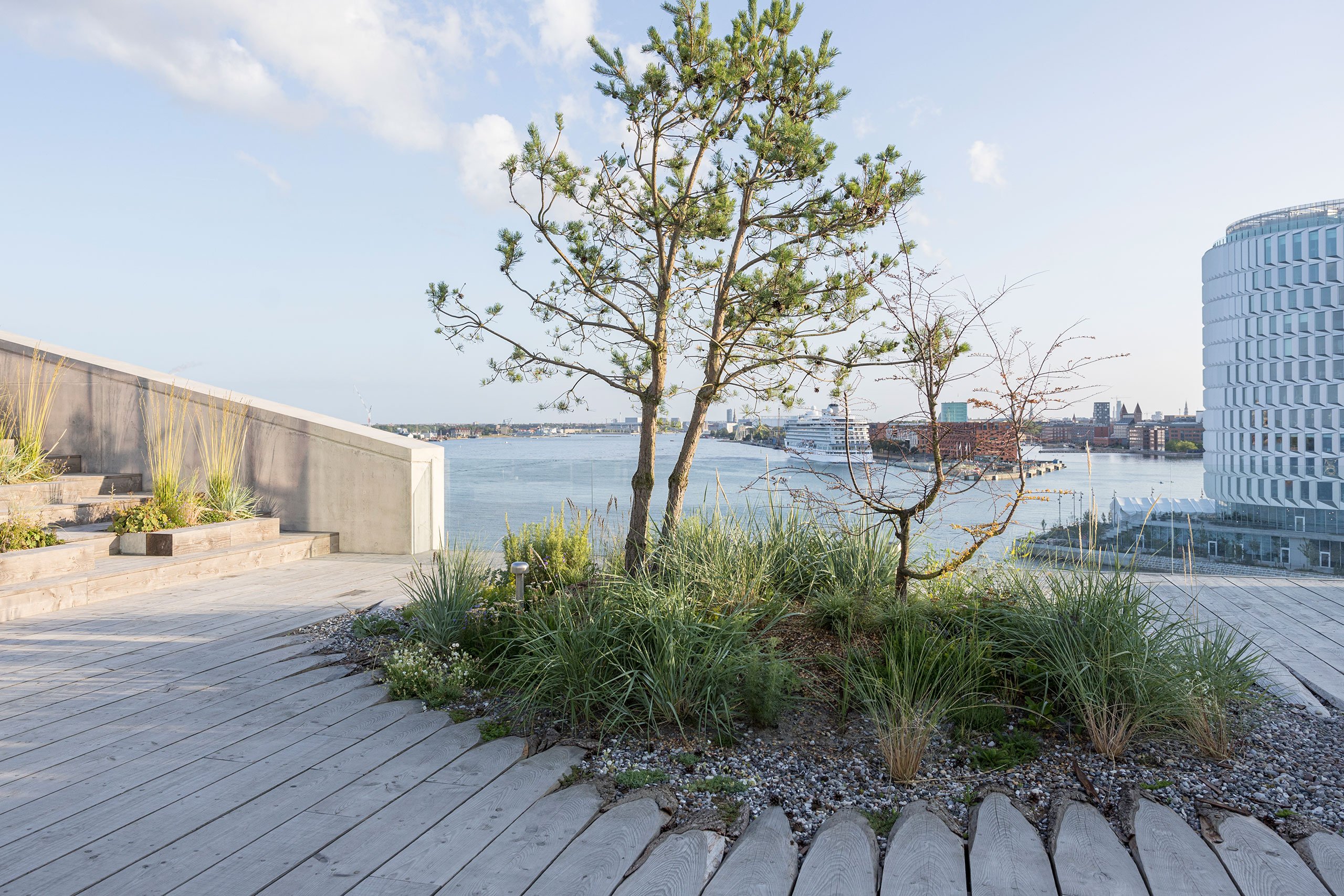 설계자는 풍부한 식생과 조경 디자인을 통해 건물이 주변 환경과 자연스럽게 융화되도록 했으며, 이를 통해 지역 주민들에게 지속 가능성과 친환경 공간을 제공하고 있습니다. 또한, 외부 계단은 조경과 통합되어 도시에서 보기 드문 자연과의 긴밀한 연결을 만들어냅니다. 옥상 테라스는 지역 제재소에서 지속 가능하게 조달한 목재로 포장되어 있으며, 도시와 항구의 파노라마 뷰를 제공합니다. 옥상과 주변 공원은 지역 주민들에게 개방되어 공공과의 상호 작용을 촉진합니다.