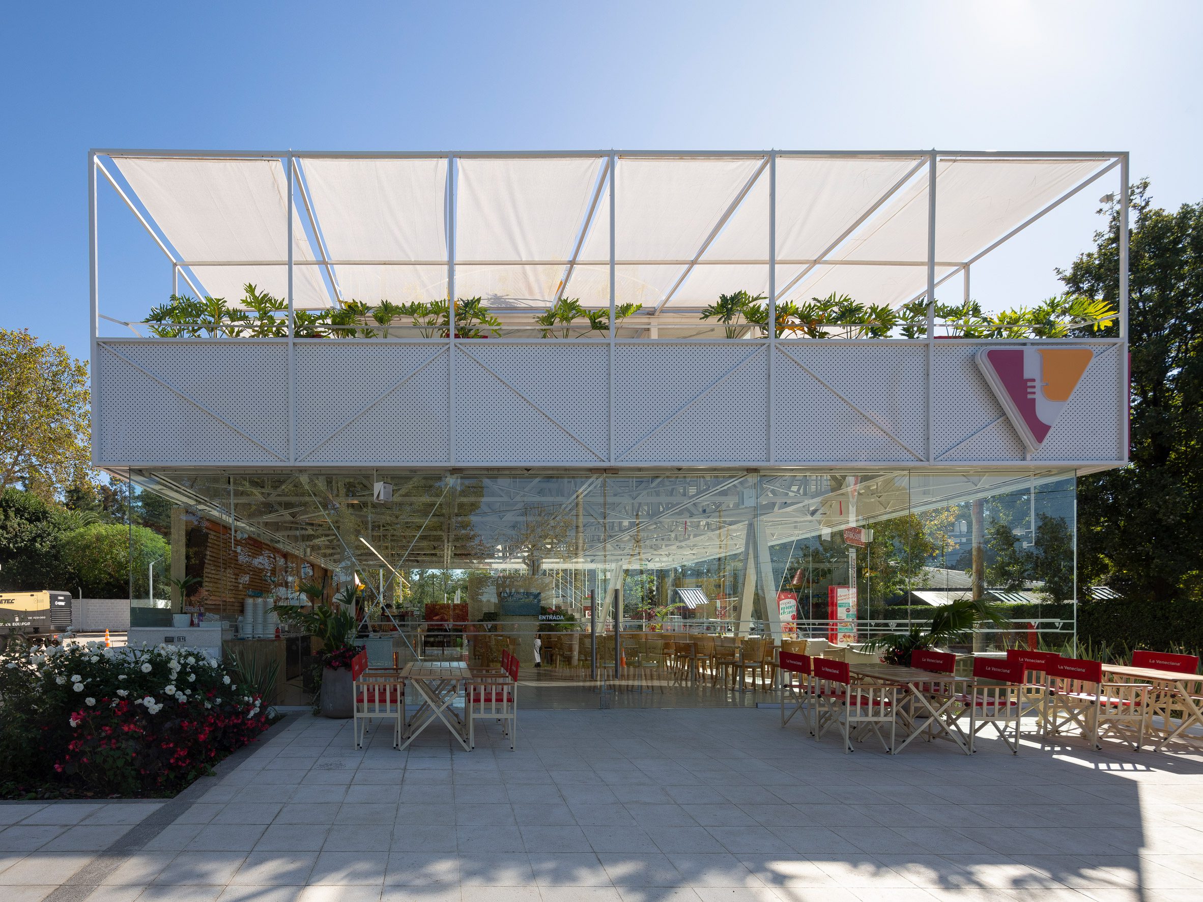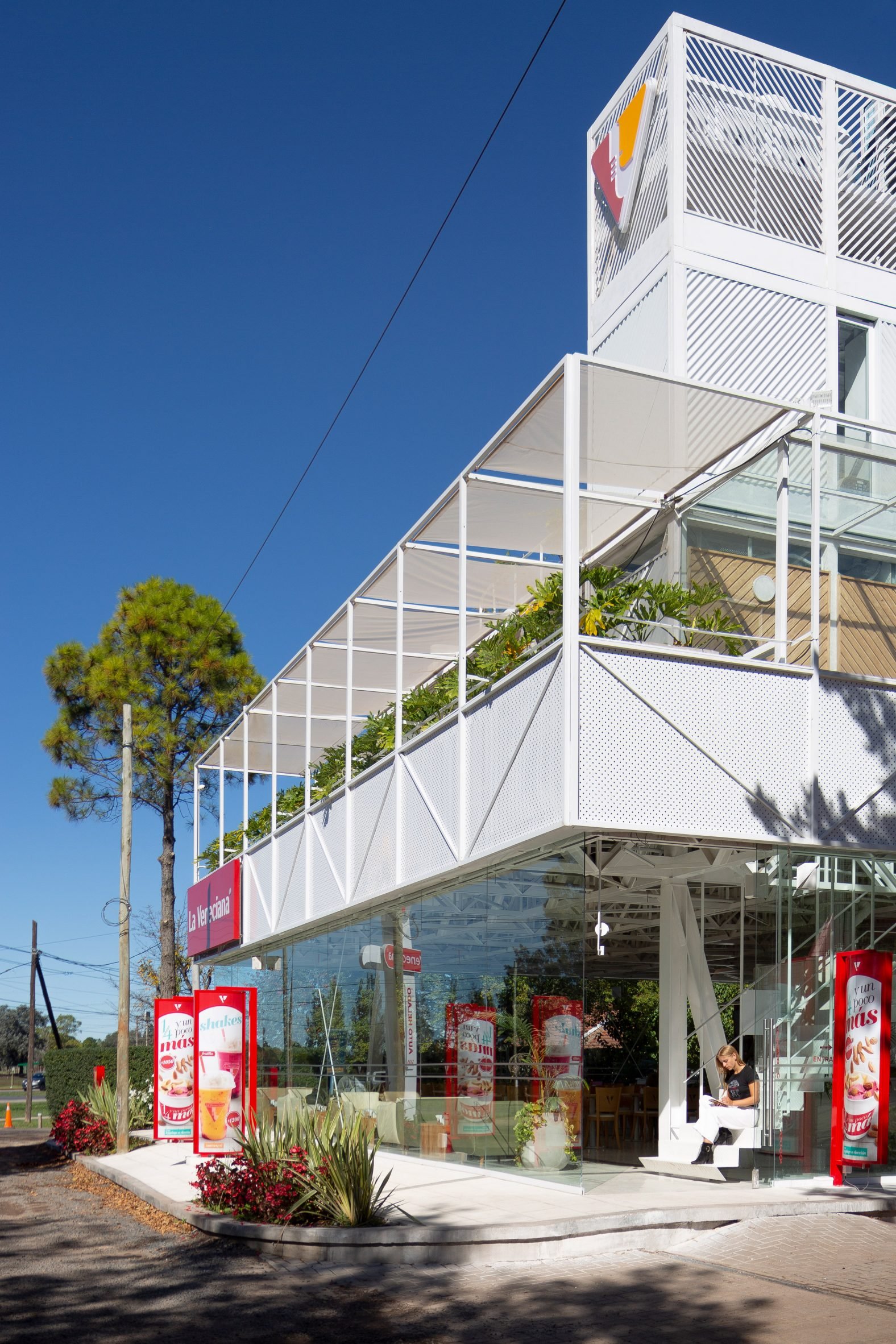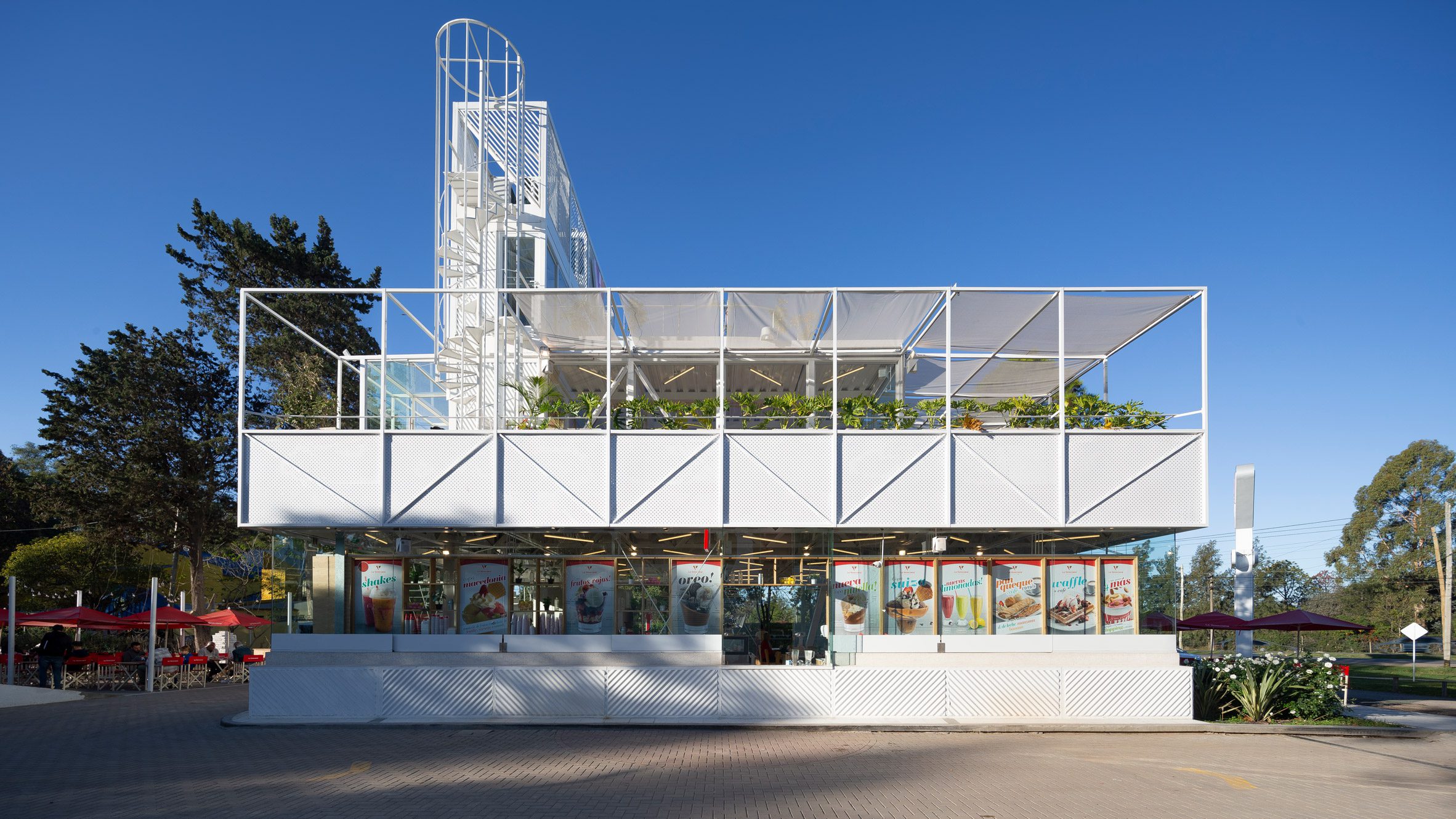 Local studio DRM Arquitectura has designed a space-framed drive-through ice cream parlour lifted on inverted V-shaped columns in Buenos Aires, Argentina.