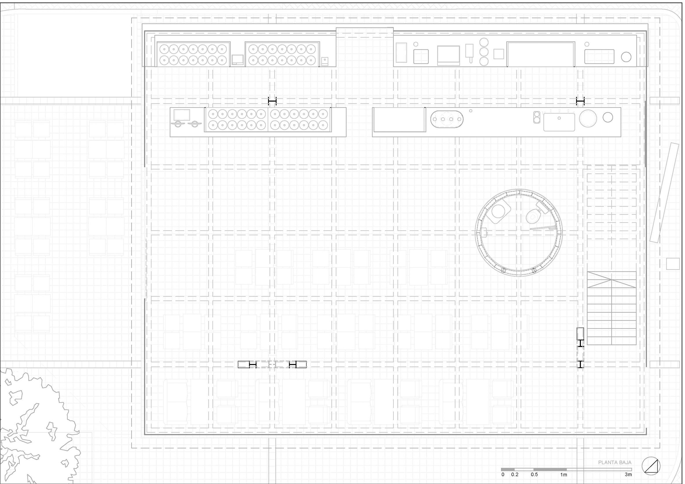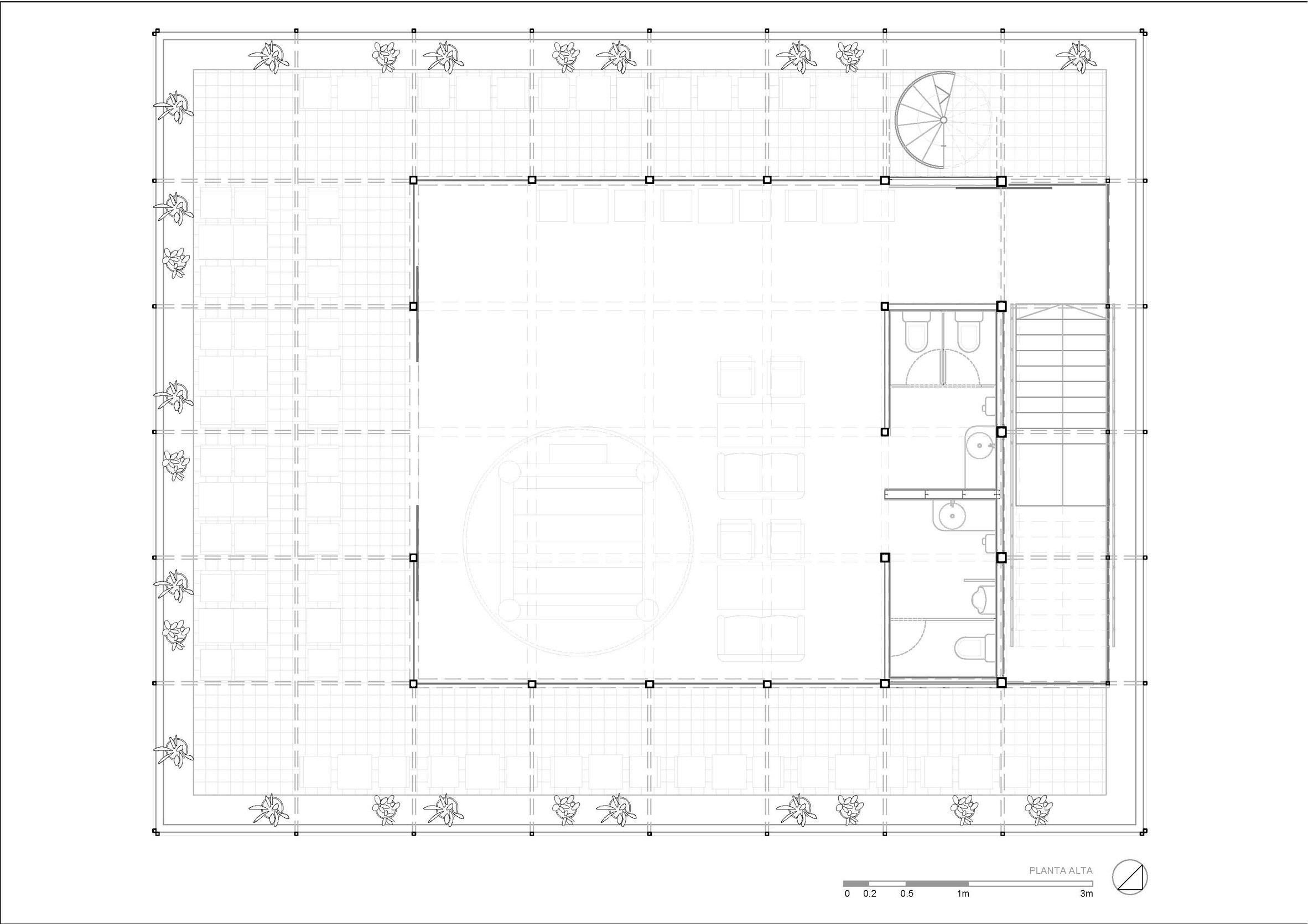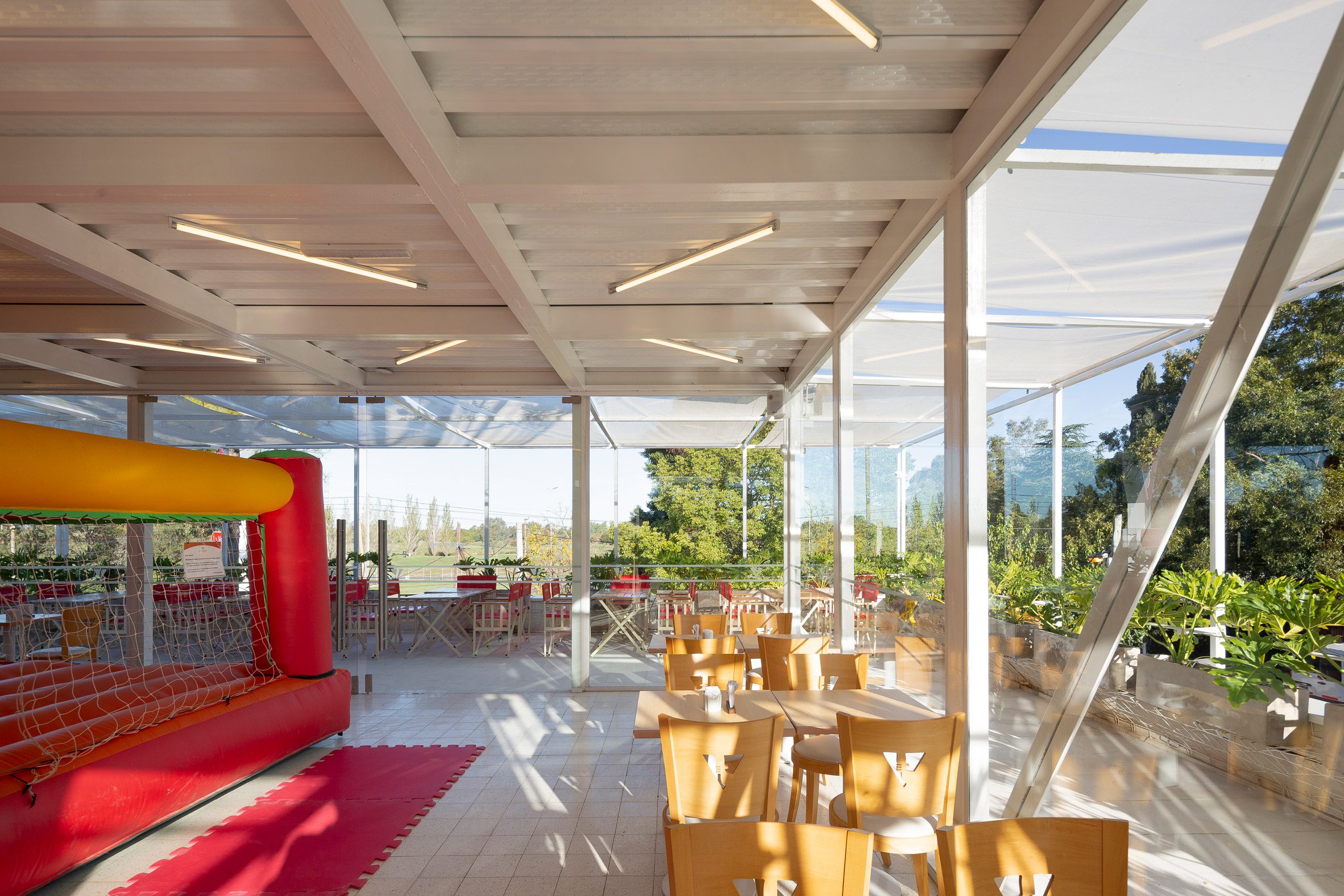 Meanwhile, the upper floor is wrapped in a perimeter terrace shaded by a series of pergolas that control light and open dining space to the sounds and sights of the city. The interior of the upper floor houses an isolated children's play area.