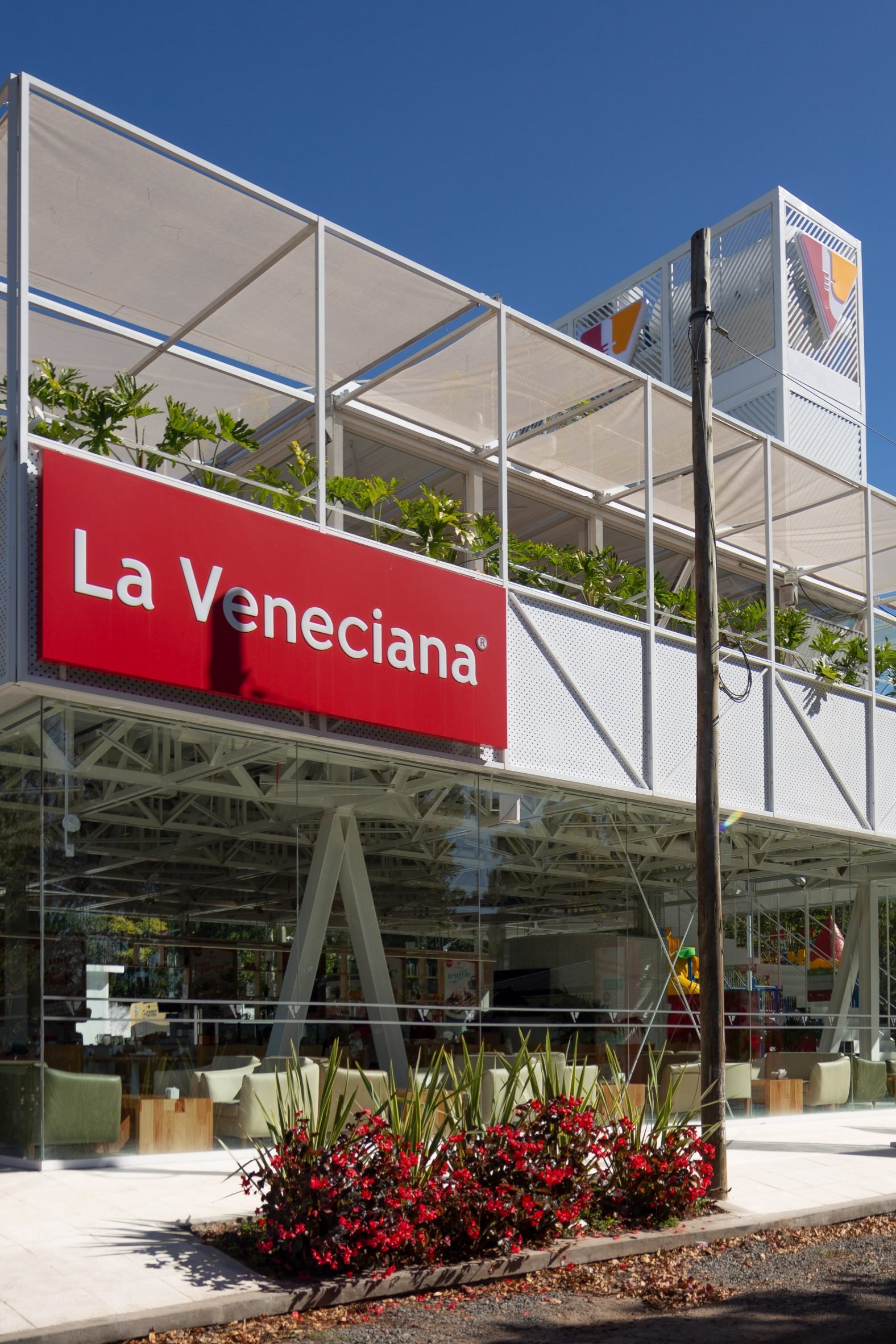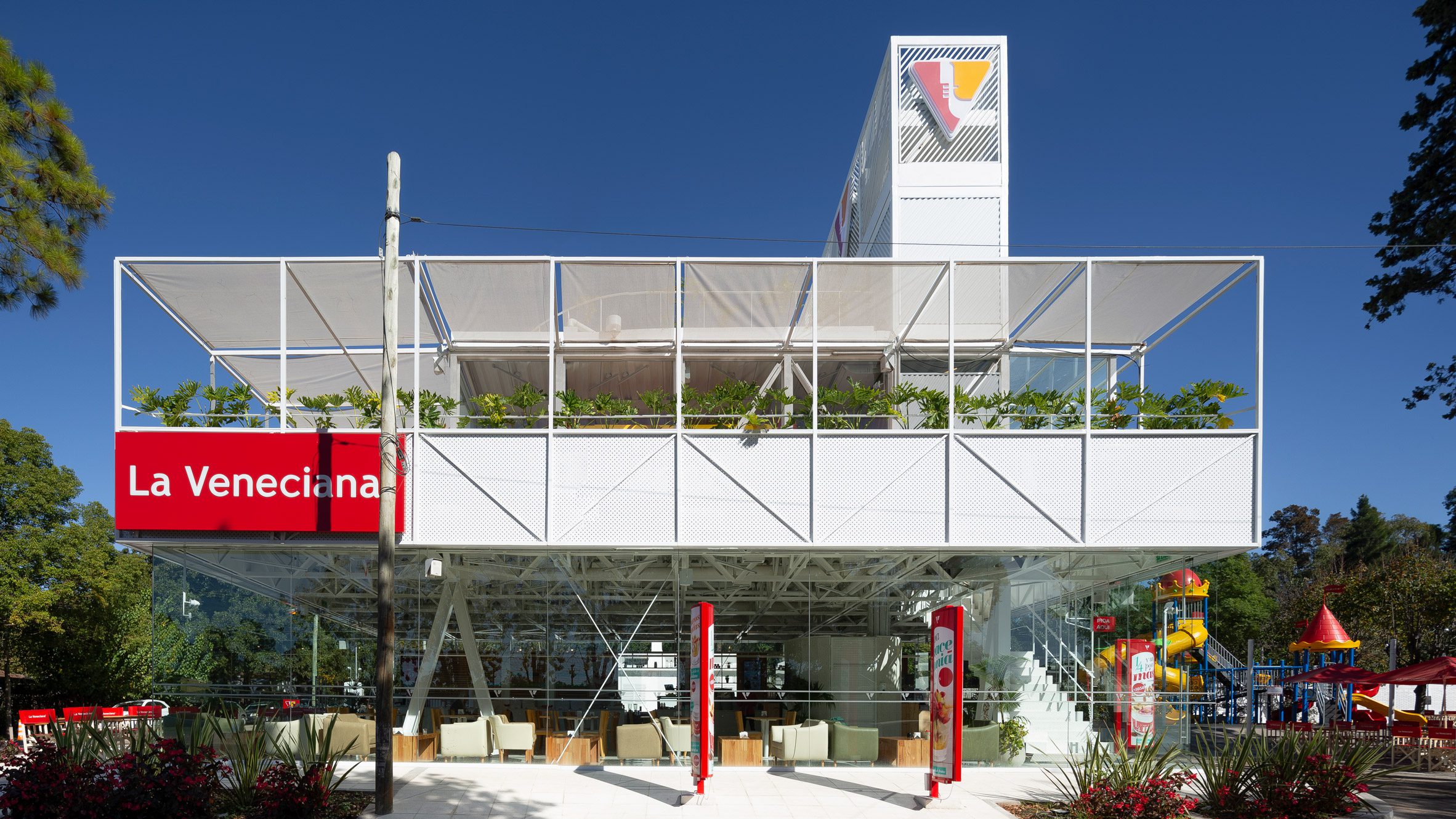 The Veneciana Canning Ice Cream Drive Thru is situated on a busy roadside plot near National Route No. 58 that challenged the DRM Arquitectura team to create a calm atmosphere without disconnecting from the fast access road.