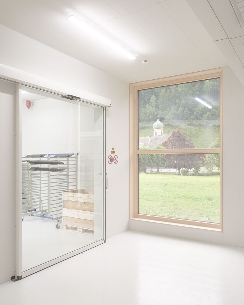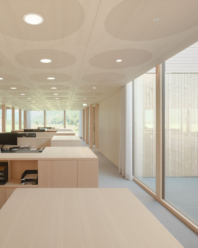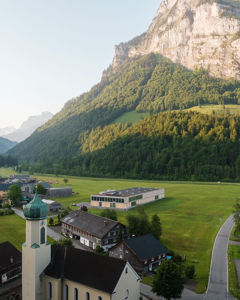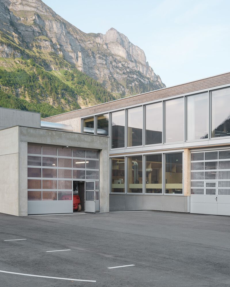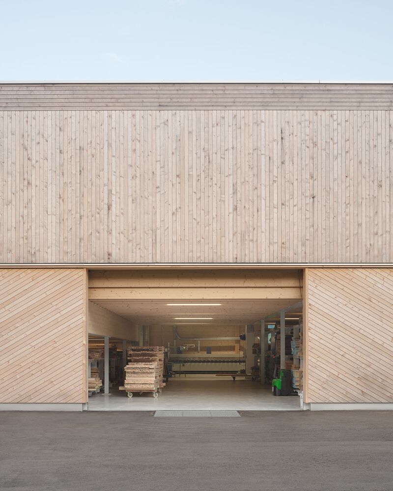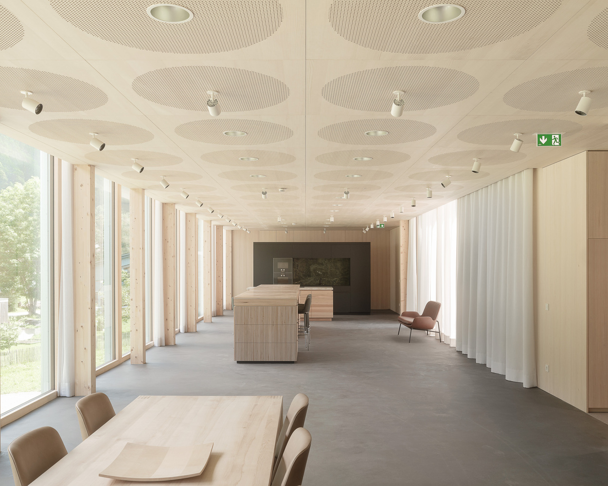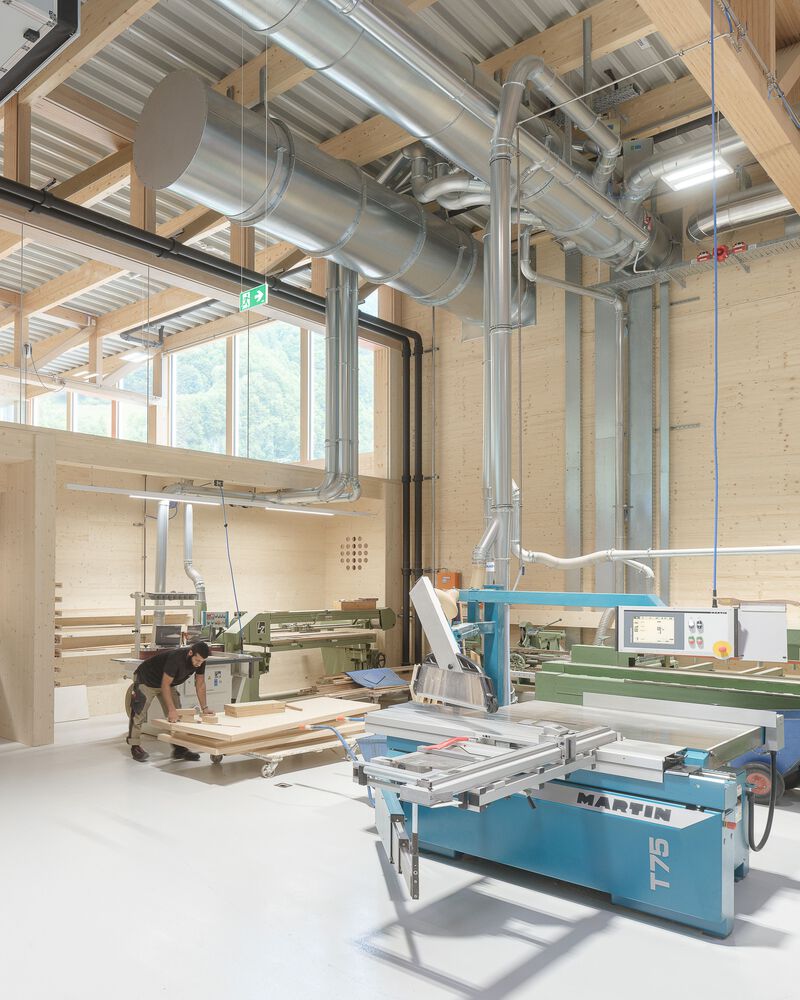 Project - The new building is confidently positioned on the green area in front of the town, which extends along the entire length of the mighty Kanisfluh. Thanks to the clarity of the finely structured wooden façade and the economical height development, the building absorbs the essential characteristics of the location and is thus able to integrate into the structural fabric of the village. The facade openings are precisely placed and generate varied panoramas of the mountain landscape for the users. The production hall is also equipped with roof glazing, which enables extremely uniform and glare-free lighting. All material and passenger traffic is clearly handled via the eastern facade, which meant that the remaining sides of the building could be designed free of logistical requirements. While the machine hall and the crafts area were designed to be extra high (two-story height) for reasons of long term flexibility and clarity within the building, the northern part of the building has two floors with the surface workshop on the ground floor and the office, employee and customer rooms on the upper floor.