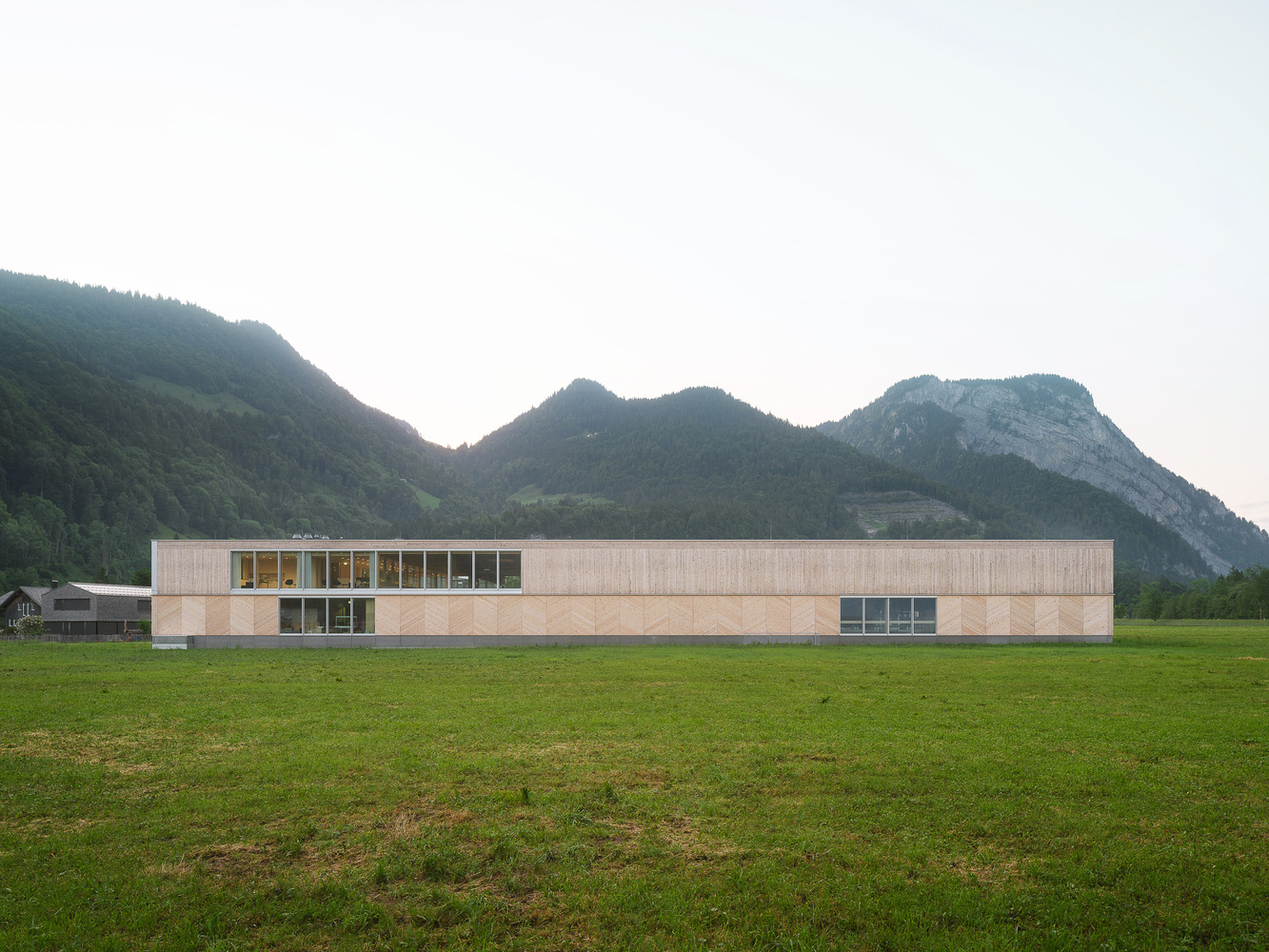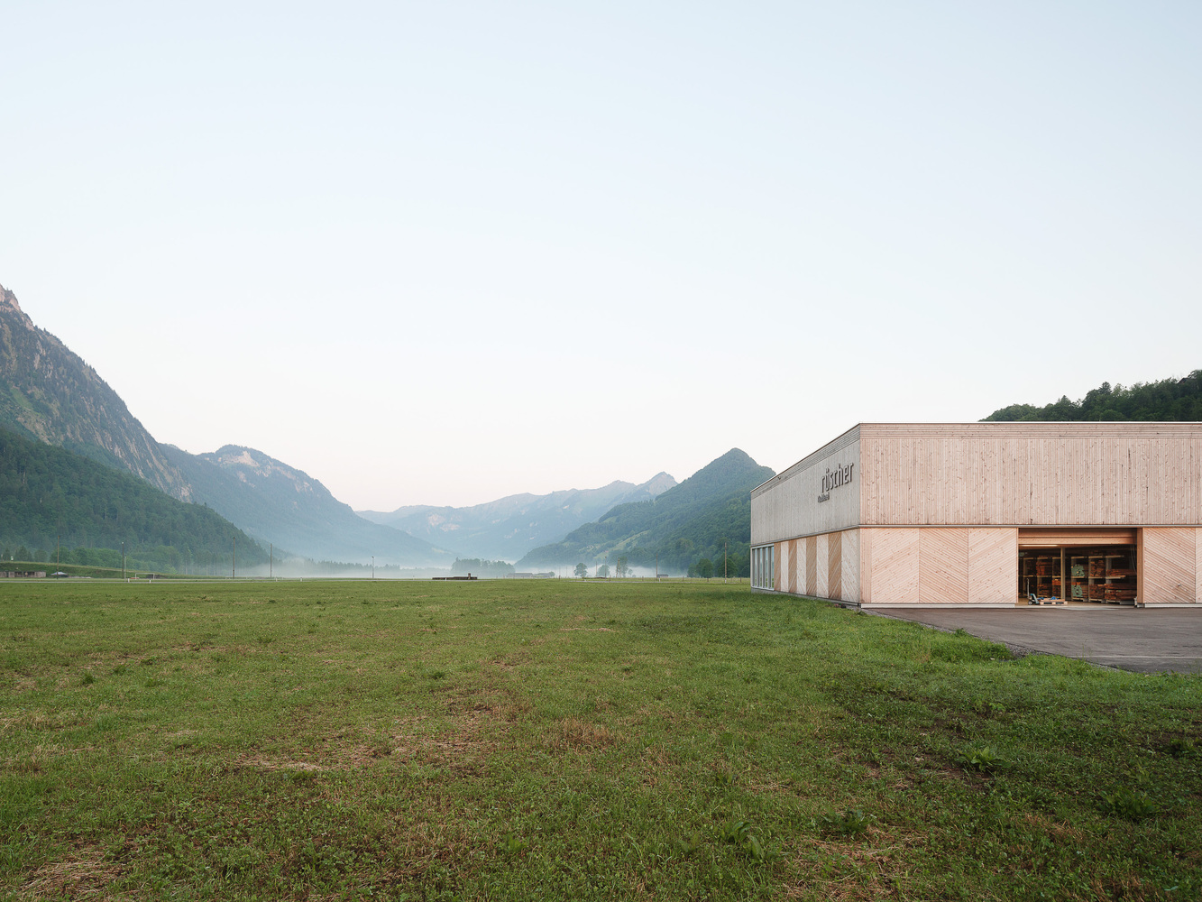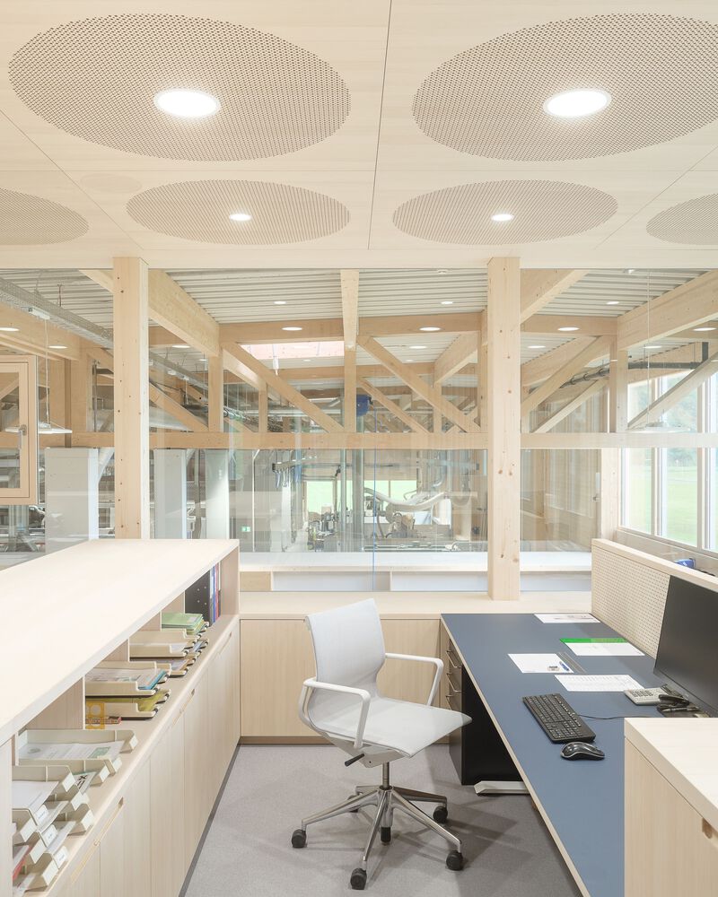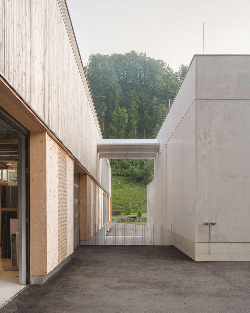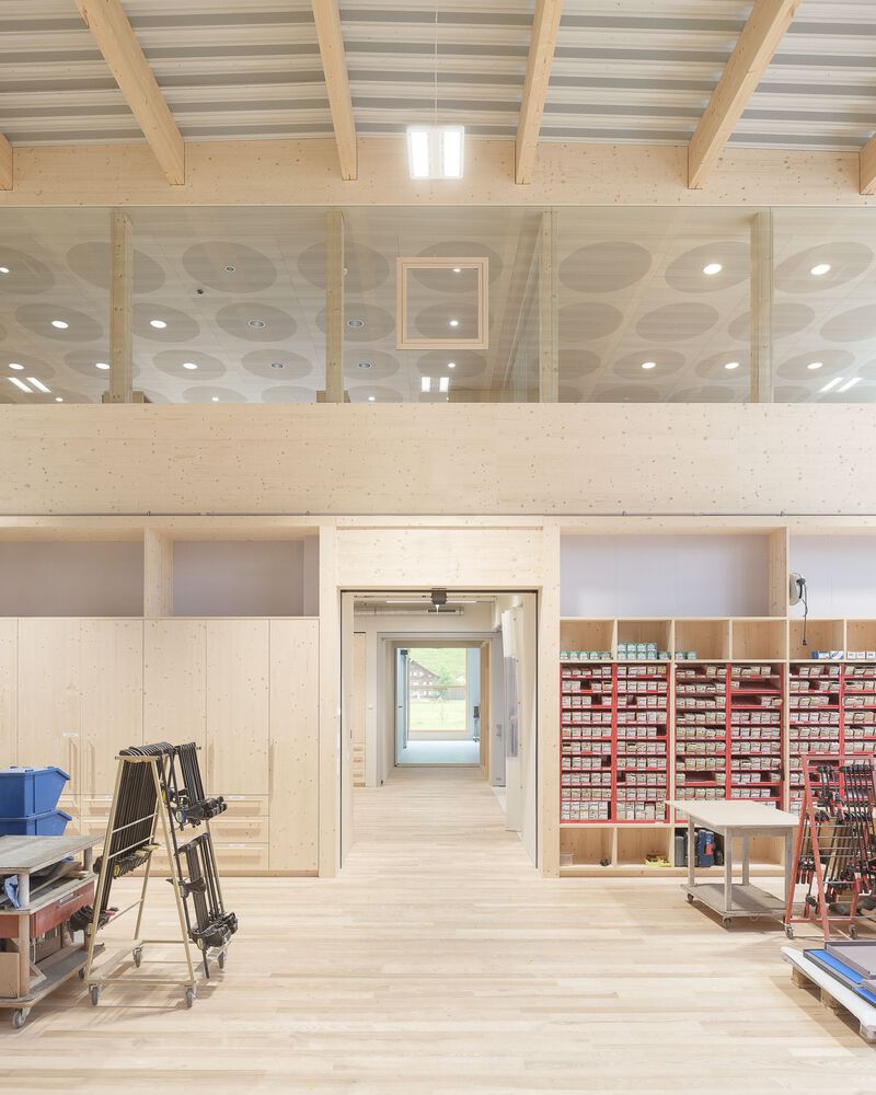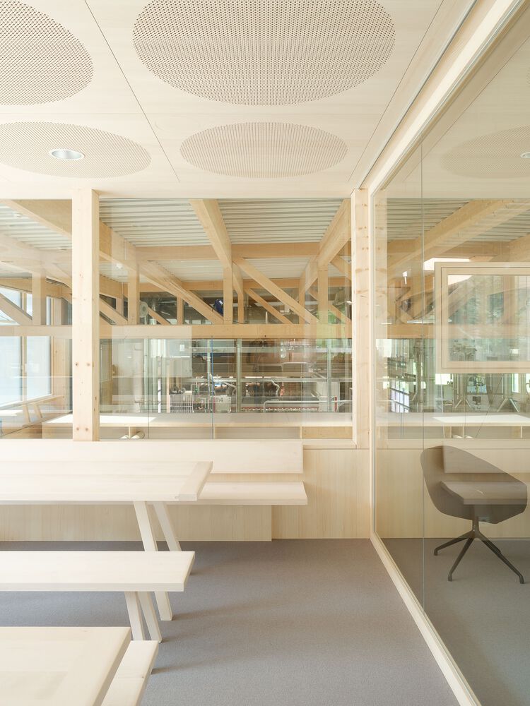 Project - The new building is confidently positioned on the green area in front of the town, which extends along the entire length of the mighty Kanisfluh. Thanks to the clarity of the finely structured wooden façade and the economical height development, the building absorbs the essential characteristics of the location and is thus able to integrate into the structural fabric of the village. The facade openings are precisely placed and generate varied panoramas of the mountain landscape for the users. The production hall is also equipped with roof glazing, which enables extremely uniform and glare-free lighting. All material and passenger traffic is clearly handled via the eastern facade, which meant that the remaining sides of the building could be designed free of logistical requirements. While the machine hall and the crafts area were designed to be extra high (two-story height) for reasons of long term flexibility and clarity within the building, the northern part of the building has two floors with the surface workshop on the ground floor and the office, employee and customer rooms on the upper floor.