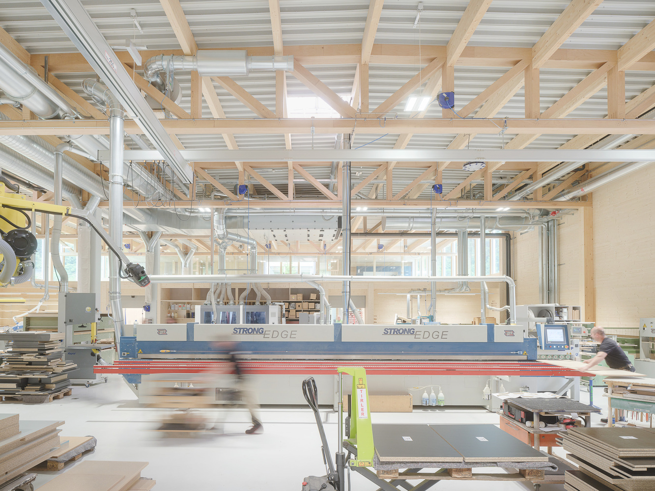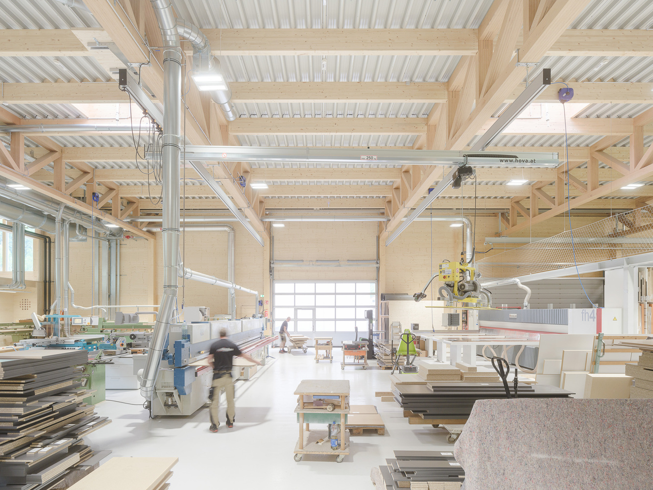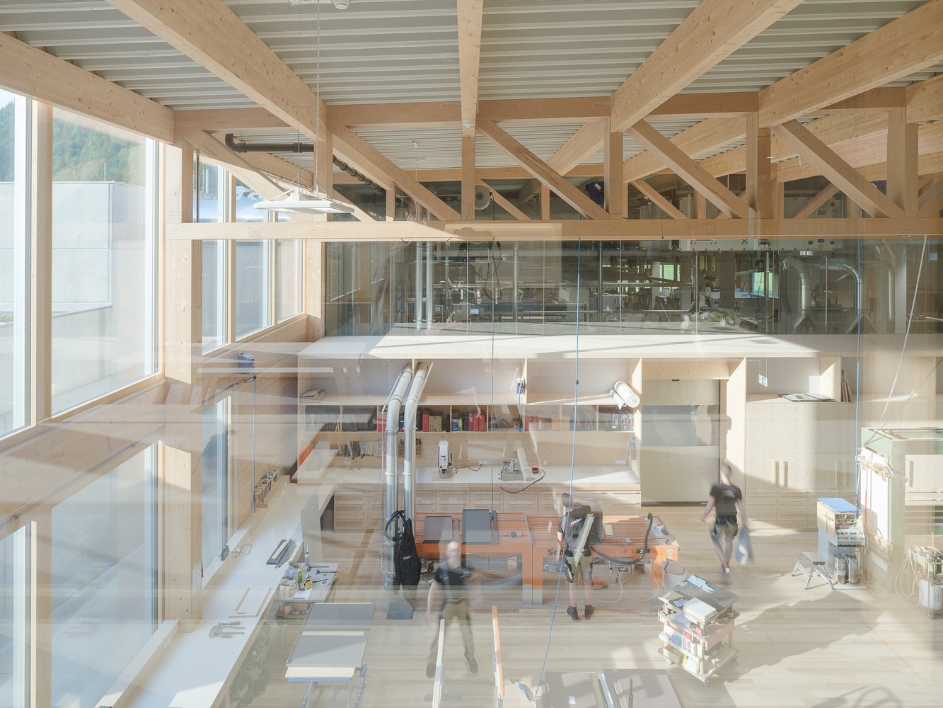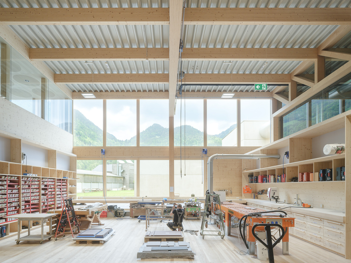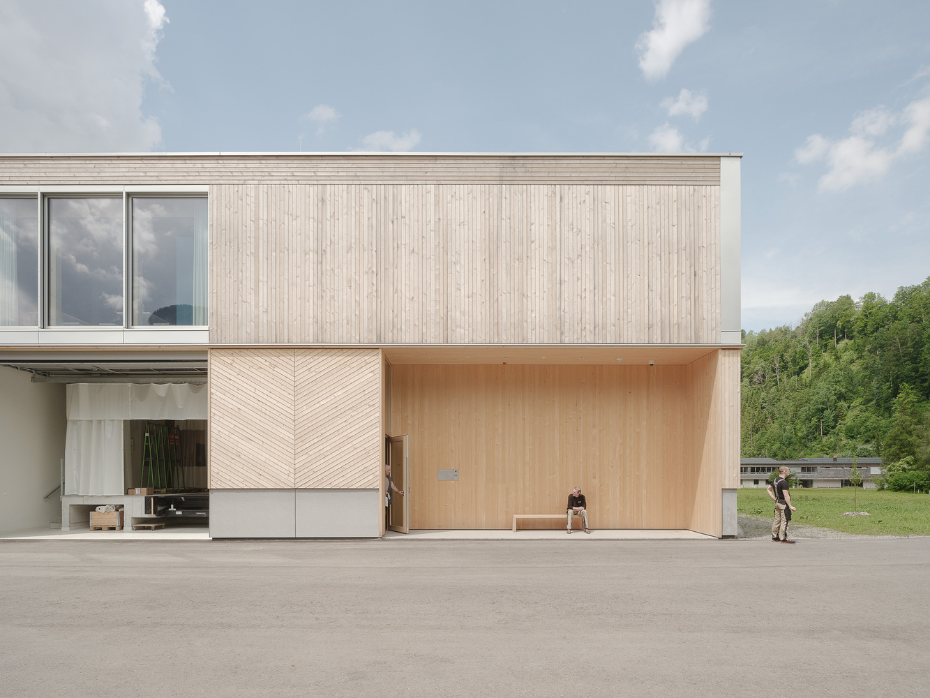 Project - The new building is confidently positioned on the green area in front of the town, which extends along the entire length of the mighty Kanisfluh. Thanks to the clarity of the finely structured wooden façade and the economical height development, the building absorbs the essential characteristics of the location and is thus able to integrate into the structural fabric of the village. The facade openings are precisely placed and generate varied panoramas of the mountain landscape for the users. The production hall is also equipped with roof glazing, which enables extremely uniform and glare-free lighting. All material and passenger traffic is clearly handled via the eastern facade, which meant that the remaining sides of the building could be designed free of logistical requirements. While the machine hall and the crafts area were designed to be extra high (two-story height) for reasons of long term flexibility and clarity within the building, the northern part of the building has two floors with the surface workshop on the ground floor and the office, employee and customer rooms on the upper floor.