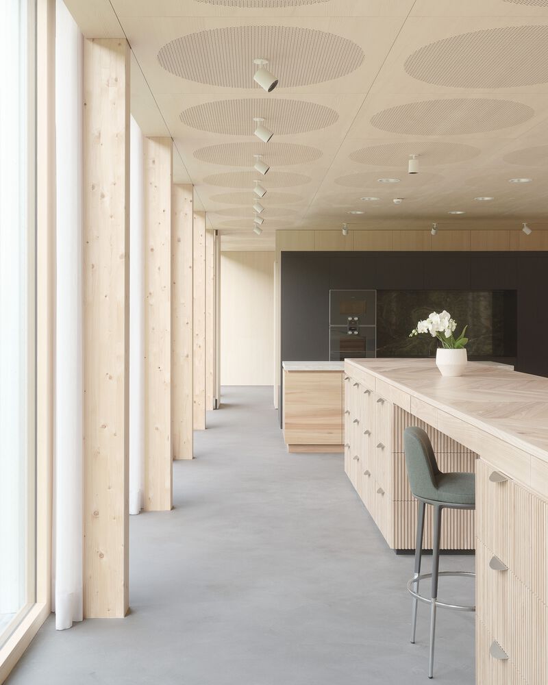 건물은 장기적인 사용과 가변성을 염두에 두고 설계되었습니다. 2층으로 구성된 북쪽 섹션은 표면 작업 공간과 사무실, 회의실 등을 포함하며, 이는 직원과 고객 간의 효율적인 소통을 가능하게 합니다. 작업 공간은 높은 층고와 개방된 레이아웃을 통해 다양한 작업을 지원하며, 전시 공간은 방문객과 마을 주민을 위한 열린 플랫폼으로 기능합니다. 이러한 공간 구성은 Rüscher Joinery가 단순한 작업장이 아니라 지역 사회와 소통하는 공간임을 강조합니다.