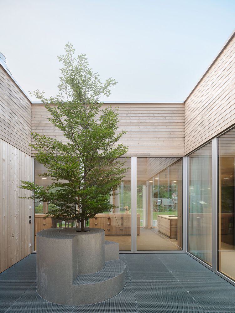 The open structure around the inner courtyard on the upper floor offers an overview for both customers and employees and guarantees the best lighting conditions and the highest quality of stay. While the exhibition space opens to the north towards the town center, the office spaces face the interior of the building for production. The use of trusses made of beech wood opens up unrestricted views of both the wooden structure of the workshop and the varied landscape of the rear Bregenzerwald.