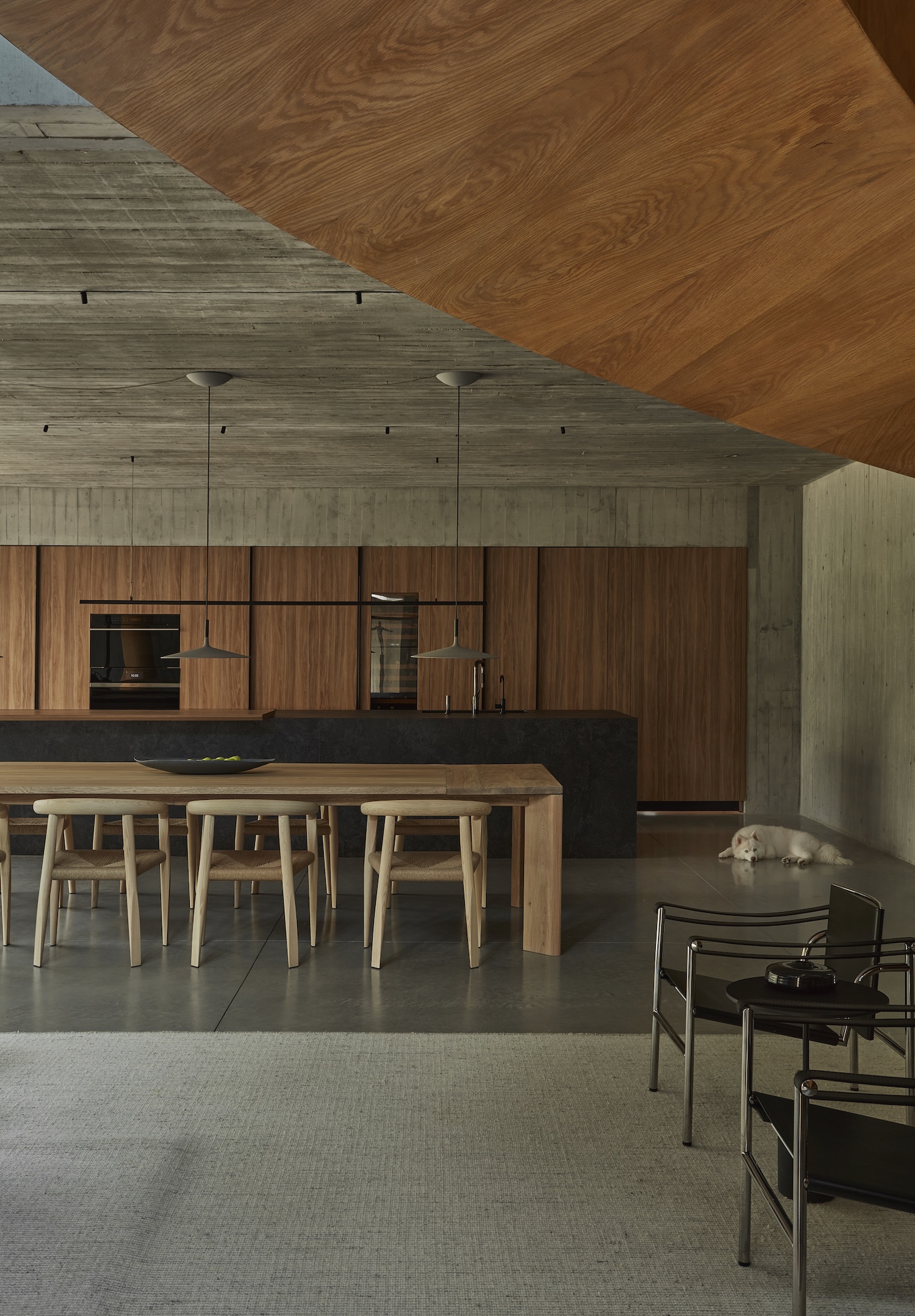 중앙 거실은 두 배 높이로 설계되어 주택 내에서 가장 넓고 개방된 공간을 제공합니다. 이 공간은 식당, 주방, 수영장, 그리고 야외 라운지와 유기적으로 연결되며, 실내와 외부 공간의 경계를 흐릿하게 만듭니다. V자 형태의 콘크리트 기둥은 구조적 안정성을 제공하며, 공간을 조화롭게 나누는 동시에 주택의 독창성을 강조합니다.