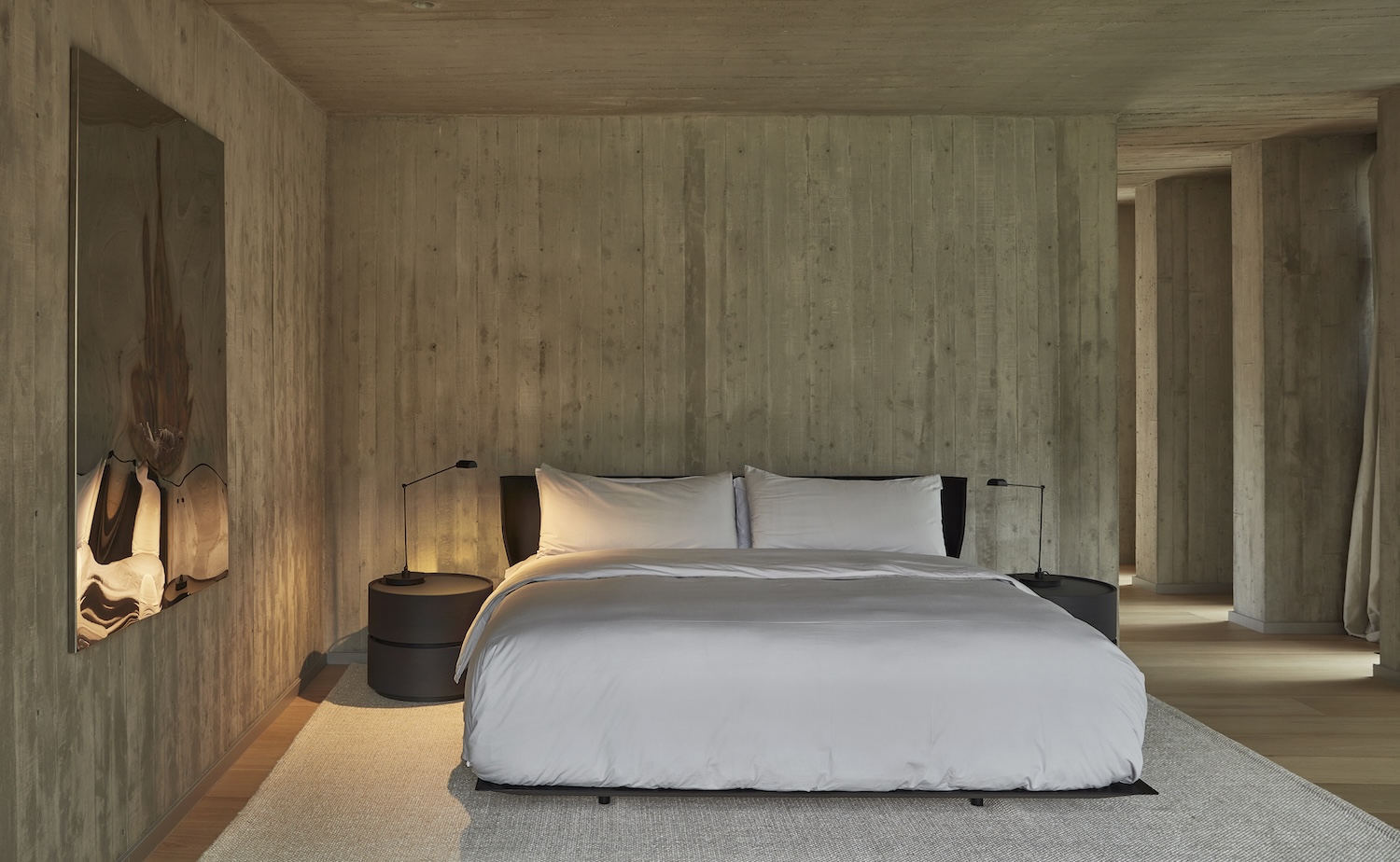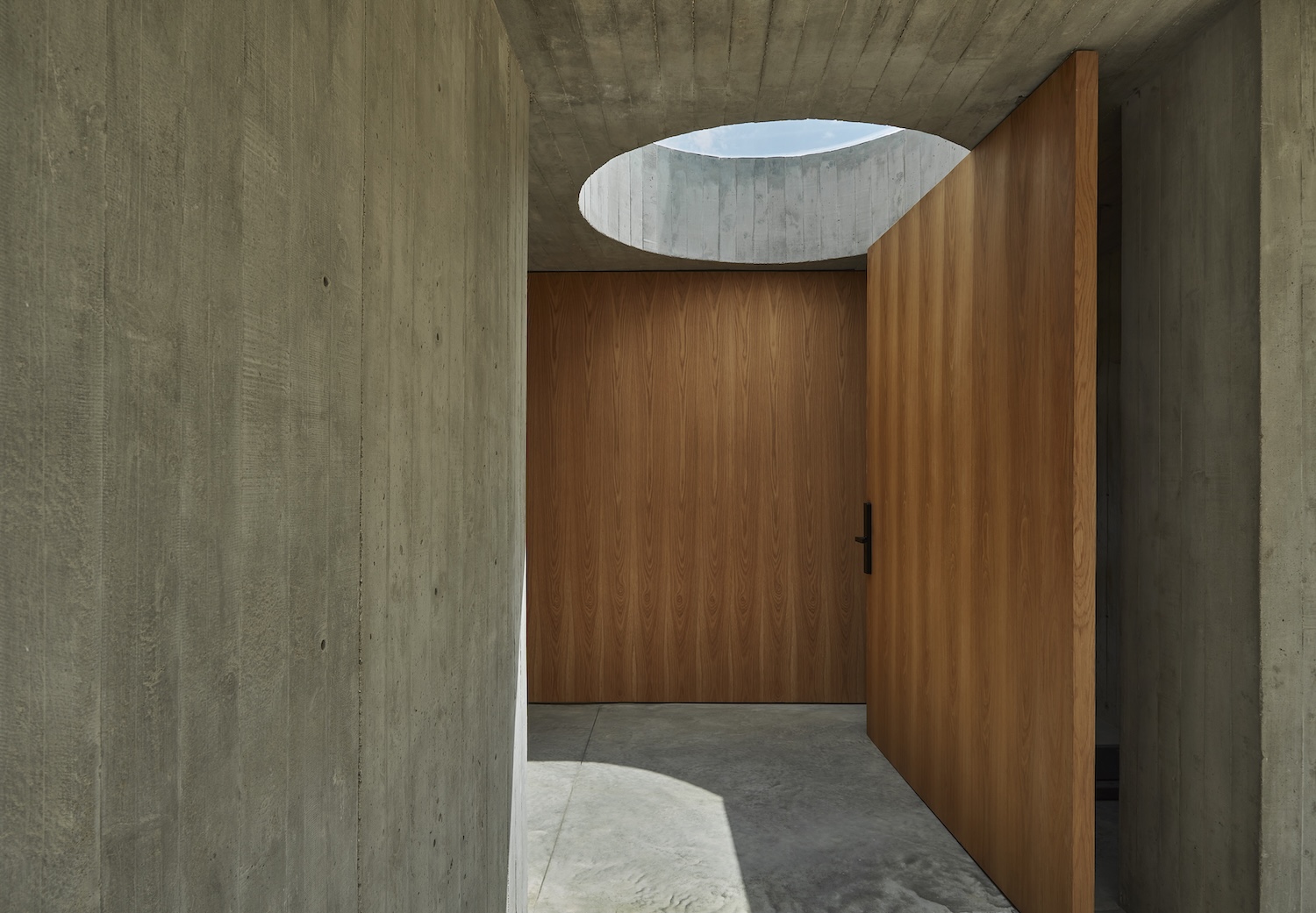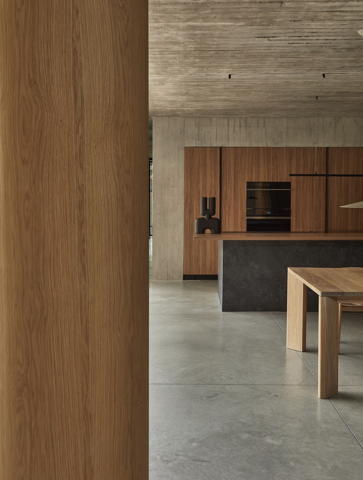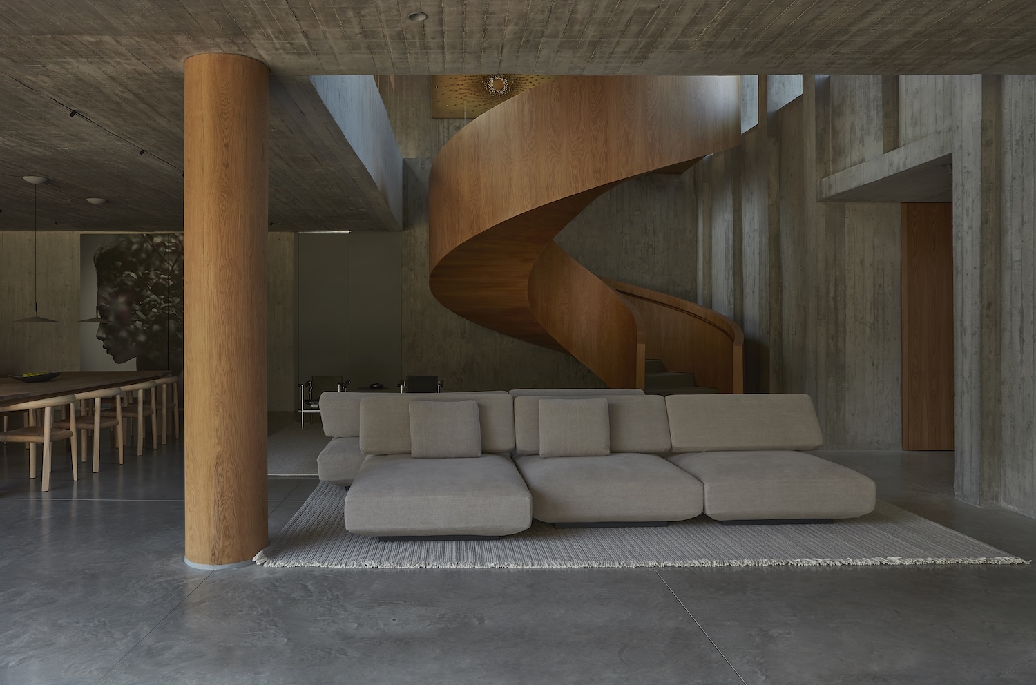 Casa Haras의 내부는 외부의 강렬한 인상과 대비되며, 따뜻하고 아늑한 분위기를 제공합니다. 집의 중심에는 나선형 계단이 위치하여 공간의 주요 시각적 초점이 되며, 상층과 하층을 자연스럽게 연결합니다. 이 계단은 오크 베니어로 마감되어 콘크리트의 차가움을 상쇄하며 공간에 따뜻함을 더합니다.