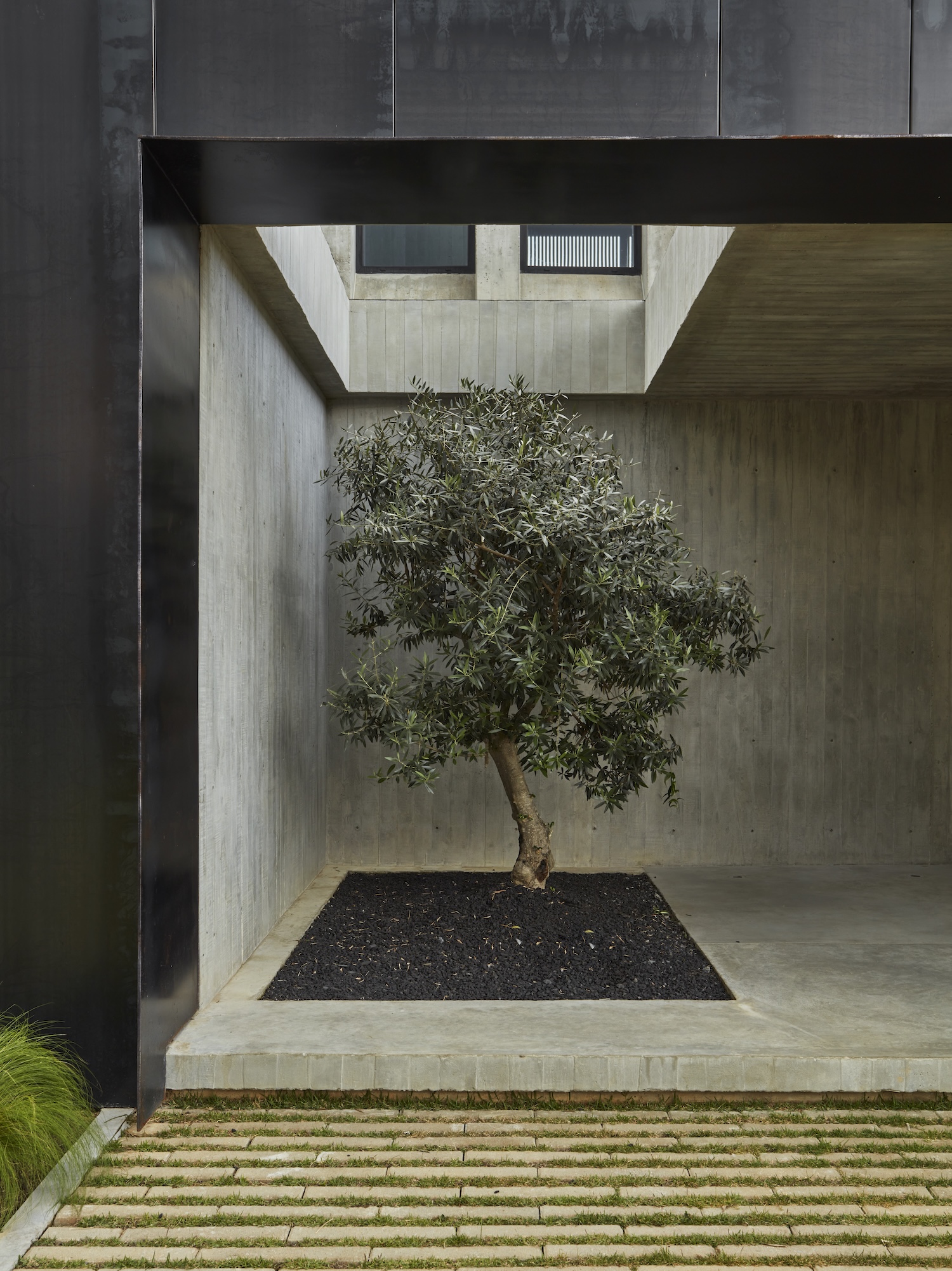 Casa Haras is a minimal home located in Rionegro, Colombia, designed by 5 Sólidos in collaboration with Studiokp2. The design was kept as clean as possible to ensure the materiality would not work against the overall concept, according to María José Fernández, co founder of Cinco Sólidos. At first glance, the geometry appears straightforward, but the interplay of dimensions and details reveals a thoughtful complexity. From above, two overlapping rectangular volumes create a symmetrical form where the roof is treated with the same importance as the façade. Considering the design from above helps avoid visual and finishing errors, leading to the use of natural river stones on the roofs to maintain consistency with the rest of the structure. Externally, the minimalist approach continues through the use of steel, aluminum, and vertically-clad concrete, enhancing privacy.