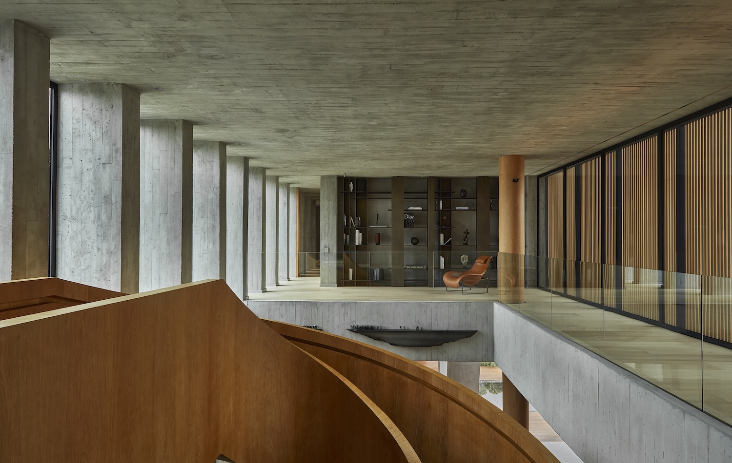 Yet, this solidity dissolves upon entering the home, where brutalist strength gives way to openness. The entrance features a spiral staircase, a supporting column, and concealed storage, all clad in American oak veneer, softening the concrete and adding warmth. This balance of texture is reinforced by furniture curated by Studiokp2 and Cinco Sólidos, complemented by cotton rugs and linen curtains. The heart of the home is a double height living area that connects seamlessly with the dining room, kitchen, pool, and outdoor lounge. A striking V-shaped concrete column anchors the space, plunging into the black Bali stone-tiled pool and supporting the upper wing. The structural elements are leveraged to define the identity of the house, according to Daniel Correa, co-founder of Cinco Sólidos.