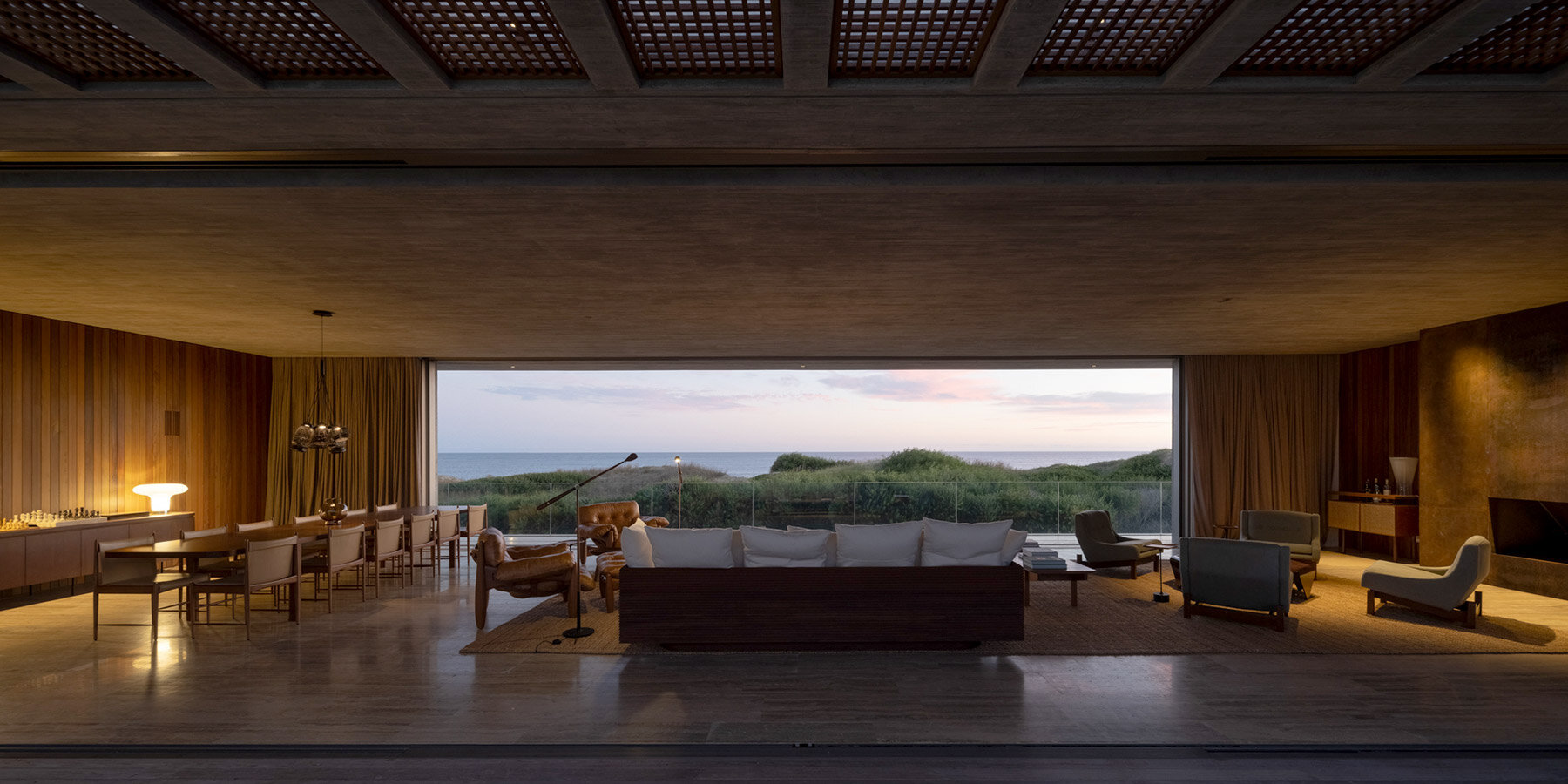 The vast site of Grimaldi – Nacht Arquitectos’ Casa La Secreta is defined by a three-meter high dune cordon facing the beach, shaping the design strategy. The house rises from the ground to create an expansive recreational space at the lower level. This area includes a grill, outdoor fireplace, and dining room, all surrounded by a stone garden that merges with the psammophilous — sand-resistant — forests. With this structure, the design team respect the terrain, merging architecture with nature to preserve the inherent beauty of the site.